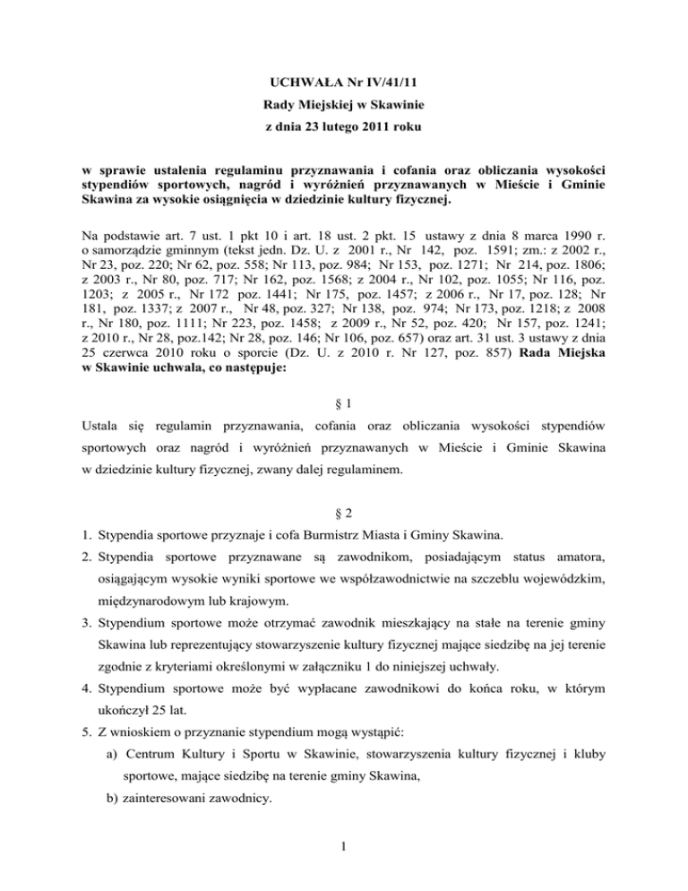 UCHWAŁA Nr IV/41/11 Rady Miejskiej w Skawinie z dnia 23 lutego 2011 roku w sprawie ustalenia regulaminu przyznawania i cofania oraz obliczania wysokości stypendiów sportowych, nagród i wyróżnień przyznawanych w Mieście i Gminie Skawina za wysokie osiągnięcia w dziedzinie kultury fizycznej. Na podstawie art. 7 ust. 1 pkt 10 i art. 18 ust. 2 pkt. 15 ustawy z dnia 8 marca 1990 r. o samorządzie gminnym (tekst jedn. Dz. U. z 2001 r., Nr 142, poz. 1591; zm.: z 2002 r., Nr 23, poz. 220; Nr 62, poz. 558; Nr 113, poz. 984; Nr 153, poz. 1271; Nr 214, poz. 1806; z 2003 r., Nr 80, poz. 717; Nr 162, poz. 1568; z 2004 r., Nr 102, poz. 1055; Nr 116, poz. 1203; z 2005 r., Nr 172 poz. 1441; Nr 175, poz. 1457; z 2006 r., Nr 17, poz. 128; Nr 181, poz. 1337; z 2007 r., Nr 48, poz. 327; Nr 138, poz. 974; Nr 173, poz. 1218; z 2008 r., Nr 180, poz. 1111; Nr 223, poz. 1458; z 2009 r., Nr 52, poz. 420; Nr 157, poz. 1241; z 2010 r., Nr 28, poz.142; Nr 28, poz. 146; Nr 106, poz. 657) oraz art. 31 ust. 3 ustawy z dnia 25 czerwca 2010 roku o sporcie (Dz. U. z 2010 r. Nr 127, poz. 857) Rada Miejska w Skawinie uchwala, co następuje: §1 Ustala się regulamin przyznawania, cofania oraz obliczania wysokości stypendiów sportowych oraz nagród i wyróżnień przyznawanych w Mieście i Gminie Skawina w dziedzinie kultury fizycznej, zwany dalej regulaminem. §2 1. Stypendia sportowe przyznaje i cofa Burmistrz Miasta i Gminy Skawina. 2. Stypendia sportowe przyznawane są zawodnikom, posiadającym status amatora, osiągającym wysokie wyniki sportowe we współzawodnictwie na szczeblu wojewódzkim, międzynarodowym lub krajowym. 3. Stypendium sportowe może otrzymać zawodnik mieszkający na stałe na terenie gminy Skawina lub reprezentujący stowarzyszenie kultury fizycznej mające siedzibę na jej terenie zgodnie z kryteriami określonymi w załączniku 1 do niniejszej uchwały. 4. Stypendium sportowe może być wypłacane zawodnikowi do końca roku, w którym ukończył 25 lat. 5. Z wnioskiem o przyznanie stypendium mogą wystąpić: a) Centrum Kultury i Sportu w Skawinie, stowarzyszenia kultury fizycznej i kluby sportowe, mające siedzibę na terenie gminy Skawina, b) zainteresowani zawodnicy. 1 6. Wniosek o przyznanie stypendium powinien zawierać: a) dane osobowe zawodnika, b) dokument potwierdzający przynależność zawodnika do danego stowarzyszenia kultury fizycznej lub klubu sportowego, c) opis osiągnięć sportowych zawodnika, d) dokumenty potwierdzające opisane osiągnięcia. 7. Wnioski o przyznanie stypendium sportowego za dany rok kalendarzowy należy składać do dnia 28 lutego roku następnego w Urzędzie Miasta i Gminy w Skawinie. 8. Wnioski o przyznanie stypendium rozpatruje powołana przez Burmistrza Miasta i Gminy Skawina komisja w składzie: a) burmistrz lub zastępca burmistrza, b) przedstawiciel komórki organizacyjnej Urzędu Miasta właściwej do spraw kultury fizycznej, c) Przewodniczący lub zastępca przewodniczącego Rady Miejskiej, d) Dwóch przedstawicieli komisji Rady Miejskiej właściwej ds. sportu, e) Przedstawiciel Centrum Kultury i Sportu w Skawinie. 9. Podstawą obliczenia stypendium jest aktualnie obowiązujące minimalne wynagrodzenie za pracę ustalone zgodnie z ustawą z dnia 10.10.2002 r. o minimalnym wynagrodzeniu za pracę. 10. Wysokość stypendium sportowego określona została w załączniku nr 1 do niniejszej uchwały. 11. Stypendium może być przyznane na okres 1 roku i wypłacane jest w okresach miesięcznych. 12. Zawodnikowi cofa się stypendium sportowe w sytuacji gdy: a) został zawieszony w prawach zawodnika, b) utracił status amatora, c) utracił prawo do stypendium ze względu na zmianę miejsca zamieszkania lub zmianę klubu (stowarzyszenia) na klub (stowarzyszenie) działające poza granicami gminy Skawina. §3 1. Nagrody i wyróżnienia w dziedzinie kultury fizycznej przyznaje, biorąc pod uwagę osiągnięty wynik sportowy oraz znaczenie danego sportu dla gminy Skawina, Burmistrz Miasta i Gminy Skawina. 2 2. Nagrody i wyróżnienia przyznawane są w formie pieniężnej za osiągnięcia w danym roku kalendarzowym. 3. Nagrody przyznawane są za osiągnięcia indywidualne, zespołowe zawodnikom którzy nie są objęci systemem stypendialnym, trenerom, instruktorom, działaczom stowarzyszeń kultury fizycznej i klubów sportowych z siedzibą w gminie Skawina oraz niezrzeszonym zawodnikom, którzy nie są objęci systemem stypendialnym, zamieszkałym w gminie Skawina. 4. Z wnioskiem o przyznanie nagród i wyróżnień mogą wystąpić: a) Centrum Kultury i Sportu w Skawinie, stowarzyszenia kultury fizycznej i kluby sportowe, mające siedzibę na terenie gminy Skawina, b) zainteresowani zawodnicy. 5. Wniosek o przyznanie nagród i wyróżnień powinien zawierać: a) dane osobowe zawodnika (lub działacza/trenera sportowego), b) dokument potwierdzający przynależność zawodnika do danego stowarzyszenia kultury fizycznej lub klubu sportowego ( lub działacza/trenera sportowego) c) opis osiągnięć sportowych zawodnika, d) dokumenty potwierdzające opisane osiągnięcia. 6. Wnioski o przyznanie nagród i wyróżnień za dany rok kalendarzowy należy składać do dnia 28 lutego roku następnego w Urzędzie Miasta i Gminy w Skawinie. 7. O przyznaniu nagród i wyróżnień decyduje komisja, o której mowa w §2 ust. 8 zgodnie z zasadami określonymi w załączniku 1 do niniejszej uchwały. §4 Wykonanie uchwały powierza się Burmistrzowi Miasta i Gminy Skawina. §5 Uchwała wchodzi w życie po 14 dniach od jej ogłoszenia w Dzienniku Urzędowym Województwa Małopolskiego. Przewodniczący Rady Miejskiej mgr Norbert RZEPISKO 3