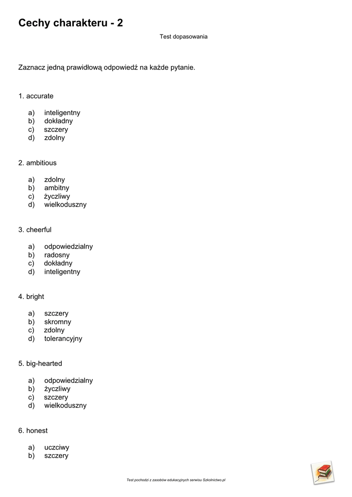 Cechy charakteru - 2 Test dopasowania Zaznacz jedną prawidłową odpowiedź na każde pytanie. 1. accurate a) b) c) d) inteligentny dokładny szczery zdolny 2. ambitious a) b) c) d) zdolny ambitny życzliwy wielkoduszny 3. cheerful a) b) c) d) odpowiedzialny radosny dokładny inteligentny 4. bright a) b) c) d) szczery skromny zdolny tolerancyjny 5. big-hearted a) b) c) d) odpowiedzialny życzliwy szczery wielkoduszny 6. honest a) b) uczciwy szczery Test pochodzi z zasobów edukacyjnych serwisu Szkolnictwo.pl c) d) odpowiedzialny ambitny 7. responsible a) b) c) d) odpowiedzialny inteligentny tolerancyjny szczery 8. tolerant a) b) c) d) tolerancyjny inteligentny uczciwy szczery 9. modest a) b) c) d) dokładny skromny wielkoduszny inteligentny 10. honest a) b) c) d) cierpliwy taktowny radosny szczery 11. intelligent a) b) c) d) tolerancyjny radosny inteligentny zdolny 12. kind-hearted a) b) c) d) odpowiedzialny ambitny taktowny życzliwy 13. eloquent Test pochodzi z zasobów edukacyjnych serwisu Szkolnictwo.pl a) b) c) d) uczciwy elokwentny dokładny życzliwy 14. patient a) b) c) d) skromny elokwentny ambitny cierpliwy 15. tactful a) b) c) d) zdolny taktowny skromny inteligentny Test pochodzi z zasobów edukacyjnych serwisu Szkolnictwo.pl