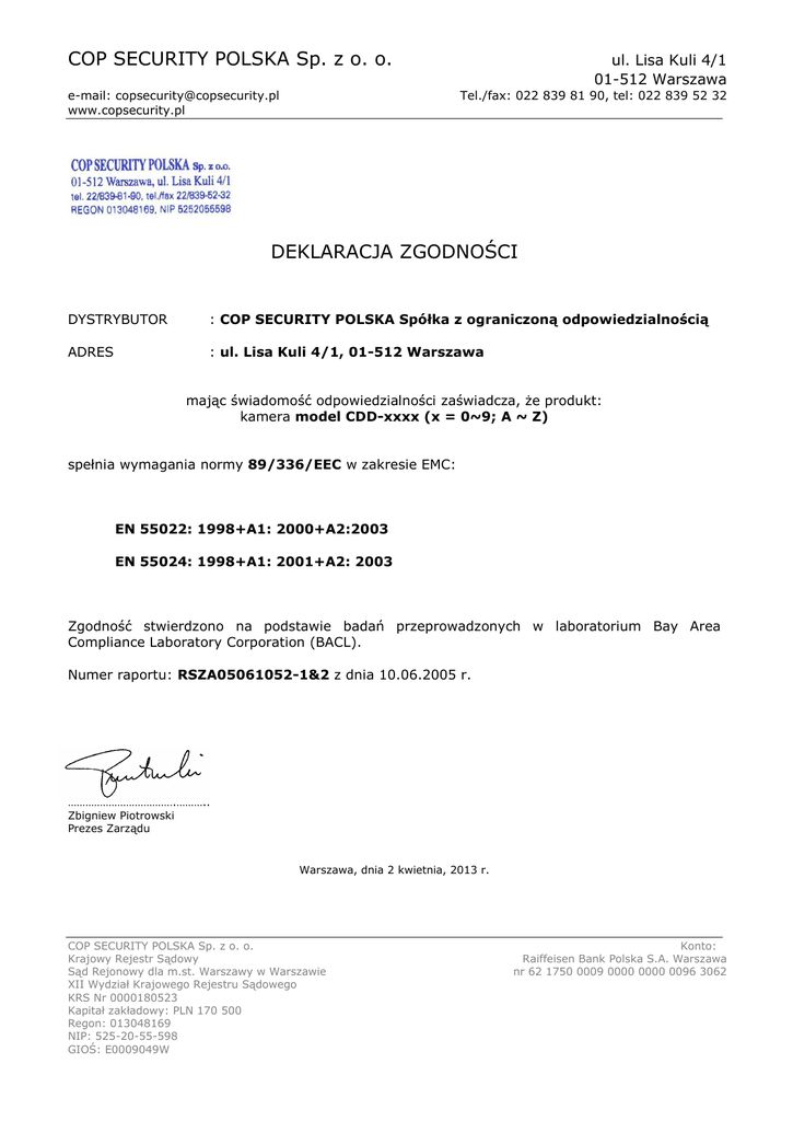 COP SECURITY POLSKA Sp. z o. o. e-mail: [email protected] www.copsecurity.pl ul. Lisa Kuli 4/1 01-512 Warszawa Tel./fax: 022 839 81 90, tel: 022 839 52 32 DEKLARACJA ZGODNOŚCI DYSTRYBUTOR : COP SECURITY POLSKA Spółka z ograniczoną odpowiedzialnością ADRES : ul. Lisa Kuli 4/1, 01-512 Warszawa mając świadomość odpowiedzialności zaświadcza, że produkt: kamera model CDD-xxxx (x = 0~9; A ~ Z) spełnia wymagania normy 89/336/EEC w zakresie EMC: EN 55022: 1998+A1: 2000+A2:2003 EN 55024: 1998+A1: 2001+A2: 2003 Zgodność stwierdzono na podstawie badań przeprowadzonych w laboratorium Bay Area Compliance Laboratory Corporation (BACL). Numer raportu: RSZA05061052-1&2 z dnia 10.06.2005 r. ……………………………….……….. Zbigniew Piotrowski Prezes Zarządu Warszawa, dnia 2 kwietnia, 2013 r. COP SECURITY POLSKA Sp. z o. o. Krajowy Rejestr Sądowy Sąd Rejonowy dla m.st. Warszawy w Warszawie XII Wydział Krajowego Rejestru Sądowego KRS Nr 0000180523 Kapitał zakładowy: PLN 170 500 Regon: 013048169 NIP: 525-20-55-598 GIOŚ: E0009049W Konto: Raiffeisen Bank Polska S.A. Warszawa nr 62 1750 0009 0000 0000 0096 3062