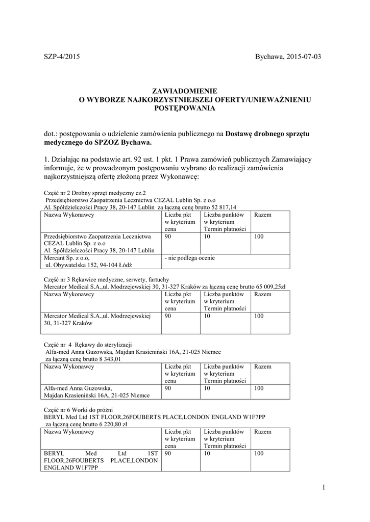 SZP-4/2015 Bychawa, 2015-07-03 ZAWIADOMIENIE O WYBORZE NAJKORZYSTNIEJSZEJ OFERTY/UNIEWAŻNIENIU POSTĘPOWANIA dot.: postępowania o udzielenie zamówienia publicznego na Dostawę drobnego sprzętu medycznego do SPZOZ Bychawa. 1. Działając na podstawie art. 92 ust. 1 pkt. 1 Prawa zamówień publicznych Zamawiający informuje, że w prowadzonym postępowaniu wybrano do realizacji zamówienia najkorzystniejszą ofertę złożoną przez Wykonawcę: Część nr 2 Drobny sprzęt medyczny cz.2 Przedsiębiorstwo Zaopatrzenia Lecznictwa CEZAL Lublin Sp. z o.o Al. Spółdzielczości Pracy 38, 20-147 Lublin za łączną cenę brutto 52 817,14 Nazwa Wykonawcy Liczba pkt Liczba punktów w kryterium w kryterium cena Termin płatności Przedsiębiorstwo Zaopatrzenia Lecznictwa 90 10 CEZAL Lublin Sp. z o.o Al. Spółdzielczości Pracy 38, 20-147 Lublin Mercant Sp. z o.o, - nie podlega ocenie ul. Obywatelska 152, 94-104 Łódź Razem 100 Część nr 3 Rękawice medyczne, serwety, fartuchy Mercator Medical S.A.,ul. Modrzejewskiej 30, 31-327 Kraków za łączną cenę brutto 65 009,25zł Nazwa Wykonawcy Liczba pkt Liczba punktów Razem w kryterium w kryterium cena Termin płatności Mercator Medical S.A.,ul. Modrzejewskiej 90 10 100 30, 31-327 Kraków Część nr 4 Rękawy do sterylizacji Alfa-med Anna Guzowska, Majdan Krasieniński 16A, 21-025 Niemce za łączną cenę brutto 8 343,01 Nazwa Wykonawcy Liczba pkt Liczba punktów w kryterium w kryterium cena Termin płatności Alfa-med Anna Guzowska, 90 10 Majdan Krasieniński 16A, 21-025 Niemce Razem 100 Część nr 6 Worki do próżni BERYL Med Ltd 1ST FLOOR,26FOUBERTS PLACE,LONDON ENGLAND W1F7PP za łączną cenę brutto 6 220,80 zł Nazwa Wykonawcy Liczba pkt Liczba punktów Razem w kryterium w kryterium cena Termin płatności BERYL Med Ltd 1ST 90 10 100 FLOOR,26FOUBERTS PLACE,LONDON ENGLAND W1F7PP 1 Część nr 8 Worki higieniczne ELMIKO MEDICAL SP. Z O.O, ul. Poleczki 29, 02-822 Warszawa za łączną cenę brutto1 838,70 Nazwa Wykonawcy Liczba pkt Liczba punktów Razem w kryterium w kryterium cena Termin płatności ELMIKO MEDICAL SP. Z O.O, ul. Poleczki 90 10 100 29, 02-822 Warszawa Zamawiający informuje o odrzuceniu następujących ofert: 1. Bialmed Sp. z o.o ul. Konopnickiej 11 a ,12-230 Biała Piska w zakresie Części nr 1 na podstawie art. 89 ust. 1 pkt 2 ustawy Pzp, przedmiot oferty nie odpowiada treści specyfikacji istotnych warunków zamówienia. Wykonawca w formularzu cenowym w pozycji nr 52 przedłużacz do cewnika do podawania tlenu 1,5m-3m zaoferował ilość 100 szt a Zamawiający wymagał 50 szt. 2. Przedsiębiorstwo Handlowo- Usługowe ANMAR Spółka z o.o Sp. K., ul. Bławatków 6, 43-100 Tychy zakresie Części nr 1 na podstawie art. 89 ust. 1 pkt 2 ustawy Pzp, przedmiot oferty nie odpowiada treści specyfikacji istotnych warunków zamówienia. Wykonawca w formularzu cenowym w pozycji nr 14 Igła z automatycznym szlifem i skrzydełkami 22G x 15 mm- 20 szt. zaoferował ilość 400 op. a Zamawiający wymagał 1 op., oraz w pozycji 54 Prześcieradło papierowe w roli białe 60 cm x 100 Wykonawca zaoferował 1250 szt , a Zamawiający wymagał 1000 szt. 3.Mercant sp. z o.o ul. Obywatelska 152, 94-104 Łódź w Części nr 2 na podstawie art. 89 ust. 1 pkt 2 ustawy Pzp, przedmiot oferty nie odpowiada treści specyfikacji istotnych warunków zamówienia – Wykonawca w wyznaczonym terminie tj. 03.07.2015r. godz. 12.00 nie uzupełnił dokumentów potwierdzających , że oferowane dostawy, odpowiadają wymaganiom określonym przez Zmawiającego tj. aktualne informacje, katalogi, foldery zawierające dokładną charakterystykę (opis) przedmiotu zamówienia wraz z zaznaczeniem której pozycji dotyczą. Zamawiający informuje o unieważnieniu postępowania w Części nr 1, Części nr 5, Części nr 7 na podstawie art. 93 ust. 1 pkt 1 ustawy Pzp z uwagi na fakt, iż nie złożono żadnej oferty niepodlegającej odrzuceniu. Na podstawie art. 92 ust. 1 ppk.4 ustawy Pzp informujemy iż, umowa w sprawie zamówienia publicznego zostanie zawarta dotyczy, części 4, części 6, nie wcześniej niż po dniu 06.07.2015r., część nr 2 , część nr 3, część nr 8 nie wcześniej niż po dniu 14.07.2015r., Dziękujemy za udział w postępowaniu. 2