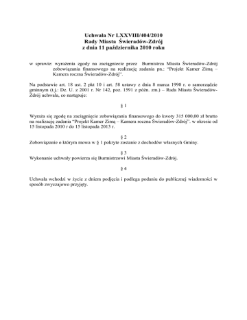 Uchwała Nr LXXVIII/404/2010 Rady Miasta Świeradów-Zdrój z dnia 11 października 2010 roku w sprawie: wyrażenia zgody na zaciągniecie przez Burmistrza Miasta Świeradów-Zdrój zobowiązania finansowego na realizację zadania pn.: “Projekt Kamer Zimą – Kamera roczna Świeradów-Zdrój”. Na podstawie art. 18 ust. 2 pkt 10 i art. 58 ustawy z dnia 8 marca 1990 r. o samorządzie gminnym (t.j.: Dz. U. z 2001 r. Nr 142, poz. 1591 z późn. zm.) – Rada Miasta ŚwieradówZdrój uchwala, co następuje: §1 Wyraża się zgodę na zaciągnięcie zobowiązania finansowego do kwoty 315 000,00 zł brutto na realizację zadania “Projekt Kamer Zimą – Kamera roczna Świeradów-Zdrój”. w okresie od 15 listopada 2010 r do 15 listopada 2013 r. §2 Zobowiązanie o którym mowa w § 1 pokryte zostanie z dochodów własnych Gminy. §3 Wykonanie uchwały powierza się Burmistrzowi Miasta Świeradów-Zdrój. §4 Uchwała wchodzi w życie z dniem podjęcia i podlega podaniu do publicznej wiadomości w sposób zwyczajowo przyjęty. Uzasadnienie Gmina Miejska Świeradów-Zdrój planuje w bieżącym roku rozpocząć projekt pn.: “Projekt Kamer Zimą – Kamera roczna Świeradów-Zdrój”. Jest to akcja promocyjna, prowadzona przez Grupę TVN, a polegająca na: − zainstalowaniu na terenie Gminy kamery internetowej pokazującej na bieżąco obraz z Gminy – prognoza pogody TVN 24 i TVN Meteo (gwarantowane 2 wejścia dziennie z regionu) − świadczenia sponsorskie (sponsoring prognozy pogody): TVN 24 prognoza pogody – 100 billboardów (50 przed i 50 po); TVN Meteo prognoza pogody dla Polski – 400 billboardów (200 przed i 200 po) – przy założeniu, że kontrakt (umowa) zostanie zawarta na 3 lata. Przedsięwzięcie będzie realizowane wraz ze spółką Sobiesław Zasada Sp. z o.o., na terenie której zlokalizowana zostanie kamera. Koszt przedsięwzięcia to kwota 180 000,00 zł netto rocznie. Planowany początek realizacji zadania to 15 grudnia 2010 r.