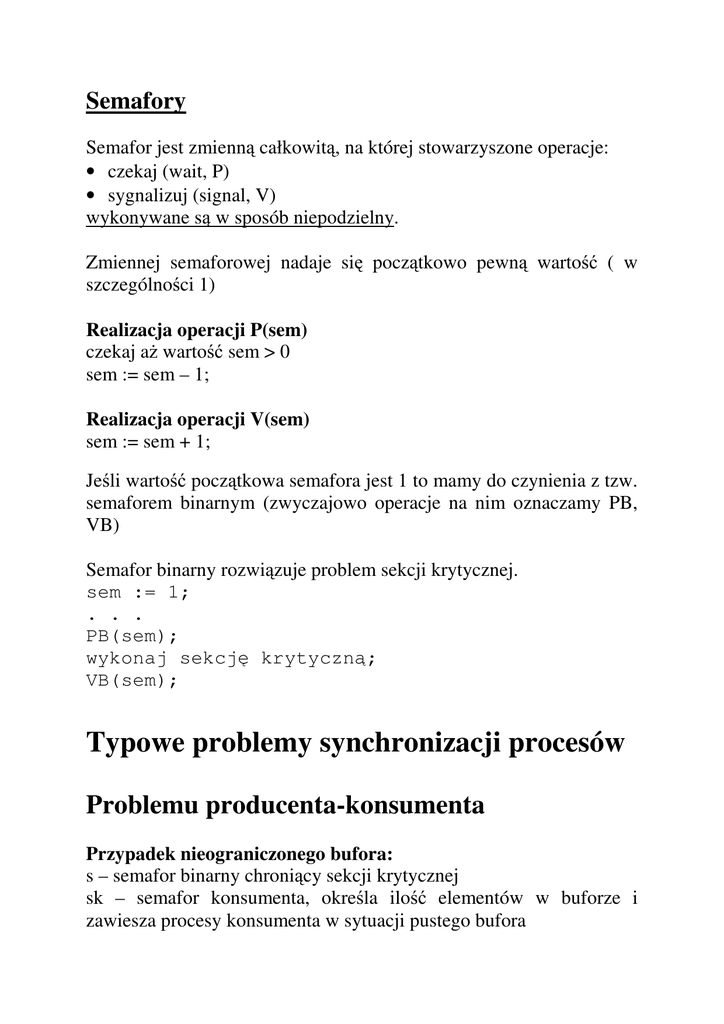 Semafory Semafor jest zmienną całkowitą, na której stowarzyszone operacje: • czekaj (wait, P) • sygnalizuj (signal, V) wykonywane są w sposób niepodzielny. Zmiennej semaforowej nadaje się początkowo pewną wartość ( w szczególności 1) Realizacja operacji P(sem) czekaj aż wartość sem > 0 sem := sem – 1; Realizacja operacji V(sem) sem := sem + 1; Jeśli wartość początkowa semafora jest 1 to mamy do czynienia z tzw. semaforem binarnym (zwyczajowo operacje na nim oznaczamy PB, VB) Semafor binarny rozwiązuje problem sekcji krytycznej. sem := 1; . . . PB(sem); wykonaj sekcję krytyczną; VB(sem); Typowe problemy synchronizacji procesów Problemu producenta-konsumenta Przypadek nieograniczonego bufora: s – semafor binarny chroniący sekcji krytycznej sk – semafor konsumenta, określa ilość elementów w buforze i zawiesza procesy konsumenta w sytuacji pustego bufora s = 1; sk = 0 Producent while true do produkuj; PB(s); dodaj do bufora; V(sk) VB(sk); Konsument while true do P(sk); PB(s) odczytaj z bufora; VB(s); konsumuj; Przypadek ograniczonego bufora: sp – semafor producenta, określa ilość wolnych pozycji w buforze i zawiesza procesy producenta w sytuacji pełnego bufora sp := n; Producent while true do produkuj; P(sp); PB(s); dodaj do bufora; V(sk) VB(sk); Konsument while true do P(sk); PB(s) odczytaj z bufora; V(sp); VB(s); konsumuj;