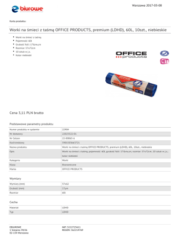Warszawa 2017-03-08 Karta produktu: Worki na śmieci z taśmą OFFICE PRODUCTS, premium (LDHD), 60L, 10szt., niebieskie Worki na śmieci z taśmą Pojemność: 60l Grubość folii: 17μm Rozmiar: 57x72cm 10 sztuk w j.s. Kolor niebieski Cena 3,11 PLN brutto Podstawowe parametry produktu Numer produktu w systemie 22904 Nr dostawcy 22023322-01 Nr Celcen 22-00065-6 Kod kreskowy 5901503663721 Nazwa produktu Worki na śmieci z taśmą OFFICE PRODUCTS, premium (LDHD), 60L, 10szt., niebieskie Opis Worki na śmieci z taśmą; pojemność: 60l; grubość folii: 17μm; rozmiar: 57x72cm; 10 sztuk w j.s.; kolor niebieski Kategoria Worki Klasa Ekonomiczne Marka OFFICE PRODUCTS Wymiary Wymiary (mm) 57x62 Grubość (mm) 17µm Rozmiar 60l Cecha Materiał LDHD Typ LDHD EBIUROWE 1 Sierpnia 39/26 02-134 Warszawa NIP: 5222725611 REGON: 362214769 Warszawa 2017-03-08 Karta katalogowa produktu cd. Worki na śmieci z taśmą OFFICE PRODUCTS, premium (LDHD), 60L, 10szt., niebieskie W ofercie od 2014-12 Produkt Worek na śmieci z taśmą Rodzaj 60L/10 Wspólny słownik zamówień CPV 39220000-0 Sprzęt kuchenny, artykuły gospodarstwa domowego i artykuły domowe oraz artykuły cateringowe Certyfikaty Nowy produkt w ofercie Standard Hit Standard Kolor Kolor Niebieski Serdecznie zapraszamy do współpracy EBIUROWE zespół. EBIUROWE 1 Sierpnia 39/26 02-134 Warszawa NIP: 5222725611 REGON: 362214769