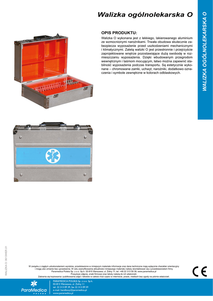 OPIS PRODUKTU: WALIZKA O: 0613WER.01 Walizka O wykonana jest z lekkiego, lakierowanego aluminium ze wzmocnionymi narożnikami. Trwała obudowa skutecznie zabezpiecza wyposażenie przed uszkodzeniami mechanicznymi i klimatycznymi. Zaletą walizki O jest przestronnie i przejrzyście zaprojektowane wnętrze pozostawiające dużą swobodę w rozmieszczaniu wyposażenia. Dzięki wbudowanym przegrodom wewnętrznym i taśmom mocującym, łatwo można zapewnić stabilność wyposażenia podczas transportu. Są estetycznie wykonane – chromowane zamki, uchwyt, narożniki, dodatkowo oznaczenia i symbole zewnętrzne w kolorach odblaskowych. W związku z ciągłym udoskonalaniem wyrobów, przedstawione w niniejszym materiale informacje oraz dane techniczne mają wyłącznie charakter orientacyjny i mogą ulec zmianie bez uprzedzenia. W celu zweryfikowania aktualności niniejszego materiału należy skontaktować się z przedstawicielem firmy Paramedica Polska Sp. z o.o. Sp.k. 02-815 Warszawa; ul. Żołny 11; tel: +48 22 313 09 39; www.paramedica.pl Powyższe zdjęcia, znaki firmowe oraz teksty należą do ich właścicieli. Zabrania się kopiowania i publikowania zdjęć i tekstów w całości i/lub części w internecie, prasie, mediach bez zgody na piśmie właścicieli. PARAMEDICA POLSKA Sp. z o.o. Sp.k. 02-815 Warszawa, ul. Żołny 11 tel. 22 313 09 39, fax 22 313 09 59 e-mail: [email protected] www.paramedica.pl WALIZKA OGÓLNOLEKARSKA O Walizka ogólnolekarska O