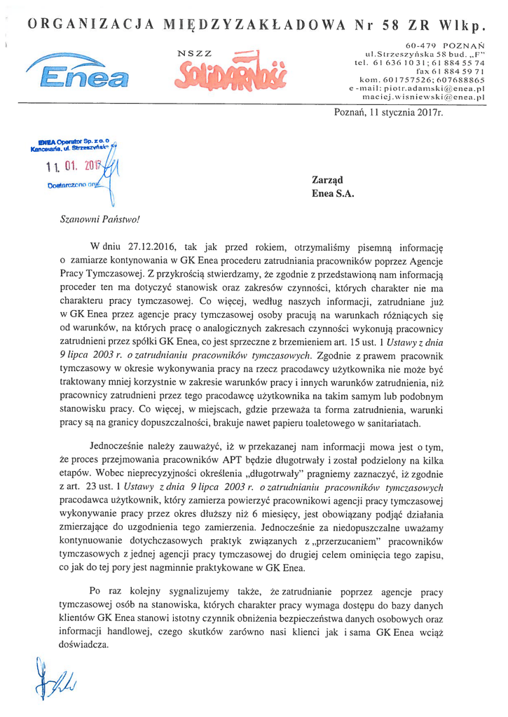 ORGANIZACJA MIĘDZYZAKŁADOWA Nr 58 ZR WIkp. 60-479 POZNAŃ uI.StFzeszyńsk;t 58 bud.,F tel. 61636 1031;61 $845574 tax6l $84 5971 kom. 601757526; 607688865 e—mail: piott.ac1;niski@eneapl m a c i ej w i Sfl C W s k i e n e a. p 1 N SZZ 7 F . Poznań, 11 stycznia 2017r. wfAOpe° sp. z o.o KncetWśa. ul 11. OL ogtRrCZoflO in_ Zarząd Enea S.A. Szanowni Państwo! W dniu 27.12.2016, tak jak przed rokiem, otrzymaliśmy pisemną informację o zamiarze kontynowania w GK Enea procederu zatrudniania pracowników poprzez Agencje Pracy Tymczasowej. Z przykrością stwierdzamy, że zgodnie z przedstawioną nam informacją proceder ten ma dotyczyć stanowisk oraz zakresów czynności, których charakter nie ma charakteru pracy tymczasowej. Co więcej, według naszych informacji, zatrudniane już w OK Enea przez agencje pracy tymczasowej osoby pracują na warunkach różniących się od warunków, na których pracę o analogicznych zakresach czynności wykonują pracownicy zatrudnieni przez spółki GK Enea, co jest sprzeczne z brzemieniem art. 15 ust. 1 Ustawy z dnia 9 lipca 2003 r. O zatrudnianiu pracołt”ników tymczasowych. Zgodnie z prawem pracownik tymczasowy w okresie wykonywania pracy na rzecz pracodawcy użytkownika nie może być traktowany mniej korzystnie w zakresie warunków pracy i innych warunków zatrudnienia, niż pracownicy zatrudnieni przez tego pracodawcę użytkownika na takim samym lub podobnym stanowisku pracy. Co więcej, w miejscach, gdzie przeważa ta forma zatrudnienia, warunki pracy są na granicy dopuszczalności, brakuje nawet papieru toaletowego w sanitariatach. Jednocześnie należy zauważyć, iż w przekazanej nam informacji mowa jest o tym, że proces przejmowania pracowników APT będzie długotrwały i został podzielony na kilka etapów. Wobec nieprecyzyjności określenia „długotrwały” pragniemy zaznaczyć, iż zgodnie z art. 23 ust. 1 Ustawy z dnia 9 lipca 2003 r. o zatrudnianiu pracowników tyinczasowch pracodawca użytkownik, który zamierza powierzyć pracownikowi agencji pracy tymczasowej wykonywanie pracy przez okres dłuższy niż 6 miesięcy, jest obowiązany podjąć działania zmierzające do uzgodnienia tego zamierzenia. Jednocześnie za niedopuszczalne uważamy kontynuowanie dotychczasowych praktyk związanych z „przerzucaniem” pracowników tymczasowych z jednej agencji pracy tymczasowej do drugiej celem ominięcia tego zapisu, co jak do tej pory jest nagminnie praktykowane w GK Enea. „ Po raz kolejny sygnalizujemy także, że zatrudnianie poprzez tymczasowej osób na stanowiska, których charakter pracy wymaga dostępu klientów OK Enea stanowi istotny czynnik obniżenia bezpieczeństwa danych informacji handlowej, czego skutków zarówno nasi klienci jak i sama doświadcza. agencje pracy do bazy danych osobowych oraz OK Enea wciąż W związku z powyższym wzywamy do poszanowania przepisów prawa oraz do chwili refleksji nad faktycznym bilansem korzyści i strat, jakie dla GK Enea jak i dla polskiej racji stanu niesie ze sobą kontynuowanie formy zatrudnienia tymczasowego na stanowiskach pracy nie noszących znamion pracy tymczasowej. Ponadto, zgodnie z art. 23 ust. 2 Ustawy z dnia 2003 r. 9 lipca o zatrudnianiu pracowników tymczasowych wnosimy o rozszerzenie przedstawionej nam informacji o liczbę pracowników tymczasowych oraz przewidywany czas, na jaki Enea S.A. oraz pozostałe spółki GK Enea bezpośrednio lub pośrednio mają zamiar ich zatrudniać jako pracodawcy użytkownicy. EFA Do wiadomości: Minister Energii Pan Krzysztof Tchórzewski Minister Rodziny, Pracy i Polityki Społecznej Pani Elżbieta Rafalska Rada Nadzorcza Enea S.A. — —