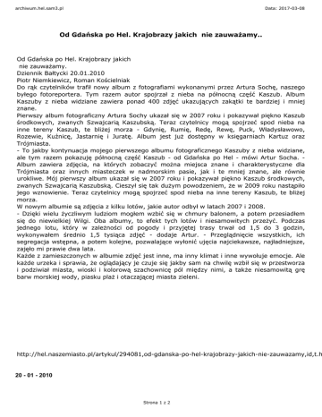 archiwum.hel.sam3.pl Data: 2017-03-08 Od Gdańska po Hel. Krajobrazy jakich nie zauważamy.. Od Gdańska po Hel. Krajobrazy jakich nie zauważamy. Dziennik Bałtycki 20.01.2010 Piotr Niemkiewicz, Roman Kościelniak Do rąk czytelników trafił nowy album z fotografiami wykonanymi przez Artura Sochę, naszego byłego fotoreportera. Tym razem autor spojrzał z nieba na północną część Kaszub. Album Kaszuby z nieba widziane zawiera ponad 400 zdjęć ukazujących zakątki te bardziej i mniej znane. Pierwszy album fotograficzny Artura Sochy ukazał się w 2007 roku i pokazywał piękno Kaszub środkowych, zwanych Szwajcarią Kaszubską. Teraz czytelnicy mogą spojrzeć spod nieba na inne tereny Kaszub, te bliżej morza - Gdynię, Rumię, Redę, Rewę, Puck, Władysławowo, Rozewie, Kuźnicę, Jastarnię i Juratę. Album jest już dostępny w księgarniach Kartuz oraz Trójmiasta. - To jakby kontynuacja mojego pierwszego albumu fotograficznego Kaszuby z nieba widziane, ale tym razem pokazuję północną część Kaszub - od Gdańska po Hel - mówi Artur Socha. Album zawiera zdjęcia, na których zobaczyć można miejsca znane i charakterystyczne dla Trójmiasta oraz innych miasteczek w nadmorskim pasie, jak i te mniej znane, ale równie urokliwe. Mój pierwszy album ukazał się w 2007 roku i pokazywał piękno Kaszub środkowych, zwanych Szwajcarią Kaszubską. Cieszył się tak dużym powodzeniem, że w 2009 roku nastąpiło jego wznowienie. Teraz czytelnicy mogą spojrzeć spod nieba na inne tereny Kaszub, te bliżej morza. W nowym albumie są zdjęcia z kilku lotów, jakie autor odbył w latach 2007 i 2008. - Dzięki wielu życzliwym ludziom mogłem wzbić się w chmury balonem, a potem przesiadłem się do niewielkiej Wilgi. Oba albumy, to efekt tych lotów i niesamowitych przeżyć. Podczas jednego lotu, który w zależności od pogody i przyjętej trasy trwał od 1,5 do 3 godzin, wykonywałem średnio 1,5 tysiąca zdjęć - dodaje Artur. - Przeglądnięcie wszystkich, ich segregacja wstępna, a potem kolejne, pozwalające wyłonić ujęcia najciekawsze, najładniejsze, zajęło mi prawie dwa lata. Każde z zamieszczonych w albumie zdjęć jest inne, ma inny klimat i inne wywołuje emocje. Ale każde urzeka i sprawia, że oglądający je czuje się jakby sam na chwilę wzbił się w przestworza i podziwiał miasta, wioski i kolorową szachownicę pól między nimi, a także niesamowitą grę barw morskiej wody, piasku plaż i otaczającej miasta zieleni. http://hel.naszemiasto.pl/artykul/294081,od-gdanska-po-hel-krajobrazy-jakich-nie-zauwazamy,id,t.h 20 - 01 - 2010 Strona 1 z 2 archiwum.hel.sam3.pl Data: 2017-03-08 Od Gdańska po Hel. Krajobrazy jakich nie zauważamy.. Agata Osiewa³a Miejski O¶rodek Pomocy Spo³ecznej w Helu Administrator Strona 2 z 2