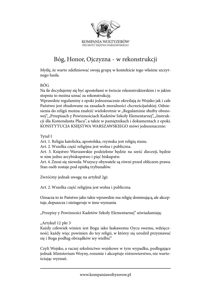 Bóg, Honor, Ojczyzna - w rekonstrukcji Myślę, że warto zdefiniować swoją grupę w kontekście tego właśnie szczytnego hasła. BÓG Na ile decydujemy się być apostołami w świecie rekonstruktorskim i w jakim stopniu to można uznać za rekonstrukcję. Wprawdzie regulaminy z epoki jednoznacznie określają że Wojsko jak i całe Państwo jest zbudowane na zasadach moralności chcrześcijańskiej. Odniesienia do religii można znaleźć wielokrotnie w „Regulaminie służby obozowej”, „Przepisach y Powinnościach Kadetów Szkoły Elementarnej”, „Instrukcji dla Komendanta Placu”, a także w pamiętnikach i dokumentach z epoki. KONSTYTUCJA KSIĘSTWA WARSZAWSKIEGO mówi jednoznacznie: Tytuł I Art. 1. Religia katolicka, apostolska, rzymska jest religią stanu. Art. 2. Wszelka część religijna jest wolna i publiczna. Art. 3. Księstwo Warszawskie podzielone będzie na sześć diecezji, będzie w nim jedno arcybiskupstwo i pięć biskupstw. Art. 4. Znosi się niewola. Wszyscy obywatele są równi przed obliczem prawa. Stan osób zostaje pod opieką trybunałów. Zwróćmy jednak uwagę na artykuł 2gi: Art. 2. Wszelka część religijna jest wolna i publiczna. Oznacza to że Państwo jako takie wprawdzie ma religię dominującą, ale akceptuje, dopuszcza i nieingeruje w inne wyznania „Przepisy y Powinności Kadetów Szkoły Elementarnej” uświadamiają: „Artykuł 12 pkt 3 Każdy człowiek winien iest Bogu iako łaskawemu Oycu swemu, wdzięczność; każdy więc powinien do tey religii, w którey się urodził przyznawać się i Boga podług obrządków iey wielbić” Czyli Wojsko, a raczej szkolnictwo wojskowe w tym wypadku, podlegające jednak Ministerium Woyny, rozumie i akceptuje różnowierstwo, nie wartościując wyznań. www.kompaniawoltyzerow.pl Możemy znaleźć w pamiętnikach dowody na teorie o przewadze katolicyzmu w wojsku jak i na swobodę wyznaniową, wszystko zależy o tego czyj pamiętnik czytamy. Czyli jest normalnie... tak jak i dziś. Mamy wierzących i niewierzących, katolików i protestantów, prawosławnych i mahometan. Wniosek nasuwa się taki: Po co silić się na odtwarzanie religijności, skoro ona jest tak jak była. Jest wartością pozarekonstrukcyjną, a przede wszystkim prywatną. Jestem zdania że można stosować się do przepisów regulujących zachowanie wobec Sakramentu i innych fragmentów regulaminu jednoznacznie wskazujących sposób zachowania żołnierzy wobec obrzędowości, bo to właśnie jest rekonstrukcja. np.: „Nayświętszemu Sakramentowi – gdy nayświętszy Sakrament przechodzić będzie mimo warty lub inney iakiey straży, ta stanie pod bronią i będzie prezentować; Pod-officerowie i żołnierze przyklękną na prawe kolano, i schylą głowę, podniosą rękę prawą do kapelusza ale go nie zdeymą; Dobosi bębnią marsz, Officeyrowie stanąwszy na czele swego oddziału, salutuią szpadą i rękę lewą do kapelusza wznoszą. – Pierwsza straź mimo którey nayświętszy Sakrament przechodzi, powinna dodać mu dwóch Fizylierów, Ci odmieniayą się od warty do warty, iść zaś będą przy nayświętszym Sakramencie z głowa nakrytą, trzymaiąc broń w prawym ramieniu ; straże konne siądą na koń i dobędą pałaszów; trębaczę trąbią marsz, Offcieyrowie i sztandary salutuią. Podczas processyi publiczney z nayświętszym Sakramentem odbywaiącej się: woysko wszelkiej broni uszykuie się na Placu którędy processya ma przechodzić pewny oddział tegoż otaczać będzie nayświętszy Sakrament idąc rotami po prawy i lewey stronie Baldachymu; Officyerowie będą szli na czele rot; Pod-officyerowie i żołnierze będą trzymać na ramieniu broń; artyllerya da trzy razy ognia z armat i stanie w szyku do boiu na placu processyi oprócz potrzebnej do armat.” „Instrukcya dla Kommendantów placu ułożona przez Generała Hebdowskiego Zastępcy Ministra Woyny” w Warszawie roku 1809 Natomiast nie widzę powodu demonstrowania religijności w obrębię biwaku, obozu czy pola bitwy, chyba że są przekazy historyczne dokumentujące takie zdarzenie w rekonstruowanej potyczce. Prywatność przeżyć religijnych, bądź światopoglądowych jest materią na tyle delikatną, że ostentacyjne demonstrowanie przekonań może psuć zabawę ludziom o innych przekonaniach. www.kompaniawoltyzerow.pl Proponuję potraktować religię zgodnie z sumieniem i w nim swe przemyślenia realizować, nie mieszając biwaków pełnych grubiańskiej mowy, nieumiarkowania w jedzeniu i piciu oraz rubaszności w zachowaniu z Mszą Świętą, Modlitwami wszelkich Wyznań czy choćby światopoglądem etycznym, nie mieszczącym się w granicach obowiązującego prawa. To wbrew pozorom jest sprawa istotna, bo sam doświadczyłem kilkukrotnie złożoności tego zjawiska. Wiadomo że większość odwiedzających nas Rosjan i Innych Przybyszów zza wschodniej granicy jest wyznania prawosławnego, a tymczasem na niektórych bitwach, a raczej defiladach byli zmuszeni do wysłuchania katolickiej mszy. Podobnie duża część ludzi z zachodu Europy ma razmaite poglądy na sprawy wiary, ale równierz postawiono ich wobec obrzędów niezgodnych z ich przekonaniami. Oczywiście, na szczęście, większość z nich godnie to zniosła, szanując regionalny obyczaj, ale czy musimy tego wymagać od wszystkich. Niech owa kwitnąca obecnie religijność w polskiej rekonstrukcji będzie zjawiskiem opcjonalnym i dobrowolnym. Niech ma na uwadze KONSTYTUCYJNE i wtedy i teraz prawa jednostek do wyboru wyznania. HONOR To zjawisko przedziwne, bo każdy je rozumie innaczej, mimo że wszyscy mają potrzebę egzekwowania owej honorowości od innych. Często honor jest obrażany i często staje się w jego obronie. Tu na szczęście nie mamy prawa rekonstruować stanu sprzed 200 lat bo wtedy sprawy honorowe kończyły się często pojedynkiem. Pamiętniki roją się od opisów pojedynków i trwających latami uraz i konfliktów między żołnierzami. Doskonał