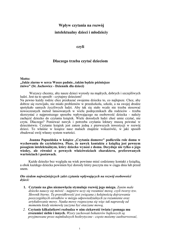 Wpływ czytania na rozwój intelektualny dzieci i młodzieży czyli Dlaczego trzeba czytać dzieciom Motto: „Jakie ziarno w serca Wasze padnie...takim będzie późniejsze żniwo" (St. Jachowicz - Dziennik dla dzieci) Wszyscy chcemy, aby nasze dzieci wyrosły na mądrych, dobrych i szczęśliwych ludzi. Jest na to sposób - czytajmy dzieciom! Na pewno każdy rodzic chce przekazać swojemu dziecku to, co najlepsze. Chce, aby dobrze się rozwijało, nie miało problemów w przedszkolu, szkole, a na swojej drodze spotykało samych życzliwych ludzi. Aby tak się stało wcale nie trzeba stosować nowoczesnych metod lansowanych w wielu podręcznikach dla rodziców - trzeba skorzystać z najprostszego sposobu wpływającego na osobowość dziecka - należy zachęcić dziecko do czytania książek. Wiele dorosłych ludzi choć umie czytać, nie czyta. Dlaczego? Ponieważ nawyk i potrzeba czytania lektury muszą powstać w dzieciństwie. Czytanie książek jest zatem jedną z pierwszych inwestycji w rozwój dzieci. To właśnie w książce nasz maluch znajdzie wskazówki, w jaki sposób zbudować swój własny system wartości. Joanna Papuzińska w książce „Czytania domowe" podkreśla role domu w wychowaniu do czytelnictwa. Pisze, że nawyk kontaktu z książką jest pewnym posagiem intelektualnym, który dziecko wynosi z domu. Decyduje nie tylko o jego wiedzy, ale również o pewnych właściwościach charakteru, preferowanych wartościach i postawach. Każde dziecko bez względu na wiek powinno mieć codzienny kontakt z książką, a obok każdego dziecka powinien być dorosły który poczyta mu w ciągu dnia lub przed snem. Oto siedem najważniejszych zalet czytania wpływających na rozwój osobowości dzieci: 1. Czytanie na głos niemowlęciu stymuluje rozwój jego mózgu. Zanim małe dziecko nauczy się mówić - najpierw uczy się rozumieć mowę, czyli tworzy tzw. Słownik bierny. Ta prawidłowość jest związana z kolejnością dojrzewania poszczególnych ośrodków w mózgu odpowiedzialnych za rozumienie oraz artykułowanie mowy. Nauka mowy rozpoczyna się więc tak naprawdę od momentu kiedy niemowlę zaczyna być otaczane mową, 2. Czytanie kilkulatkowi rozbudza w nim ciekawość świata i pomaga mu zrozumieć siebie i innych. Wzory zachowań bohaterów bajkowych są przyjmowane przez najmłodszych bezkrytyczne - często możemy zaobserwować, i 3. 4. 5. 6. 7. że maluch odtwarza zachowanie ulubionej postaci bajkowej. Utożsamia się z postacią głównego bohatera; towarzyszy mu w wędrówce ,razem z nim przeżywa radość, strach, smutek czy ból. nawiązuje przyjaźnie, stawia czoła wrogom, odpoczywa, bawi się. Dzieci szybko uczą się poprzez przykład - naśladując. Dzięki tej identyfikacji zapoznaje się z całą gamą emocji, uczuć i postaw. Uczy się zachowań społecznie akceptowanych oraz tych, które są potępiane. Czytanie stymuluje rozwój mowy i usprawnia pamięć. Książki ubogacają tak bierny (rozumienie) jak i czynny (mowa) słownik dziecka, poszerzając wiedzą o świecie i pomagając w ten sposób odnosić sukcesy w przedszkolu i w szkole. Czytanie pomaga także w przezwyciężaniu dysleksji. Dzieci zapoznając się z bogactwem języka literackiego nabywają umiejętność poprawnego wysławiania się, mobilizują do tworzenia własnych opowiadań i wierszy. Czytanie kształtuje wrażliwość moralną dziecka. Dzieci którym rodzice regularnie czytają szybciej się rozwijają łatwiej przyswajają wiedzę o świecie i ludziach, a także czują się bezpieczne i kochane. Świadczy o tym min. ich żywa reakcja kiedy słuchając opowiadania śmieją się, płaczą a czasem nieruchomieją w momentach napięcia. Książki kształtują pozytywny obraz siebie. Dziecko czytając wraz z rodzicem może pochwalić się swoją wiedzą. Chętniej będzie uczyło się i poznawało nowe pojęcia -ma to wpływ na ogólny rozwój społeczny dziecka. Książka zaspokaja potrzebę informacji i wzbogaca zasób wiadomości, zaś ilustracje w książkach ułatwiają tworzenie wyobrażeń o miejscach odległych i niedostępnych w codziennym życiu. Czytanie odpowiada również za budowanie szczególnego rodzaju więzi emocjonalnej pomiędzy rodzicami a dziećmi. Wspólne czytanie jest szczególną formą spędzania czasu z dzieckiem. To przynosi zarówno „ korzyści natychmiastowe " jak i procentuje na przyszłość. Dzięki czytaniu cała rodzina może wspólnie spędzać czas, a przeczytane treści mogą stanowić pretekst do wspólnych rozmów. Wspólne głośne czytanie z dzieckiem pomoże mu pokonać wiele problemów wieku dorastania. Literatura daje wsparcie w zmaganiu z różnymi problemami. Ukazuje różnorodne wzorce myślenia. Ogromną rolę odgrywają tutaj bajki terapeutyczne. Jest to literatura powszechnie znana i dostępna. Według Marii Mołickiej znanej bajkoterapeutki, jest ona ważną metodą wspierania i oddziaływania terapeutycznego we wczesnych okresach rozwoju dziecka .Może pomóc w efektywnym radzeniu sobie z sytuacjami trudnymi takimi jak: frustracje, lęki, niska samoocena, uzależnienia. Taka literatura kompensuje niezaspokojone potrzeby oraz wpływa na kształtowanie się poczucia własnej wartości. Ale w głośnym czytaniu chodzi tak naprawdę o to, aby poświęcić dziecku swój czas, uwagę, a przy tym miłość. Codzienne czytanie dziecku: • • • • • • • • • • Zapewnia emocjonalny rozwój dziecka Rozwija język, pamięć i wyobraźnię Uczy myślenia, poprawia koncentrację Wzmacnia poczucie własnej wartości dziecka Poszerza wiedzę ogólną Ułatwia naukę, pomaga odnieść sukces w szkole Uczy wartości moralnych, pomaga w wychowaniu Zapobiega uzależnieniu od telewizji i komputerów Chroni przed zagrożeniami ze strony masowej kul tury Kształtuje nawyk czytania i zdobywania wiedzy na całe życie i Umberto Eco powiedział: „ kto czyta książki, żyje podwójnie ". Jeżeli więc nie chcemy aby nasz maluszek ż