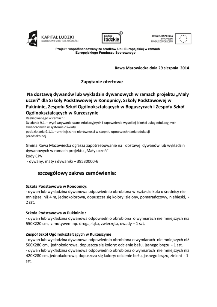 Prrojekt współffinansowany ze środków Unii Europejs skiej w ramac ch Eu uropejskiego o Funduszu Społecznego Raawa Mazow wiecka dniaa 29 sierpnia 2014 Zapytan nie ofertow we ostawę dyw wanów lu ub wykład dzin dywan nowych w w ramach projektu „„Mały Na do uczeń”” dla Szkołły Podstaw wowej w Konopniccy, Szkoły Podstawo owej w Pukininie, Zespo ołu Szkół O Ogólnokszztałcących h w Bogusszycach i ZZespołu Szzkół okształcąccych w Ku urzeszynie e Ogólno Realizowanego w ramaach : wnywanie szan ns edukacyjnych i zapewnie enie wysokiej jjakości usług eedukacyjnych Działania 9.1. – wyrów mie oświaty świadczonych w system nierówności w w stopniu upow wszechniania edukacji poddziałaania 9.1.1. – zmniejszanie n przedszko olnej Gmina R Rawa Mazo owiecka ogłaasza zapotrzzebowanie na dostaw wę dywanów w lub wykłaadzin dywano owych w ram mach projekktu „Mały u uczeń” kody CP PV : ‐ dywan ny, maty i d dywaniki – 3 39530000‐6 6 szczegóło s owy zakrres zamó ówienia: Szkoła P Podstawow wa w Konop pnicy: ‐ dywan n lub wykład dzina dywan nowa odpow wiednio obrobiona w kkształcie koła o średniccy nie mniejszej niż 4 m, jjednokoloro owa, dopuszcza się kolory: zielonyy, pomarańcczowy, nieb bieski, ‐ 2 szt. Podstawow wa w Pukininie : Szkoła P ‐ dywan n lub wykład dzina dywan nowa odpow wiednio obrobiona o w wymiarach nie mniejszzych niż 550X220 cm, z mo otywem np. droga, łąkaa, zwierzętaa, owady – 1 1 szt. Zespół SSzkół Ogóln nokształcąccych w Kurzeszynie ‐ dywan n lub wykład dzina dywan nowa odpow wiednio obrobiona o w wymiarach nie mniejszzych niż 500X280 cm, jednokolorowa,, dopuszcza się kolory: odcienie beeżu, jasnego o brązu ‐ 1 szt. ‐ dywan n lub wykład dzina dywan nowa odpow wiednio obrobiona o w wymiarach nie mniejszzych niż 420X280 cm, jedno okolorowa, dopuszcza się kolory: o odcienie beeżu, jasnego o brązu, zieleni ‐ 1 szt. Zespół Szkół Ogólnokształcących w Boguszycach: ‐ dywan lub wykładzina dywanowa odpowiednio obrobiona o wymiarach nie mniejszych niż 350X250 cm, jednokolorowa, dopuszcza się kolory: beżu, brązu, zieleni, niebieskiego, pomarańczowego lub z delikatnym motywem (nie na całej powierzchni) ‐ 1 szt. ‐ dywan o wymiarach nie mniejszych niż 400X200 cm, jednokolorowa, dopuszcza się kolory: odcienie zieleni, pomarańczowego lub z delikatnym motywem (nie na całej powierzchni) ‐ 1 szt. Dywany powinny mieć grubość nie mniejszą niż 10 mm, a wykładziny dywanowe powinny mieć grubość nie mniejszą niż 6,5 mm. Dywany i wykładziny dywanowe powinny mieć atesty dopuszczające do użytku w obiektach szkolnych. Zaleca się, aby do oferty załączyć ilustracje proponowanych dywanów lub wykładzin. Oferta powinna zawierać cenę oddzielnie dla każdej szkoły. Kryteria oceny ofert : Cena – 100 % Termin realizacji zamówienia do 15 września 2014 roku . Prosimy o składanie ofert cenowych do dnia 05.09.2014 do godz. 10 ⁰⁰ w Urzędzie Gminy Rawa Mazowiecka , Al. Konstytucji 3 Maja 32 w sekretariacie urzędu ‐ pokój 202 W przypadku pytań dotyczących zapytania ofertowego prosimy kontaktować się z: Małgorzatą Dudek, Anną Jakubiak lub Magdaleną Karnowską tel. 46 8144241 o na dostawę ę sprzętu w raamach projekktu „Mały uczeń” Załącznikk do zapytania ofertowego O Oświadcczenie Oświad dczamy , że jeste eśmy pod dmiotem m nie pow wiązanym m osobo owo ani kapitało owo z ZZamawiaającym ttj. Gminąą Rawa Mazowiecka w szczeggólności polegająącym na : 1) niee uczestn niczeniu Zamawiającego lub osób b w jego imieniu działającycch jako w wspólnikków w naaszej spółłce /firmie , wiającego o lub osó ób w jego o imieniu u 2) niee posiadaaniu przeez Zamaw działającycch co najm mniej 10 % udziałłów lub aakcji naszzej spółkki /firmy 3) niee pełnien niu funkccji członkaa organu u nadzorcczego lub b zarrządzająccego , prokurentaa lub pełnomocnika spółkki /firmy przzez Zamaawiająceggo lub ossób w jeggo imieniu działających 4) nie pozostawaniu w związku małżeńskim , w stosunku pokrewieństwa lub powinowactwa w linii prostej, w linii bocznej do drugiego stopnia lub w stosunku przysposobienia , opieki lub kurateli osób działających w imieniu Zamawiającego ………………………………………… Podpis składającego ofertę