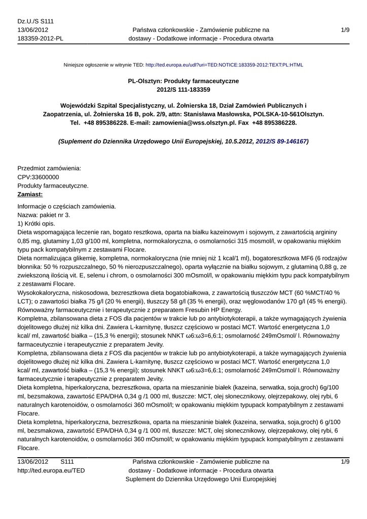 Dz.U./S S111 13/06/2012 183359-2012-PL Państwa członkowskie - Zamówienie publiczne na dostawy - Dodatkowe informacje - Procedura otwarta 1/9 Niniejsze ogłoszenie w witrynie TED: http://ted.europa.eu/udl?uri=TED:NOTICE:183359-2012:TEXT:PL:HTML PL-Olsztyn: Produkty farmaceutyczne 2012/S 111-183359 Wojewódzki Szpital Specjalistyczny, ul. Żołnierska 18, Dział Zamówień Publicznych i Zaopatrzenia, ul. Żołnierska 16 B, pok. 2/9, attn: Stanisława Masłowska, POLSKA-10-561Olsztyn. Tel. +48 895386228. E-mail: [email protected]. Fax +48 895386228. (Suplement do Dziennika Urzędowego Unii Europejskiej, 10.5.2012, 2012/S 89-146167) Przedmiot zamówienia: CPV:33600000 Produkty farmaceutyczne. Zamiast: Informacje o częściach zamówienia. Nazwa: pakiet nr 3. 1) Krótki opis. Dieta wspomagająca leczenie ran, bogato resztkowa, oparta na białku kazeinowym i sojowym, z zawartością argininy 0,85 mg, glutaminy 1,03 g/100 ml, kompletna, normokaloryczna, o osmolarności 315 mosmol/l, w opakowaniu miękkim typu pack kompatybilnym z zestawami Flocare. Dieta normalizująca glikemię, kompletna, normokaloryczna (nie mniej niż 1 kcal/1 ml), bogatoresztkowa MF6 (6 rodzajów błonnika: 50 % rozpuszczalnego, 50 % nierozpuszczalnego), oparta wyłącznie na białku sojowym, z glutaminą 0,88 g, ze zwiekszoną ilością vit. E, selenu i chrom, o osmolarności 300 mOsmol/l, w opakowaniu miękkim typu pack kompatybilnym z zestawami Flocare. Wysokokaloryczna, niskosodowa, bezresztkowa dieta bogatobiałkowa, z zawartością tłuszczów MCT (60 %MCT/40 % LCT); o zawartości białka 75 g/l (20 % energii), tłuszczy 58 g/l (35 % energii), oraz węglowodanów 170 g/l (45 % energii). Równoważny farmaceutycznie i terapeutycznie z preparatem Fresubin HP Energy. Kompletna, zbilansowana dieta z FOS dla pacjentów w trakcie lub po antybiotykoterapii, a także wymagających żywienia dojelitowego dłużej niż kilka dni. Zawiera L-karnitynę, tłuszcz częściowo w postaci MCT. Wartość energetyczna 1,0 kcal/ ml, zawartość białka – (15,3 % energii); stosunek NNKT ω6:ω3=6,6:1; osmolarność 249mOsmol/ l. Równoważny farmaceutycznie i terapeutycznie z preparatem Jevity. Kompletna, zbilansowana dieta z FOS dla pacjentów w trakcie lub po antybiotykoterapii, a także wymagających żywienia dojelitowego dłużej niż kilka dni. Zawiera L-karnitynę, tłuszcz częściowo w postaci MCT. Wartość energetyczna 1,0 kcal/ ml, zawartość białka – (15,3 % energii); stosunek NNKT ω6:ω3=6,6:1; osmolarność 249mOsmol/ l. Równoważny farmaceutycznie i terapeutycznie z preparatem Jevity. Dieta kompletna, hiperkaloryczna, bezresztkowa, oparta na mieszaninie białek (kazeina, serwatka, soja,groch) 6g/100 ml, bezsmakowa, zawartość EPA/DHA 0,34 g /1 000 ml, tłuszcze: MCT, olej słonecznikowy, olejrzepakowy, olej rybi, 6 naturalnych karotenoidów, o osmolarności 360 mOsmol/l; w opakowaniu miękkim typupack kompatybilnym z zestawami Flocare. Dieta kompletna, hiperkaloryczna, bezresztkowa, oparta na mieszaninie białek (kazeina, serwatka, soja,groch) 6 g/100 ml, bezsmakowa, zawartość EPA/DHA 0,34 g /1 000 ml, tłuszcze: MCT, olej słonecznikowy, olejrzepakowy, olej rybi, 6 naturalnych karotenoidów, o osmolarności 360 mOsmol/l; w opakowaniu miękkim typupack kompatybilnym z zestawami Flocare. 13/06/2012 S111 http://ted.europa.eu/TED Państwa członkowskie - Zamówienie publiczne na dostawy - Dodatkowe informacje - Procedura otwarta Suplement do Dziennika Urzędowego Unii Europejskiej 1/9 Dz.U./S S111 13/06/2012 183359-2012-PL Państwa członkowskie - Zamówienie publiczne na dostawy - Dodatkowe informacje - Procedura otwarta 2/9 Dieta kompletna, normokaloryczna, bezresztkowa, bezsmakowa, oparta na mieszaninie białek (kazeina,serwatka, soja, groch) (4 g/100 ml), zawartość EPA/DHA 0,34 g/1 000 ml, zawierająca tłuszcze MCT 0,6 g/100ml oraz 6 naturalnych karotenoidów, o osmolarności 255 mOsm/l. Dieta,wysokobiałkowa, 6,3 g białka/100 ml, w oparciu wyłącznie o białko kazeinowe, z glutaminą 1,56 g/100ml, hiperkaloryczna (1,25 kcal/ ml), bezresztkowa, klinicznie wolna od laktozy, o osmolarności 290 mOsmol/l, w opakowaniu miękkim typu pack kompatybilnym z zestawami Flocare. Dieta kompletna, normokaloryczna, bezresztkowa, bezsmakowa, oparta na mieszaninie białek (kazeina,serwatka, soja, groch) (4g/100 ml), zawartość EPA/DHA 0,34 g/1 000 ml, zawierająca tłuszcze MCT 0,6 g/100ml oraz 6 naturalnych karotenoidów, o osmolarności 255 mOsm/l. Dieta łatwowchłanialna, normokaloryczna, bezresztkowa, klinicznie wolna od laktozy, której źródło węglowodanów stanowią maltodekstryny, peptydowa 4 g białka/100 ml z serwatki (mieszanina wolnych aminokwasów i krótkołańcuchowych peptydów), niskotłuszczowa do 2 g/100 ml (tłuszcz obecny w postaci oleju roślinnego i średniołańcuchowych trójglicerydów - MCT), o osmolarności 455 mosmol/l, płyn 500 ml. Dieta cząstkowa w proszku, wysokobiałkowa, o neutralnym smaku, opakowanie 225 g. Równoważny farmaceutycznie i terapeutycznie z preparatem Protifar. Przyrząd grawitacyjny Flocare - butelka Przyrząd Flocare do żywienia dojelitowego w wersji grawitacyjnej, do butelek, wolny od DEHP. Przyrząd grawitacyjny Flocare - Pack Przyrząd Flocare do żywienia dojelitowego w wersji grawitacyjnej, do opakowań miękkich typu pack, wolny od DEHP. Kiompletna, zbilansowana, wysokoenergetyczna, niskowęglowodanowa dieta dojelitowa specjalnego przeznaczenia medycznego (dla chorych z dysfunkcjami układu oddechowego). Energetyczność 1,5 kcal/ ml,stosunek omega-6:omega-3 = 3,9:1, MCT:LCT=20:80, smak waniliowy. Opakowanie typu RTH o pojemności 1 000 ml. Równoważny farmaceutycznie i terapeutycznie z preparatem Pulmocare. Kompletna, zbilansowana, wysokoenergetyczna, niskowęglowodanowa dieta dojelitowa specjalnego przeznaczenia medycznego (dla chorych z dysfunkcjami układu oddechowego). Energetyczność 1,5 kcal/ ml,stosunek omega-6:omega-3 = 3,9:1, MCT:LCT=20:80, s