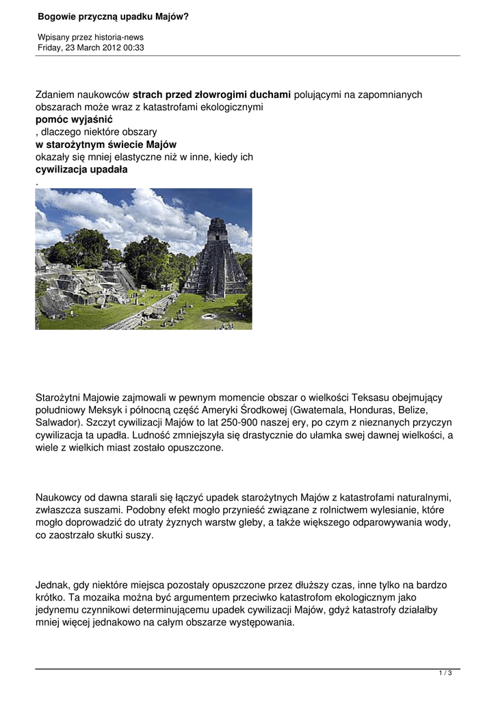 Bogowie przyczną upadku Majów? Wpisany przez historia-news Friday, 23 March 2012 00:33 Zdaniem naukowców strach przed złowrogimi duchami polującymi na zapomnianych obszarach może wraz z katastrofami ekologicznymi pomóc wyjaśnić , dlaczego niektóre obszary w starożytnym świecie Majów okazały się mniej elastyczne niż w inne, kiedy ich cywilizacja upadała . Starożytni Majowie zajmowali w pewnym momencie obszar o wielkości Teksasu obejmujący południowy Meksyk i północną część Ameryki Środkowej (Gwatemala, Honduras, Belize, Salwador). Szczyt cywilizacji Majów to lat 250-900 naszej ery, po czym z nieznanych przyczyn cywilizacja ta upadła. Ludność zmniejszyła się drastycznie do ułamka swej dawnej wielkości, a wiele z wielkich miast zostało opuszczone. Naukowcy od dawna starali się łączyć upadek starożytnych Majów z katastrofami naturalnymi, zwłaszcza suszami. Podobny efekt mogło przynieść związane z rolnictwem wylesianie, które mogło doprowadzić do utraty żyznych warstw gleby, a także większego odparowywania wody, co zaostrzało skutki suszy. Jednak, gdy niektóre miejsca pozostały opuszczone przez dłuższy czas, inne tylko na bardzo krótko. Ta mozaika można być argumentem przeciwko katastrofom ekologicznym jako jedynemu czynnikowi determinującemu upadek cywilizacji Majów, gdyż katastrofy działałby mniej więcej jednakowo na całym obszarze występowania. 1/3 Bogowie przyczną upadku Majów? Wpisany przez historia-news Friday, 23 March 2012 00:33 Archeolodzy podkreślają także, że starożytni Majowie mogli być narażeni na upadek z samej swojej natury. Oni najwyraźniej kanalizowali bogactwo u niewielkiej elity rządzącej, zwieńczoną dziedzicznymi królami, którzy mieli niemal nieograniczoną władzę, jednak ich poddani spodziewali się od nich hojności - ciąg porażek militarnych lub sezonowe susze mogły znacznie nadszarpnąć ich wiarygodność. Stabilność tego systemu została dodatkowo zagrożona przez poligamię wśród władców, która prowadziła do tarć wielu rodów walczących przeciwko sobie. Naukowcy, próbując odnaleźć przyczyny apokalipsy, skupili się na spadkach społecznych w końcowej fazie okresu klasycznego wśród Majów zamieszkujących niziny w okresie 750-950 roku. Przyjrzeli się także tendencjom spadkowym w latach 100-250, czyli okresie preklasycznym. Dostępne dane sugerują, że wyżej położone części terytoriów Majów z nizin, które obejmują większość część dzisiejszego Jukatanu, były znacznie bardziej podatne na upadki i mniej skłonni do ponownego rozwoju niż to miało miejsce w niż położonych obszarach. Miejsca te były bardziej zależne od przechowywania i wykorzystywania wody deszczowej, co czyniło je podatnymi na zmiany klimatu. Na niżej położonych obszarach mieszkańcy mieli dostęp do rzek, potoków i tzw. cenotes, które często były wypełnione wodą. Odzyskiwanie terenów wyżej położonych dla dużej liczby osób wymagało intensywnej pracy w celu przywrócenia systemów gospodarki wodnej. Zdaniem naukowców, to pozwala wyjaśnić, dlaczego tak długo pozostawały opuszczone. Niżej położone lokalizacje były mniej wymagające, a dowody wskazują, że były zwykle zajęte nieprzerwanie nawet wtedy, gdy upadały główne polityczne i ekonomiczne połączenia. Jednocześnie w zmierzch Majów mogli być zamieszanie bogowie. Opuszczone tereny stawały się miejscem boskich łowów, a tereny te były potem traktowane z rytualną czcią. Nie mam wątpliwości, że susze i degradacja środowiska, jak np. erozja gleby lub spadek żyzności gleby, odegrały swoją rolę w upadku określonym jako długotrwały spadek populacji niektórych miast lub regionów. Jednak ważną rolę odegrało środowisko danych miejsc. Tym niemniej fakt, że upadek był często mozaiką silnie sugeruje, że czynniki kulturowe, jak na przykład siła władcy, czy zdolność adaptacyjna społeczeństwa, miały równie ważne znaczenie, 2/3 Bogowie przyczną upadku Majów? Wpisany przez historia-news Friday, 23 March 2012 00:33 czy dana grupa zdołała się obronić przed upadkiem. - podsumował Nicholas Dunning, geograf z Uniwersytetu w Cincinnati. Czytaj artykuł źródłowy 3/3