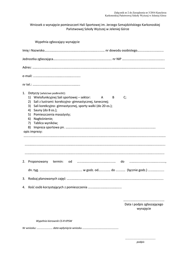 Załącznik nr 2 do Zarządzenia nr 3/2016 Kanclerza Karkonoskiej Państwowej Szkoły Wyższej w Jeleniej Górze Wniosek o wynajęcie pomieszczeń Hali Sportowej im. Jerzego Szmajdzińskiego Karkonoskiej Państwowej Szkoły Wyższej w Jeleniej Górze Wypełnia zgłaszający wynajęcie Imię i Nazwisko………………………………………………………………… nr dowodu osobistego…………………………… Jednostka zgłaszająca………………………………………………………………. nr NIP …………………………………………….. Adres: ………………………………………………………………………………………………………………………………………………… e-mail: ………………………………………………….. nr tel.: ………………………………………………….. 1. Dotyczy (właściwe podkreślić): 1) Wielofunkcyjnej Sali sportowej – sektor: A B C; 2) Sali z lustrami: korekcyjno- gimnastycznej, tanecznej; 3) Sali korekcyjno- gimnastycznej, sporty walki (do 20 os.); 4) Sauny (do 8 os.); 5) Pomieszczenia masażysty; 6) Nagłośnienie; 7) Tablica wyników; 8) Impreza sportowa pn. …………………………………………………………………………………………………. opis imprezy: …………………………………………………………………………………………………………………………………………………………… …………………………………………………………………………………………………………………………………………………………. ………………………………………………………………………………………………………………………………………………………… 2. Proponowany termin: od ………………………………………… do ………………………………………, dn. tyg. …………………………………………….. w godz. od…………… do ………… (łącznie godz.) ……………….. 3. Rodzaj planowanych zajęć: ………………………………………………………………………………………………………... 4. Ilość osób korzystających z pomieszczenia …………………………………… …………………………………………… Data i podpis zgłaszającego wynajęcie Wypełnia kierownik CS-R KPSW Nr wniosku: …………………… data wpłynięcia wniosku ………………………………………………. ………………………………………. podpis