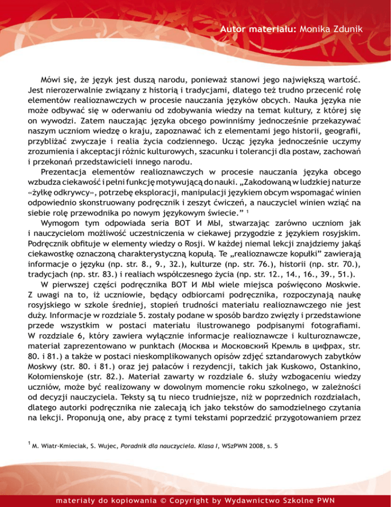 Autor materiału: Monika Zdunik Mówi się, że język jest duszą narodu, ponieważ stanowi jego największą wartość. Jest nierozerwalnie związany z historią i tradycjami, dlatego też trudno przecenić rolę elementów realioznawczych w procesie nauczania języków obcych. Nauka języka nie może odbywać się w oderwaniu od zdobywania wiedzy na temat kultury, z której się on wywodzi. Zatem nauczając języka obcego powinniśmy jednocześnie przekazywać naszym uczniom wiedzę o kraju, zapoznawać ich z elementami jego historii, geografii, przybliżać zwyczaje i realia życia codziennego. Ucząc języka jednocześnie uczymy zrozumienia i akceptacji różnic kulturowych, szacunku i tolerancji dla postaw, zachowań i przekonań przedstawicieli innego narodu. Prezentacja elementów realioznawczych w procesie nauczania języka obcego wzbudza ciekawość i pełni funkcję motywującą do nauki. „Zakodowaną w ludzkiej naturze «żyłkę odkrywcy», potrzebę eksploracji, manipulacji językiem obcym wspomagać winien odpowiednio skonstruowany podręcznik i zeszyt ćwiczeń, a nauczyciel winien wziąć na siebie rolę przewodnika po nowym językowym świecie.” 1 Wymogom tym odpowiada seria ВОТ И МЫ, stwarzając zarówno uczniom jak i nauczycielom możliwość uczestniczenia w ciekawej przygodzie z językiem rosyjskim. Podręcznik obfituje w elementy wiedzy o Rosji. W każdej niemal lekcji znajdziemy jakąś ciekawostkę oznaczoną charakterystyczną kopułą. Te „realioznawcze kopułki” zawierają informacje o języku (np. str. 8., 9., 32.), kulturze (np. str. 76.), historii (np. str. 70.), tradycjach (np. str. 83.) i realiach współczesnego życia (np. str. 12., 14., 16., 39., 51.). W pierwszej części podręcznika ВОТ И МЫ wiele miejsca poświęcono Moskwie. Z uwagi na to, iż uczniowie, będący odbiorcami podręcznika, rozpoczynają naukę rosyjskiego w szkole średniej, stopień trudności materiału realioznawczego nie jest duży. Informacje w rozdziale 5. zostały podane w sposób bardzo zwięzły i przedstawione przede wszystkim w postaci materiału ilustrowanego podpisanymi fotografiami. W rozdziale 6, który zawiera wyłącznie informacje realioznawcze i kulturoznawcze, materiał zaprezentowano w punktach (Москва и Московский Кремль в цифрах, str. 80. i 81.) a także w postaci nieskomplikowanych opisów zdjęć sztandarowych zabytków Moskwy (str. 80. i 81.) oraz jej pałaców i rezydencji, takich jak Kuskowo, Ostankino, Kołomienskoje (str. 82.). Materiał zawarty w rozdziale 6. służy wzbogaceniu wiedzy uczniów, może być realizowany w dowolnym momencie roku szkolnego, w zależności od decyzji nauczyciela. Teksty są tu nieco trudniejsze, niż w poprzednich rozdziałach, dlatego autorki podręcznika nie zalecają ich jako tekstów do samodzielnego czytania na lekcji. Proponują one, aby pracę z tymi tekstami poprzedzić przygotowaniem przez 1 M. Wiatr-Kmieciak, S. Wujec, Poradnik dla nauczyciela. Klasa I, WSzPWN 2008, s. 5 materiały do kopiowania © Copyright by Wydawnictwo Szkolne PWN Autor materiału: Monika Zdunik zespoły uczniowskie prezentacji oraz kwizu o Moskwie w języku polskim (Poradnik Nauczyciela, str. 45.). W zamieszczonych w „Niezbędniku Nauczyciela” przykładowych scenariuszach lekcji proponuje się natomiast wykorzystanie informacji z rozdziału 6. podczas realizacji materiału zawartego w rozdziale 5. (Przykładowe scenariusze lekcji, Klasa I, Semestr II, str. 42.-47.). Nie można pominąć także faktu, iż w książce znalazła się lekcja poświęcona charakterystycznym rosyjskim pamiątkom – «Русские сувениры» (str. 76./77.). Uczeń może dowiedzieć się, jak nazywają się najpopularniejsze, zapoznać się z ich fotografiami i opisem. W rozdziale 6. znajduje się również informacja o obchodach Świąt Bożego Narodzenia w Rosji. Jest ona napisana w sposób bardzo przystępny, zawiera krótki opis zwyczajów świątecznych oraz ilustrowany przepis na tradycyjne postne danie świąteczne – «сочиво». Ponieważ zdajemy sobie sprawę z tego, jak ważna jest rola wiedzy kulturo-, krajoi realioznawczej w procesie nauczania języka rosyjskiego, proponujemy wzbogacenie jej o dodatkowe informacje. Wierzymy, że wśród uczniów są osoby ambitne i chętne do poszerzania swej wiedzy. Dlatego też na stronie Wydawnictwa Szkolnego PWN mogą Państwo znaleźć materiały uzupełniające oraz test wiedzy o Moskwie. Zawarte tu informacje zostały skorelowane z plakatem, który WSzPWN udostępniło nauczycielom zainteresowanym pracą z serią ВОТ И МЫ. Przygotowaliśmy również kilka informacji o innych, niż wymienione w podręczniku, typowych wyrobach artystycznych, które kojarzą się z Rosją i jej kulturą, stanowiąc jednocześnie jej symbole. Postaraliśmy się także przygotować listę linków do stron rosyjskich, na których można znaleźć więcej informacji i ciekawostek o opisanych przez nas obiektach i upominkach, obejrzeć ich fotografie oraz odbyć wirtualne wycieczki po interesujących miejscach w Moskwie. materiały do kopiowania © Copyright by Wydawnictwo Szkolne PWN Autor materiału: Monika Zdunik ВОТ ТАК НОВОСТИ! Informacje dodatkowe oraz ćwiczenia dotyczące zakresu materiału realioznawczego zawartego w rozdziałach 5. i 6. – informacje o Moskwie, opis atrakcji turystycznych, zabytków, historii i teraźniejszości rosyjskiej stolicy oraz jej okolic – informacje o typowych pamiątkach rosyjskich Poziom: podstawowy; uczniowie liceum ogólnokształcącego, profilowanego i technikum Cele główne: •poszerzenie zakresu wiadomości o Moskwie i jej atrakcjach turystycznych •poszerzenie zakresu wiadomości dotyczących typowych pamiątek rosyjskich •wzbogacanie i utrwalenie słownictwa związanego z materiałem realioznawczym •wzbogacanie i utrwalenie słownictwa związanego z miastem •stworzenie bazy adresów internetow