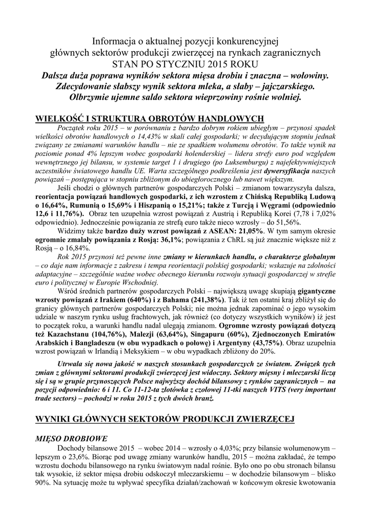 Informacja o aktualnej pozycji konkurencyjnej głównych sektorów produkcji zwierzęcej na rynkach zagranicznych STAN PO STYCZNIU 2015 ROKU Dalsza duża poprawa wyników sektora mięsa drobiu i znaczna – wołowiny. Zdecydowanie słabszy wynik sektora mleka, a słaby – jajczarskiego. Olbrzymie ujemne saldo sektora wieprzowiny rośnie wolniej. WIELKOŚĆ I STRUKTURA OBROTÓW HANDLOWYCH Początek roku 2015 – w porównaniu z bardzo dobrym rokiem ubiegłym – przynosi spadek wielkości obrotów handlowych o 14,43% w skali całej gospodarki; w decydującym stopniu jednak związany ze zmianami warunków handlu – nie ze spadkiem wolumenu obrotów. To także wynik na poziomie ponad 4% lepszym wobec gospodarki holenderskiej – lidera strefy euro pod względem wewnętrznego jej bilansu, w systemie target 1 i drugiego (po Luksemburgu) z najefektywniejszych uczestników światowego handlu UE. Warta szczególnego podkreślenia jest dywersyfikacja naszych powiązań – postępująca w stopniu zbliżonym do ubiegłorocznego lub nawet większym. Jeśli chodzi o głównych partnerów gospodarczych Polski – zmianom towarzyszyła dalsza, reorientacja powiązań handlowych gospodarki, z ich wzrostem z Chińską Republiką Ludową o 16,64%, Rumunią o 15,69% i Hiszpanią o 15,21%; także z Turcją i Węgrami (odpowiednio 12,6 i 11,76%). Obraz ten uzupełnia wzrost powiązań z Austrią i Republiką Korei (7,78 i 7,02% odpowiednio). Jednocześnie powiązania ze strefą euro także nieco wzrosły – do 51,56%. Widzimy także bardzo duży wzrost powiązań z ASEAN: 21,05%. W tym samym okresie ogromnie zmalały powiązania z Rosją: 36,1%; powiązania z ChRL są już znacznie większe niż z Rosją – o 16,84%. Rok 2015 przynosi też pewne inne zmiany w kierunkach handlu, o charakterze globalnym – co daje nam informacje z zakresu i tempa reorientacji polskiej gospodarki; wskazuje na zdolności adaptacyjne – szczególnie ważne wobec obecnego kierunku rozwoju sytuacji gospodarczej w strefie euro i politycznej w Europie Wschodniej. Wśród średnich partnerów gospodarczych Polski – największą uwagę skupiają gigantyczne wzrosty powiązań z Irakiem (640%) i z Bahama (241,38%). Tak iż ten ostatni kraj zbliżył się do granicy głównych partnerów gospodarczych Polski; nie można jednak zapominać o jego wysokim udziale w naszym rynku usług frachtowych, jak również (co dotyczy wszystkich wyników) iż jest to początek roku, a warunki handlu nadal ulegają zmianom. Ogromne wzrosty powiązań dotyczą też Kazachstanu (104,76%), Malezji (63,64%), Singapuru (60%), Zjednoczonych Emiratów Arabskich i Bangladeszu (w obu wypadkach o połowę) i Argentyny (43,75%). Obraz uzupełnia wzrost powiązań w Irlandią i Meksykiem – w obu wypadkach zbliżony do 20%. Utrwala się nowa jakość w naszych stosunkach gospodarczych ze światem. Związek tych zmian z głównymi sektorami produkcji zwierzęcej jest widoczny. Sektory mięsny i mleczarski liczą się i są w grupie przynoszących Polsce najwyższy dochód bilansowy z rynków zagranicznych – na pozycji odpowiednio: 6 i 11. Co 11-12-ta złotówka z czołowej 11-tki naszych VITS (very important trade sectors) – pochodzi w roku 2015 z tych dwóch branż. WYNIKI GŁÓWNYCH SEKTORÓW PRODUKCJI ZWIERZĘCEJ MIĘSO DROBIOWE Dochody bilansowe 2015 – wobec 2014 – wzrosły o 4,03%; przy bilansie wolumenowym – lepszym o 23,6%. Biorąc pod uwagę zmiany warunków handlu, 2015 – można zakładać, że tempo wzrostu dochodu bilansowego na rynku światowym nadal rośnie. Było ono po obu stronach bilansu tak wysokie, iż sektor mięsa drobiu odskoczył mleczarskiemu – w dochodzie bilansowym – blisko 90%. Na sytuację może tu wpływać specyfika działań/zachowań w końcowym okresie kwotowania produkcji mleka. Na naszym rynku mięsa drobiowego konkurenci uzyskują symboliczne dochody – zarówno unijni, jak z MERCOSUR-u. Istotną zmianą roku 2015 jest powiększenie udziału rynków trzecich w strukturze dochodów – związane z umocnieniem na tradycyjnym już rynku benińskim, ale przede wszystkim na rynkach ASEAN-China Free Trade Area (tu skok jest ogromny). WOŁOWINA Bilans roku 2015 na rynkach zagranicznych poprawia się, wobec 2014. Z początkiem roku branża – na tle sektora mleka – zyskuje w dochodzie bilansowym z rynków zagranicznych ponad 1/4; z końcem ub.r. bilans ten był zupełnie inny. Dodatni bilans wolumenowy był aż 5,07% lepszy niż w 2014; dochód bilansowy – słabszy tylko o 6,77%. Z początkiem roku zwracało uwagę tempo wzrostu Bośnii&Hercegowiny oraz Czarnogóry i Izraela w strukturze dochodów sektora wołowiny z rynków zagranicznych; z również znaczącym gospodarczo – wzrostem roli rynku turkmeńskiego oraz ECOWAS, ale przede wszystkim rynku Hongkongu (i powiązanych z nim). Na polskim rynku wołowiny konkurenci zyskali nieco w styczniu, ale ich dochód pozostaje skromny – poziom 2 i pół procenta uzyskanego przez nasz sektor wołowiny na zagranicznych rynkach; umocnili swe pozycje konkurenci nadbałtyccy i pewnym stopniu z MERCOSUR. MLEKO O wysokim poziomie dodatniego bilansu wolumenowego – o 23,44% lepszym niż w 2014 – trzeba wspomnieć na początku; zdając sobie sprawę z niższego (na tle 2014) dochodu bilansowego, o 37,81%. Ta sytuacja ma związek z wpływem krajowego rynku i końcem kwotowania produkcji, ale wobec dużych zmian warunków handlu – nie jest wcale jednoznaczna, przy tak dobrym wyniku wolumenowym branży. Zwłaszcza iż na ekspansję konkurentów unijnych na naszym rynku – polski sektor mleka odpowiada mocno na rynkach trzecich, ale i UE – zwłaszcza spoza EMU. Konkurenci irlandzcy umocnili swoją pozycję w sposób niepokojący, ale znaczenie konkurencji austriackiej też mocno wzrosło; nie można też nie zauważać postępów konkurencji hiszpańskiej i duńskiej. Na to – w styczniu – polski sektor mleka mocno odpowiedział na rynkach ASEAN, ale też peruw