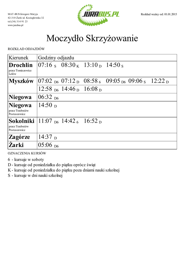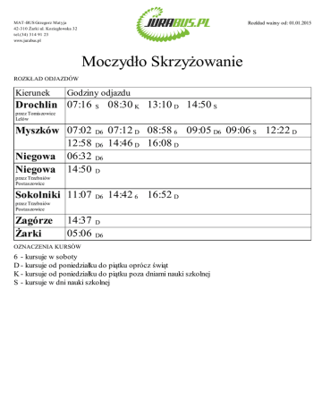 Rozkład ważny od: 01.01.2015 MAT -BUS Grzegorz Matyja 42-310 Żarki ul. Koziegłowska 32 tel.(34) 314 91 23 www.jurabus.pl Moczydło Skrzyżowanie ROZKŁAD ODJAZDÓW Kierunek Godziny odjazdu Drochlin 07:16 S 08:30 K 13:10 D 14:50 S przez Tomiszowice Lelów Myszków 07:02 12:58 Niegowa 06:32 Niegowa 14:50 D6 D6 07:12 D 08:58 6 09:05 D6 09:06 S 12:22 D 14:46 D 16:08 D D6 D przez Trzebniów Postaszowice Sokolniki 11:07 D6 14:42 6 16:52 D przez Trzebniów Postaszowice Zagórze Żarki 14:37 05:06 D D6 OZNACZENIA KURSÓW 6 - kursuje w soboty D - kursuje od poniedziałku do piątku oprócz świąt K - kursuje od poniedziałku do piątku poza dniami nauki szkolnej S - kursuje w dni nauki szkolnej