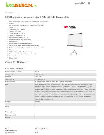 Izabelin 2017-03-08 Karta produktu: NOBO projection screen on tripod, 4:3, 1500x1138mm, white Great white matte screen surface provides a clear and detailed picture; Can be easily put into a protective bag to prevent damage; Format 4:3 Dimensions: 150x113.8 cm Diagonal: 187.5 cm Usable area 145x108.8 cm Length of cartridge: 158 cm Maximum screen height: 293 cm Height and bottom edge adjustation; Movable arm; Black frame that improves the contrast; Vertical tilting of the screen (no Keystone's effect) Built-in the tensioner for a perfectly smooth screen surface; Robust design Foldable tripod with rubber tipped legs Can be mounted on the ceiling or on the wall Warranty: 1 year Colour: white Cena 415,17 PLN brutto Basic product parameters Numer produktu w systemie 62858 Nr dostawcy ACN1902395 Nr Celcen 20-01015-7 Kod kreskowy 5028252250283 Nazwa produktu NOBO projection screen on tripod, 4:3, 1500x1138mm, white Opis Great white matte screen surface provides a clear and detailed picture;; can be easily put into a protective bag to prevent damage;; format 4:3; dimensions: 150x113.8 cm; diagonal: 187.5 cm; usable area 145x108.8 cm; length of cartridge: 158 cm; maximum screen height: 293 cm; height and bottom edge adjustation;; movable arm;; black frame that improves the contrast;; vertical tilting of the screen (no Keystone's effect); built-in the tensioner for a perfectly smooth screen surface;; robust design; foldable tripod with rubber tipped legs; can be mounted on the ceiling or on the wall; warranty: 1 year; colour: white Kategoria Screens Brand Dimensions Dimensions (mm) Format Eko biuro ul Krasińskiego 23a 05-080 Izabelin NIP: 527-000-75-75 22 864 54 84 Izabelin 2017-03-08 Karta katalogowa produktu cd. NOBO projection screen on tripod, 4:3, 1500x1138mm, white Feature Product Projection screen Offer from Kind On a tripod Type Standard Procurement vocabulary CPV 30237210-4 Ekrany antyodblaskowe Certifications Warranty 1 Hit Standard New product New Colour Colour White Pozostałe zdjęcia produktu Serdecznie zapraszamy do współpracy Eko biuro zespół. Eko biuro ul Krasińskiego 23a 05-080 Izabelin NIP: 527-000-75-75 22 864 54 84