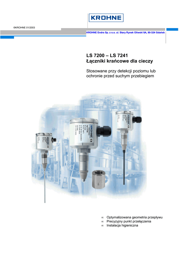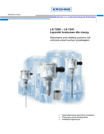 ®KROHNE 01/2003 KROHNE Endra Sp. z o.o. ul. Stary Rynek Oliwski 8A, 80-324 Gdańsk LS 7200 – LS 7241 Łączniki krańcowe dla cieczy Stosowane przy detekcji poziomu lub ochronie przed suchym przebiegiem • • • Optymalizowana geometria przepływu Precyzyjny punkt przełączenia Instalacja higieniczna KROHNE Endra Sp. z o.o. LS 72xx to linia higienicznych czujników przewodnościowych, przeznaczonych do detekcji poziomu lub ochrony przed suchym przebiegiem, stosowanych dla cieczy przewodzących. Czujniki dokonują pomiaru rezystancji elektrycznej mierzonej cieczy w sytuacji, gdy elektroda znajduje się w styku z nią. Ściana zbiornika lub rurociągu służy jako powierzchnia o odwróconym potencjale. Dostępne są elektrody trzpieniowe, służące instalacjom przeprowadzanym w rurociągu (LS 7200/7201) oraz prętowe (pojedyncze lub zwielokrotnione) w przypadku LS 7210 – LS 7240, montowanych w zbiornikach. Pręt czujnika wykonany jest ze stali nierdzewnej lub jest powlekany tak, aby uniezależnić czujnik od występującej piany lub osadów. Pręt czujnika może zostać skrócony, bez stosowania specjalistycznych narzędzi. Moduł elektroniki występuje w postaci zabudowanej w przedziale elektroniki lub postaci gotowej do zabudowy panelowej (moduły elektroniki LEM 100/200). Poprzez użycie wejścia stykowego, występuje możliwość regulacji czułości, istotnej w przypadku zmieniającego się produktu (zmieniającej się przewodności). Duża różnorodność technologicznych przyłączy higienicznych umożliwia łatwe dokonanie bezszczelinowego montażu. Przyłącza powyższe posiadają dopuszczenia EHEDG w odniesieniu do możliwości ich czyszczenia. Dane techniczne (pozostałe informacje – patrz: „Akcesoria dla higienicznych urządzeń pomiarowych”) Typ przyrządu Typ czujnika LS 7200/LS 7201 LS 7210/LS 7211 Elektroda Elektroda trzpieniowa prętowa pojedyncza LS 7230/LS 7231 Wielokrotna elektroda prętowa Przewodność LS 7220/LS 7221 Elektroda prętowa pojedyncza powlekana Przewodność Przewodność LS 7240/LS 7241 Wielokrotna elektroda prętowa powlekana Przewodność Zasada działania Warunki procesu Ciśnienie Temperatura Materiały Czujnik Przewodność ≤ 10 bar -20...+140°C ≤ 10 bar -20...+140°C ≤ 10 bar -20...+140°C ≤ 10 bar -20...+140°C ≤ 10 bar -20...+140°C Stal 1.4571 Stal 1.4571 Stal 1.4571 Stal 1.4305 PEEK (dopuszczenie przez FDA) Stal 1.4571 powlekana PTFE Stal 1.4305 PEEK (dopuszczenie przez FDA) Stal 1.4305 PEEK (dopuszczenie przez FDA) Stal 1.4571 powlekana PTFE Stal 1.4305 PEEK (dopuszczenie przez FDA) G1/2”h 4 mm 200; 500; 850; 1000 G1/2”h 4.2 mm 200; 500; 850; 1000 G1”h 4 mm 200; 500; 850; 1000 G1”h 4.2 mm 200; 500; 850; 1000 LS 7210 Połączenie elektroda / ziemia LS 7211 Aktywne, max 50 mA (odporne na zwarcie) LS 7220 Połączenie elektroda / ziemia LS 7221 Aktywne, max 50 mA (odporne na zwarcie) 18...36 VDC Max. 10 mA 18...36 VDC Max. 10 mA 18...36 VDC Max. 10 mA LS 7230 Połączenie elektroda / ziemia LS 7231 Aktywne, max 50 mA (odporne na zwarcie); max. 1 wyjście 18...36 VDC Max. 10 mA LS 7240 Połączenie elektroda / ziemia LS 7241 Aktywne, max 50 mA (odporne na zwarcie); max. 1 wyjście 18...36 VDC Max. 10 mA 0.2; 2; 20 nastawialne 0.2; 2; 20 Nastawialne 0.2; 2; 20 Nastawialne 0.2; 2; 20 Nastawialne 0.2; 2; 20 nastawialne Wpust kablowy Wtyk M16; M12 3A IP 67 Moduł elektroniki poziomu; przyłącze higieniczne Wpust kablowy Wtyk M16; M12 3A IP 67 Moduł elektroniki poziomu; przyłącze higieniczne Wpust kablowy Wtyk M16; M12 3A IP 67 Moduł elektroniki poziomu; przyłącze higieniczne Wpust kablowy Wtyk M16; M12 3A IP 67 Moduł elektroniki poziomu; przyłącze higieniczne Wpust kablowy Wtyk M16; M12 3A IP 67 Moduł elektroniki poziomu; przyłącze higieniczne Obudowa Część izolowana Stal 1.4305 PEEK (dopuszczenie przez FDA) Przyłącze procesowe Wkręcane G1/2”h Średnica czujnika Długość czujnika (mm) Moduł elektroniki Wyjście LS 7200 Połączenie elektroda / ziemia LS 7201 Aktywne, max 50 mA (odporne na zwarcie) Zasilanie (tylko dla wyjścia aktywnego) Czułość (kΩ) (tylko dla wyjścia aktywnego) Podłączenie elektryczne Dopuszczenie Stopień ochrony Akcesoria LS 7200 – LS 7241 – łączniki krańcowe dla cieczy 2/4 KROHNE Endra Sp. z o.o. Podłączenia elektryczne i wymiary LS 7200 / LS 7201 LS 7210 / LS 7211 LS 7200 – LS 7241 – łączniki krańcowe dla cieczy 3/4 KROHNE Endra Sp. z o.o. LS 7220 / LS 7221 LS 7230 / LS 7231 / LS 7240 / LS 7241 LS 7200 – LS 7241 – łączniki krańcowe dla cieczy 4/4