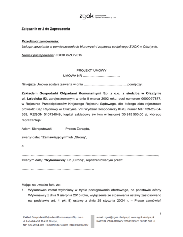 Załącznik nr 2 do Zaproszenia Przedmiot zamówienia: Usługa sprzątania w pomieszczeniach biurowych i zaplecza socjalnego ZUOK w Olsztynie. Numer postępowania: ZGOK 8/ZO/2015 PROJEKT UMOWY UMOWA NR …………………………… Niniejsza Umowa została zawarta w dniu ……………………………….. pomiędzy: Zakładem Gospodarki Odpadami Komunalnymi Sp. z o.o. z siedzibą w Olsztynie ul. Lubelska 53, zarejestrowanym w dniu 8 marca 2002 roku, pod numerem 0000097877, w Rejestrze Przedsiębiorców Krajowego Rejestru Sądowego, dla którego akta rejestrowe prowadzi Sąd Rejonowy w Olsztynie, VIII Wydział Gospodarczy KRS, numer NIP 739-29-54369, REGON 510734049, kapitał zakładowy (w tym wniesiony) 30 915 500,00 zł, którego reprezentuje: Adam Sierzputowski - Prezes Zarządu, zwany dalej: “Zamawiającym” lub „Stroną”, a …………………………………………………………………………………………………………., zwanym dalej: “Wykonawcą” lub „Stroną”, reprezentowanym przez: ………………………………………………………. Mając na uwadze fakt, że: 1. Wykonawca został wyłoniony w trybie postępowania ofertowego, na podstawie oferty Wykonawcy z dnia 9 sierpnia 2015 roku, wyłączenie ze stosowania ustawy zastosowano na podstawie art. 4 pkt 8) ustawy z dnia 29 stycznia 2004 r. – Prawo zamówień 1 publicznych 29 stycznia 2004 r. Prawo zamówień publicznych (t. j. Dz. U. z 2015 r., poz. 2164). 2. Osoby reprezentujące Strony mają stosowne umocowania, aby zaciągnąć zobowiązania wynikające z niniejszej Umowy. Strony postanowiły zawrzeć Umowę o następującej treści: §1 Interpretacja 1. Integralne części niniejszej Umowy stanowią następujące dokumenty: 1.1. Załącznik nr 1 – Zaproszenie do złożenia oferty 1.2. Załącznik nr 2 – Szczegółowy Opis Przedmiotu Zamówienia; 1.3. Załącznik nr 3 - Oferta Wykonawcy. 2. W przypadku rozbieżności zapisów poszczególnych dokumentów wymienionych w pkt 1.1. – 1.3. w stosunku do treści Umowy w odniesieniu do tej samej kwestii, pierwszeństwo mają postanowienia zawarte w Umowie, a następnie w dokumentach wymienionych we wskazanej w ust.1 kolejności. 3. Nagłówki umieszczone w tekście niniejszej Umowy mają charakter informacyjny i nie mają wpływu na interpretacje niniejszej Umowy. §2 Przedmiot Umowy 1. Zamawiający powierza Wykonawcy, a Wykonawca przyjmuje do wykonania prace polegające na sprzątaniu pomieszczeń Zamawiającego, zlokalizowane w budynkach administracyjno – socjalnym (nr 3) i wagowym (nr 1a) Zakładu Unieszkodliwiania Odpadów Komunalnych przy ul. Lubelskiej 53 w Olsztynie, zgodnie z warunkami określonymi w niniejszej umowie i w zaproszeniu do składania ofert oraz w ofercie Wykonawcy z dnia ………………….., które stanowią integralną część niniejszej umowy. 2. Łączna powierzchnia pomieszczeń objętych sprzątaniem wynosi: 1.770,68 m2. W załączniku nr 2 do umowy zawarty jest wykaz pomieszczeń, zakres i częstotliwość wykonywania prac objętych zamówieniem. 3. Wykonawca własnym staraniem i na własny koszt zapewni narzędzia, sprzęt techniczny, materiały, środki czystości używane do sprzątania. 4. Wykonawca zobowiązany jest zapewnić własnym staraniem i na własny koszt jednorazowe worki na śmieci, kuchenne, ręczniki papierowe do łazienek, ręczniki kuchenne, mydło w płynie, płyn dezynfekcyjny, papier toaletowy, automatyczne 2 odświeżacze powietrza do łazienek (po jednym do każdej łazienki) wraz z wkładami wymienianymi na bieżąco w miarę ich zużywania. 5. Wykonawca zobowiązuje się stosować środki czystości posiadające wymagane atesty i świadectwa Państwowego Zakładu Higieny lub równoważne zaświadczenia, że oferowane środki podczas stosowania zgodnego z zaleceniami producenta nie wpływają negatywnie na zdrowie i środowisko. 6. Wykonawca zobowiązany jest zapewnić, żeby po zakończeniu każdorazowego sprzątania było wyłączone oświetlenie, okna w siedzibie Zamawiającego pozostawały zamknięte, a drzwi do pomieszczeń zamknięte na klucz. Klucze do pomieszczeń zostaną udostępnione przez ochronę budynku nr 3 i podlegają zwrotowi po zakończeniu sprzątania. Pomieszczenia objęte kontrolą dostępu (w budynku nr 3 - 0.12 Centralna Dyspozytornia wraz z przyległym zapleczem 0.13 oraz 0.19 przejście z części administracyjnej do socjalnej na parterze) będą sprzątane każdorazowo w obecności dozorcy budynku po otwarciu ich kluczem elektronicznym. 7. Wykonawca zobowiązany jest przed podpisaniem umowy przedłożyć Zamawiającemu: 7.1. wykaz pracowników i osób, którymi będzie się posługiwał przy wykonywaniu umowy, 7.2. umowy o pracę pracowników zatrudnionych na pełen etat, którzy będą zaangażowani przy wykonywaniu zamówienia [niniejszy zapis będzie obowiązywał w przypadku, gdy Wykonawca zobowiązał się w swojej Ofercie, że będzie zatrudniał pracowników na umowy o pracę na pełen etat i w związku z tym złożonej ofercie zostały przyznane dodatkowe punkty]. 7.3. W przypadku każdej zmiany składu osobowego, Wykonawca zobowiązany jest na bieżąco uaktualniać ww. wykaz i dostarczać umowy o pracę na pełen etat [w przypadku, gdy Wykonawca zobowiązał się w swojej Ofercie, że będzie zatrudniał pracowników na umowy o pracę na pełen etat i w związku z tym złożonej ofercie zostały przyznane dodatkowe punkty]. 8. Wszystkie osoby, którymi Wykonawca posługuje się przy wykonaniu umowy winny być przeszkolone w zakresie BHP. 9. Dni i godziny, w których wykonywana będzie umowa, zostaną ustalone przez Wykonawcę z Zamawiającym po podpisaniu umowy. Do prac określonych w Rozdziale 3 ust. 3.2. ppkt 1-8 Załącznika nr 2 do niniejszej umowy, Wykonawca przedkłada na każdy miesiąc harmonogram wykonywania prac w poszczególnych pomieszczeniach. Ww. 3 harmonogram podlega akceptacji osoby wyznaczonej przez Zamawiaj
