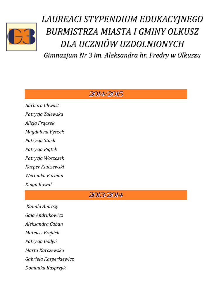 LAUREACI STYPENDIUM EDUKACYJNEGO BURMISTRZA MIASTA I GMINY OLKUSZ DLA UCZNIÓW UZDOLNIONYCH Gimnazjum Nr 3 im. Aleksandra hr. Fredry w Olkuszu Barbara Chwast Patrycja Zalewska Alicja Frączek Magdalena Byczek Patrycja Stach Patrycja Piątek Patrycja Woszczek Kacper Kluczewski Weronika Furman Kinga Kowal Kamila Amrozy Gaja Andrukowicz Aleksandra Caban Mateusz Frejlich Patrycja Godyń Marta Karczewska Gabriela Kasperkiewicz Dominika Kasprzyk Dorota Komuńska Anna Mika Weronika Orkisz Oliwia Pogodzik Jakub Tomsia Agnieszka Zimowska Izabela Byczek Kamil Wichary Konrad Kulig Paweł Dzień Aleksandra Zbieg Aleksandra Andrukowicz Paulina Koryczan Anna Nowińska Dorota Wdowik Karolina Balec Izabela Rozmus Anna Gałka Magdalena Sokół Dominika Anna Pomierna Weronika Woszczek Anna Pisulińska - Pieczyrak Ernestyna Niemiec Alicja Barczyk Jaśmina Wolczyńska Krystian Czapla Diana Żurek Maria Paprocka Michał Graczyk Bartosz Wiśniewski Magdalena Krupa Kacper Bielat Ada Kantczak Joanna Skręt Jędrzej Dąbrowa Joanna Cieślik Anna Bigaj Joanna Słaby Aneta Sińska Paweł Czarnota Aleksandra Kłapcińska Marcin Baran Dorota Czarnota Aleksandra Lasota
