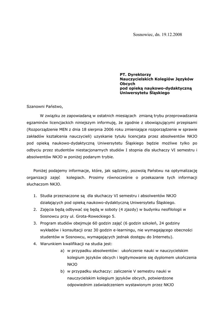 Sosnowiec, dn. 19.12.2008 PT. Dyrektorzy Nauczycielskich Kolegiów Języków Obcych pod opieką naukowo-dydaktyczną Uniwersytetu Śląskiego Szanowni Państwo, W związku ze zapowiadaną w ostatnich miesiącach zmianą trybu przeprowadzania egzaminów licencjackich niniejszym informuję, że zgodnie z obowiązującymi przepisami (Rozporządzenie MEN z dnia 18 sierpnia 2006 roku zmieniające rozporządzenie w sprawie zakładów kształcenia nauczycieli) uzyskanie tytułu licencjata przez absolwentów NKJO pod opieką naukowo-dydaktyczną Uniwersytetu Śląskiego będzie możliwe tylko po odbyciu przez studentów niestacjonarnych studiów I stopnia dla słuchaczy VI semestru i absolwentów NKJO w poniżej podanym trybie. Poniżej podajemy informacje, które, jak sądzimy, pozwolą Państwu na optymalizację organizacji zajęć kolegiach. Prosimy równocześnie o przekazanie tych informacji słuchaczom NKJO. 1. Studia przeznaczone są dla słuchaczy VI semestru i absolwentów NKJO działających pod opieką naukowo-dydaktyczną Uniwersytetu Śląskiego. 2. Zajęcia będą odbywać się będą w soboty (4 zjazdy) w budynku neofilologii w Sosnowcu przy ul. Grota-Roweckiego 5. 3. Program studiów obejmuje 60 godzin zajęć (6 godzin szkoleń, 24 godziny wykładów i konsultacji oraz 30 godzin e-learningu, nie wymagającego obecności studentów w Sosnowcu, wymagających jednak dostępu do Internetu). 4. Warunkiem kwalifikacji na studia jest: a) w przypadku absolwentów: ukończenie nauki w nauczycielskim kolegium języków obcych i legitymowanie się dyplomem ukończenia NKJO b) w przypadku słuchaczy: zaliczenie V semestru nauki w nauczycielskim kolegium języków obcych, potwierdzone odpowiednim zaświadczeniem wystawionym przez NKJO 5. Kandydaci ubiegający się o przyjęcie na studia zobowiązani są do złożenia w Uniwersytecie Śląskim pomiędzy 1 lutego a 20 marca każdego roku następujących dokumentów: a) w przypadku absolwentów: oryginał lub odpis dyplomu ukończenia NKJO b) w przypadku słuchaczy: zaświadczenie o zaliczeniu V semestru nauki w NKJO wystawione przez władze NKJO c) podanie - ankieta osobowa - według ustalonego wzoru. d) oryginał lub odpis świadectwa dojrzałości, e) dwie fotografie, zgodne z wymaganiami stosowanymi przy wydawaniu dowodów osobistych oraz jedną w formie elektronicznej określonej w zarządzeniu Rektora, f) kopię obu stron dowodu osobistego lub innego dokumentu potwierdzającego tożsamość kandydata na studia, g) dowód wniesienia opłaty za studia. 6. Studia są odpłatne. Opłata za semestr wynosi w roku 2008/2009 - 650 zł. 7. Warunkiem złożenia przez kandydatów ubiegających się o studia dokumentów jest wniesienie opłaty za studia. 8. Warunkiem ukończenia studiów jest spełnienie wymagań określonych w planie i programie studiów, tj. otrzymanie zaliczeń i zdanie egzaminów. 9. Studia kończą się egzaminem licencjackim. 10. Warunkiem dopuszczenia do egzaminu licencjackiego jest zdanie wszystkich egzaminów, uzyskanie zaliczeń z przedmiotów objętych planem studiów w Uniwersytecie Śląskim oraz ukończenie nauki w NKJO, potwierdzone dyplomem ukończenia NKJO. 11. Dyplom ukończenia NKJO lub w uzasadnionych przypadkach zaświadczenie o ukończeniu NKJO studenci zobowiązani są przedłożyć sekretarzowi komisji przeprowadzającej egzamin licencjacki w terminie podanym przez Kierownika jednostki, jednak nie później niż na 7 dni przed wyznaczonym terminem tego egzaminu. 12. Egzamin licencjacki jest egzaminem ustnym składanym w języku specjalności. 13. Egzamin licencjacki obejmuje dwa przedmioty: metodykę nauczania języków obcych (obowiązkowo), oraz do wyboru jeden z poniższych przedmiotów: Wybrane zagadnienia językoznawstwa Wybrane zagadnienia literaturoznawstwa. Wybrane zagadnienia realioznawstwa / nauki o kulturze i historii danego obszaru językowego. 14. Warunkiem zdania egzaminu, a więc uzyskania na dyplomie licencjackim oceny pozytywnej, jest uzyskanie ocen pozytywnych z obu zdawanych przedmiotów. 15. Ocena końcowa na dyplomie licencjackim jest średnią uzyskanych ocen. 16. Po ukończeniu studiów student otrzymuje dyplom ich ukończenia. Słuchaczom NKJO informacji dotyczących niestacjonarnych studiów I stopnia dla słuchaczy VI semestru i absolwentów NKJO, udzielać będzie dziekanat Wydziału Filologicznego począwszy od 1 lutego 2009 r. Wszelkie pytania dotyczące organizacji studiów prosimy kierować na adres pocztowy koordynatora studiów: [email protected] Z wyrazami szacunku