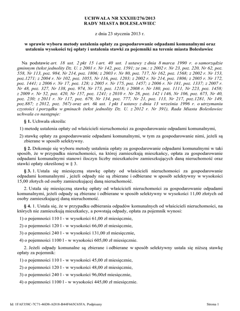 UCHWAŁA NR XXXIII/276/2013 RADY MIASTA BOLESŁAWIEC z dnia 23 stycznia 2013 r. w sprawie wyboru metody ustalenia opłaty za gospodarowanie odpadami komunalnymi oraz ustalenia wysokości tej opłaty i ustalenia stawki za pojemniki na terenie miasta Bolesławiec Na podstawie art. 18 ust. 2 pkt 15 i art. 40 ust. 1 ustawy z dnia 8 marca 1990 r. o samorządzie gminnym (tekst jednolity Dz. U. z 2001 r. Nr 142, poz. 1591; ze zm.: z 2002 r. Nr 23, poz. 220, Nr 62, poz. 558, Nr 113, poz. 984, Nr 214, poz. 1806; z 2003 r. Nr 80, poz. 717, Nr 162, poz. 1568; z 2002 r. Nr 153, poz.1271; z 2004 r. Nr 102, poz. 1055, Nr 116, poz. 1203; z 2002 r. Nr 214, poz. 1806; z 2005 r. Nr 172, poz. 1441; z 2006 r. Nr 17, poz. 128; z 2005 r. Nr 175, poz. 1457; z 2006 r. Nr 181, poz. 1337; z 2007 r. Nr 48, poz. 327, Nr 138, poz. 974, Nr 173, poz. 1218; z 2008 r. Nr 180, poz. 1111, Nr 223, poz. 1458; z 2009 r. Nr 52, poz. 420, Nr 157, poz. 1241; z 2010 r. Nr 28, poz. 142 i 146, Nr 106, poz. 675, Nr 40, poz. 230; z 2011 r. Nr 117, poz. 679, Nr 134, poz. 777, Nr 21, poz. 113, Nr 217, poz.1281, Nr 149, poz.887; z 2012, poz. 567) oraz art. 6k ust. 1 pkt 1 ustawy z dnia 13 września 1996 r. o utrzymaniu czystości i porządku w gminach (tekst jednolity Dz. U. z 2012 r. Nr 391), Rada Miasta Bolesławiec uchwala co następuje: § 1. Uchwała określa: 1) metodę ustalenia opłaty od właścicieli nieruchomości za gospodarowanie odpadami komunalnymi, 2) stawkę opłaty za gospodarowanie odpadami komunalnymi, w tym za gospodarowanie nimi, jeżeli są zbierane w sposób selektywny. § 2. Dokonuje się wyboru metody ustalenia opłaty za gospodarowanie odpadami komunalnymi w taki sposób, że w przypadku nieruchomości, na której zamieszkują mieszkańcy, opłata za gospodarowanie odpadami komunalnymi stanowi iloczyn liczby mieszkańców zamieszkujących daną nieruchomość oraz stawki opłaty określonej w § 3. § 3. 1. Ustala się miesięczną stawkę opłaty od właścicieli nieruchomości za gospodarowanie odpadami komunalnymi , jeżeli odpady nie są zbierane i odbierane w sposób selektywny w wysokości 15,00 złotych od osoby zamieszkującej daną nieruchomość. 2. Ustala się miesięczną stawkę opłaty od właścicieli nieruchomości za gospodarowanie odpadami komunalnymi, jeżeli odpady są zbierane i odbierane w sposób selektywny w wysokości 11,00 złotych od osoby zamieszkującej daną nieruchomość. § 4. 1. Ustala się, że w przypadku odbierania odpadów komunalnych od właścicieli nieruchomości, na których nie zamieszkują mieszkańcy, a powstają odpady, opłata za pojemnik wynosi: 1) o pojemności 110 l - w wysokości 61,00 zł miesięcznie, 2) o pojemności 120 l - w wysokości 66,00 zł miesięcznie, 3) o pojemności 240 l - w wysokości 131,00 zł miesięcznie, 4) o pojemności 1100 l - w wysokości 605,00 zł miesięcznie. 2. Jeżeli odpady komunalne są zbierane i odbierane w sposób selektywny ustala się niższą stawkę opłaty za pojemnik: 1) o pojemności 110 l - w wysokości 45,00 zł miesięcznie, 2) o pojemności 120 l - w wysokości 48,00 zł miesięcznie, 3) o pojemności 240 l - w wysokości 96,00zł miesięcznie, 4) o pojemności 1100 l - w wysokości 445,00 zł miesięcznie. Id: 1FAF358C-7C71-46D8-AD18-B44F665C65FA. Podpisany Strona 1 § 5. Wykonanie uchwały powierza się Prezydentowi Miasta Bolesławiec. § 6. Uchwała wchodzi w życie po upływie 14 dni od dnia ogłoszenia w Dzienniku Urzędowym Województwa Dolnośląskiego. SM/SM Przewodniczący Rady Miasta Józef Pokładek Id: 1FAF358C-7C71-46D8-AD18-B44F665C65FA. Podpisany Strona 2 Uzasadnienie Zgodnie z art. 6k ustawy z dnia 13 września 1996 r. o utrzymaniu czystości i porządku w gminach rada miasta w drodze uchwały dokona wyboru jednej z określonych w art. 6j ust. 1 i 2 metod ustalenia opłaty za gospodarowanie odpadami komunalnymi oraz ustali stawkę takiej opłaty. Również ustali stawkę opłaty za pojemnik w określonej pojemności. Rada miasta, określając stawki opłaty za gospodarowanie odpadami komunalnymi bierze pod uwagę: liczbę mieszkańców zamieszkujących daną gminę, ilość wytwarzanych na terenie gminy odpadów komunalnych, koszty funkcjonowania systemu gospodarowania odpadami komunalnymi, o których mowa w art. 6r ust.2. Opłata za gospodarowanie odpadami komunalnymi, zgodnie z art. 6j ww ustawy, stanowi iloczyn stawki opłaty oraz: liczby mieszkańców zamieszkujących daną nieruchomość, albo ilości zużytej wody z danej nieruchomości, albo powierzchni lokalu mieszkalnego. Dopuszcza się również przyjęcie jednej stawki opłaty zagospodarowanie odpadami komunalnymi od gospodarstwa domowego. Mając do wyboru powyższe metody, proponuje się aby w mieście Bolesławiec, opłata za gospodarowanie odpadmi komunalnymi stanowiła iloczyn liczby mieszkańców zamieszkujących daną nieruchomość oraz stawki opłaty. W wyniku przeprowadzonych analiz oceniono, że metoda ta stanowi sprawiedliwą i powszechną metodę zbierania opłat, a także zgodną z zasadą „zanieczyszczający płaci”. Zgodnie z cytowaną ustawą Rada Miasta ma obowiązek określić niższe stawki opłaty za gospodarowanie odpadami komunalnymi, jeżeli odpady komunalne są zbierane i odbierane w sposób selektywny. W projekcie uchwały uwzględniono wymogi ustawowe, proponując obniżenie stawki opłaty, jeżeli odpady zbierane są w sposób selektywny. Zastosowanie niższych stawek ma stanowić istotną zachętę do selektywnego gromadzenia odpadów. Wymieniona ustawa nakłada na gminy obowiązek osiągnięcia do 31 grudnia 2020 r. odpowiednich poziomów recyklingu i przygotowania do ponownego użycia m.in. następujących frakcji odpadów komunalnych: papieru, metali, tworzyw sztucznych i szkła. Zastosowanie niższych stawek powinno pozwolić gminie na realizację tego celu. Dane niezbędne do wyliczenia opłat: I. Liczba mieszkańców: 1. Liczba mieszkańców zameldowanych w Bolesławcu (stałe i czasowe) wg stanu 