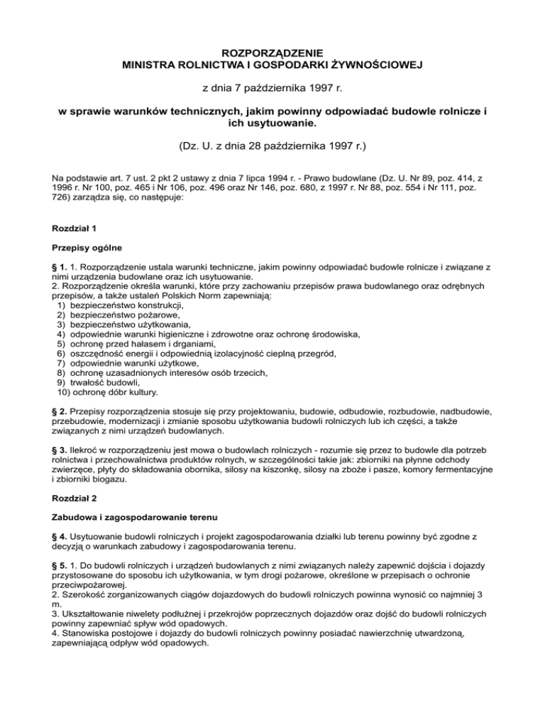 ROZPORZĄDZENIE MINISTRA ROLNICTWA I GOSPODARKI ŻYWNOŚCIOWEJ z dnia 7 października 1997 r. w sprawie warunków technicznych, jakim powinny odpowiadać budowle rolnicze i ich usytuowanie. (Dz. U. z dnia 28 października 1997 r.) Na podstawie art. 7 ust. 2 pkt 2 ustawy z dnia 7 lipca 1994 r. - Prawo budowlane (Dz. U. Nr 89, poz. 414, z 1996 r. Nr 100, poz. 465 i Nr 106, poz. 496 oraz Nr 146, poz. 680, z 1997 r. Nr 88, poz. 554 i Nr 111, poz. 726) zarządza się, co następuje: Rozdział 1 Przepisy ogólne § 1. 1. Rozporządzenie ustala warunki techniczne, jakim powinny odpowiadać budowle rolnicze i związane z nimi urządzenia budowlane oraz ich usytuowanie. 2. Rozporządzenie określa warunki, które przy zachowaniu przepisów prawa budowlanego oraz odrębnych przepisów, a także ustaleń Polskich Norm zapewniają: 1) bezpieczeństwo konstrukcji, 2) bezpieczeństwo pożarowe, 3) bezpieczeństwo użytkowania, 4) odpowiednie warunki higieniczne i zdrowotne oraz ochronę środowiska, 5) ochronę przed hałasem i drganiami, 6) oszczędność energii i odpowiednią izolacyjność cieplną przegród, 7) odpowiednie warunki użytkowe, 8) ochronę uzasadnionych interesów osób trzecich, 9) trwałość budowli, 10) ochronę dóbr kultury. § 2. Przepisy rozporządzenia stosuje się przy projektowaniu, budowie, odbudowie, rozbudowie, nadbudowie, przebudowie, modernizacji i zmianie sposobu użytkowania budowli rolniczych lub ich części, a także związanych z nimi urządzeń budowlanych. § 3. Ilekroć w rozporządzeniu jest mowa o budowlach rolniczych - rozumie się przez to budowle dla potrzeb rolnictwa i przechowalnictwa produktów rolnych, w szczególności takie jak: zbiorniki na płynne odchody zwierzęce, płyty do składowania obornika, silosy na kiszonkę, silosy na zboże i pasze, komory fermentacyjne i zbiorniki biogazu. Rozdział 2 Zabudowa i zagospodarowanie terenu § 4. Usytuowanie budowli rolniczych i projekt zagospodarowania działki lub terenu powinny być zgodne z decyzją o warunkach zabudowy i zagospodarowania terenu. § 5. 1. Do budowli rolniczych i urządzeń budowlanych z nimi związanych należy zapewnić dojścia i dojazdy przystosowane do sposobu ich użytkowania, w tym drogi pożarowe, określone w przepisach o ochronie przeciwpożarowej. 2. Szerokość zorganizowanych ciągów dojazdowych do budowli rolniczych powinna wynosić co najmniej 3 m. 3. Ukształtowanie niwelety podłużnej i przekrojów poprzecznych dojazdów oraz dojść do budowli rolniczych powinny zapewniać spływ wód opadowych. 4. Stanowiska postojowe i dojazdy do budowli rolniczych powinny posiadać nawierzchnię utwardzoną, zapewniającą odpływ wód opadowych. § 6. 1. Do usuwania i magazynowania odchodów pochodzenia zwierzęcego powinny być przewidziane urządzenia i zbiorniki dostosowane do systemów technologicznych utrzymywania zwierząt, zwane dalej "zbiornikami na płynne odchody zwierzęce". 2. Zbiorniki na płynne odchody zwierzęce powinny mieć dno i ściany nieprzepuszczalne; zbiorniki zamknięte powinny być szczelnie przykryte płytą zaopatrzoną w otwór wejściowy i wentylacyjny. 3. Odległości zamkniętych zbiorników na płynne odchody zwierzęce, mierzone od pokryw i wylotów wentylacyjnych powinny wynosić co najmniej: 1) od otworów okiennych i drzwiowych pomieszczeń przeznaczonych na pobyt ludzi na działkach sąsiednich- 15 m, 2) od magazynów środków spożywczych, a także obiektów budowlanych przetwórstwa rolnospożywczego- 15 m, 3) od granicy działki sąsiedniej - 4 m, 4) od budynków magazynowych ogólnych - 5 m, 5) od silosów na zboże i pasze - 5 m, 6) od silosów na kiszonki - 5 m. 4. Odległość otwartych zbiorników na płynne odchody zwierzęce o pojemności do 200 m3 oraz płyt gnojowych powinna wynosić co najmniej: 1) od otworów okiennych i drzwiowych pomieszczeń przeznaczonych na pobyt ludzi na działkach sąsiednich- 30 m, 2) od budynków przetwórstwa rolno-spożywczego i magazynów środków spożywczych - 50 m, 3) od budynków magazynowych pasz i ziarna - 10 m, 4) od granicy działki sąsiedniej - 4 m, 5) od silosów na zboże i pasze - 5 m, 6) od silosów na kiszonki - 10 m. 5. Dopuszcza się sytuowanie zbiorników na płynne odchody zwierzęce w odległościach mniejszych niż określone w ust. 3 pkt 3 i ust. 4 pkt 4 lub na granicy działek, w wypadku gdy będą przylegać do tego samego rodzaju zbiorników na działce sąsiedniej. 6. Odległość otwartych zbiorników na płynne odchody zwierzęce o pojemności większej niż 200 m3 od obiektów budowlanych wymienionych w ust. 4 i od granicy działki sąsiedniej określa się indywidualnie w decyzji o warunkach zabudowy i zagospodarowania terenu w uzgodnieniu z właściwym państwowym wojewódzkim inspektorem sanitarnym. § 7. 1. Odległości komór fermentacyjnych i zbiorników biogazu o pojemności do 100 m3 powinny wynosić co najmniej: 1) od otworów okiennych i drzwiowych pomieszczeń przeznaczonych na pobyt ludzi oraz od budynków inwentarskich- 15 m, 2) od innych budynków - 8 m, 3) od granicy działki sąsiedniej - 5 m, 4) od składu węgla i koksu - 15 m, 5) od innych komór fermentacyjnych i zbiorników biogazu - 15 m, 6) od silosów na zboże i pasze o pojemności większej niż 100 ton - 15 m, 7) od innych obiektów budowlanych nie będących budynkami - 5 m. 2. Zbiorniki biogazu i komory fermentacyjne o pojemności większej niż 100 m3 powinny być lokalizowane na działkach przeznaczonych wyłącznie dla biogazowni, a odległości, o których mowa w ust. 1, powinny być co najmniej dwukrotnie większe. § 8. Odległość silosów na zboże i pasze o pojemności większej niż 100 ton powinna wynosić co najmniej: 1) od otworów okiennych i drzwiowych pomieszczeń przeznaczonych na pobyt ludzi oraz od budynków inwentarskich- 15 m, 2) od innych budynków - 8 m, 3) od biogazowni - 15 m, 4) od składu węgla i koksu - 15 m, 5) od granicy działki sąsiedniej - 5 m. § 9. Od