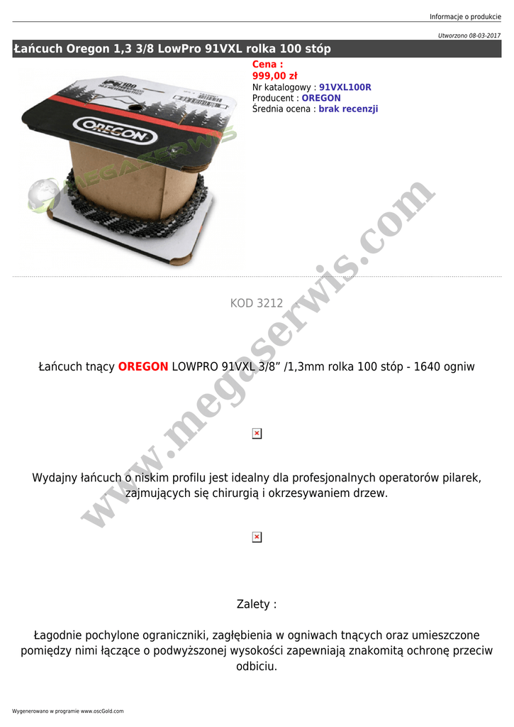 Informacje o produkcie Utworzono 08-03-2017 Łańcuch Oregon 1,3 3/8 LowPro 91VXL rolka 100 stóp Cena : 999,00 zł rw is .c om Nr katalogowy : 91VXL100R Producent : OREGON Średnia ocena : brak recenzji eg as e KOD 3212 w .m Łańcuch tnący OREGON LOWPRO 91VXL 3/8” /1,3mm rolka 100 stóp - 1640 ogniw w w Wydajny łańcuch o niskim profilu jest idealny dla profesjonalnych operatorów pilarek, zajmujących się chirurgią i okrzesywaniem drzew. Zalety : Łagodnie pochylone ograniczniki, zagłębienia w ogniwach tnących oraz umieszczone pomiędzy nimi łączące o podwyższonej wysokości zapewniają znakomitą ochronę przeciw odbiciu. Wygenerowano w programie www.oscGold.com · Ogniwa tnące w kształcie ściętego dłuta o ostrym profilu z dwoma narożami tnącymi charakteryzują się niską wibracją i zmniejszonym odbiciem oraz zapewniają znakomitą wydajność i trwałość, wymagając przy tym mniej konserwacji niż łańcuchy z ogniwami tnącymi o profilu zaokrąglonym. · Zalecany do pilarek spalinowych od 30 do 40cm3. rw is .c om Zastosowana w konstrukcji koncepcja Vibe-Ban pozwoliła ograniczyć poziom wibracji o co najmniej 25% na uchwytach pilarki. .m eg as e · Ogniwa łączące typu Lubrilink pomagają przytrzymać olej tam, gdzie jest on potrzebny – czyli na łańcuchu. w w w · Otwory smarowne Lubriwell w ogniwach prowadzących łańcucha tnącego pomagają rozprowadzić olej na całej długości rowka prowadnicy Ten łańcuch pasuje również do urządzeń: Alpina: 270 280 330 380 432 438 EURO-40 EURO-45 Elletra 160 Elletra 170 Energy 1.6 Energy 1.8 P360 P370 P390 PR350 Sinergy 35 Sinergy 40 Informacje o produkcie Dolmar: CS2040 PS3300TH McCulloch: 3500 370 374 375 384 400 400P 430 442 445 470 474 484 838 839 ELECTRA MAC 16E MAC MAC110 MAC120 MAC130 MAC140 MAC4 MAC6 MAC930 MAC935 MC115 MM30 MM36 PM310 PM320 PM330 PM340 PM36 PM360 PM364 PM370 PM380 PM394 PM400 PM470 PM480 PM484 PM510 PM730 Oleo-Mac: Ryobi: 1535EL 1540 1540EL 1640 1835 1840 352 371 391 538E 542E P1535 P351 is .c om Partner: 240 936 OEM200 35B CS1530 CS1535 CS1540 CS36C CS41 CSE3330 CSE385CB HC31 HC36 HC41 HCS31 HCS36 w w w .m eg as e rw Stihl: 009 010 011 012 017 018 019 019T 020 020T 021 021C 023 025 25 MS160 MS170 MS180 MS191 MS192 MS200 MS200T MS210 MS211 MS230 MS231 MS241 MS250 MS251 MSE140 MSE200 Wygenerowano w programie www.oscGold.com is .c om rw eg as e .m w w w