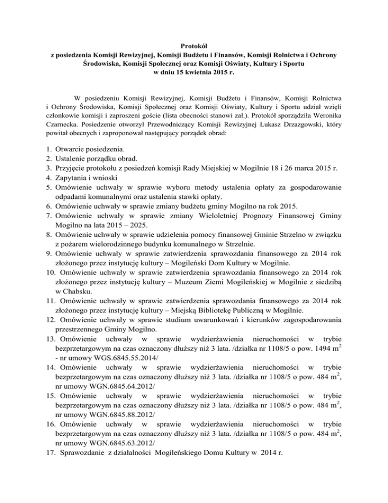 Protokół z posiedzenia Komisji Rewizyjnej, Komisji Budżetu i Finansów, Komisji Rolnictwa i Ochrony Środowiska, Komisji Społecznej oraz Komisji Oświaty, Kultury i Sportu w dniu 15 kwietnia 2015 r. W posiedzeniu Komisji Rewizyjnej, Komisji Budżetu i Finansów, Komisji Rolnictwa i Ochrony Środowiska, Komisji Społecznej oraz Komisji Oświaty, Kultury i Sportu udział wzięli członkowie komisji i zaproszeni goście (lista obecności stanowi zał.). Protokół sporządziła Weronika Czarnecka. Posiedzenie otworzył Przewodniczący Komisji Rewizyjnej Łukasz Drzazgowski, który powitał obecnych i zaproponował następujący porządek obrad: 1. 2. 3. 4. 5. Otwarcie posiedzenia. Ustalenie porządku obrad. Przyjęcie protokołu z posiedzeń komisji Rady Miejskiej w Mogilnie 18 i 26 marca 2015 r. Zapytania i wnioski Omówienie uchwały w sprawie wyboru metody ustalenia opłaty za gospodarowanie odpadami komunalnymi oraz ustalenia stawki opłaty. 6. Omówienie uchwały w sprawie zmiany budżetu gminy Mogilno na rok 2015. 7. Omówienie uchwały w sprawie zmiany Wieloletniej Prognozy Finansowej Gminy Mogilno na lata 2015 – 2025. 8. Omówienie uchwały w sprawie udzielenia pomocy finansowej Gminie Strzelno w związku z pożarem wielorodzinnego budynku komunalnego w Strzelnie. 9. Omówienie uchwały w sprawie zatwierdzenia sprawozdania finansowego za 2014 rok złożonego przez instytucję kultury – Mogileński Dom Kultury w Mogilnie. 10. Omówienie uchwały w sprawie zatwierdzenia sprawozdania finansowego za 2014 rok złożonego przez instytucję kultury – Muzeum Ziemi Mogileńskiej w Mogilnie z siedzibą w Chabsku. 11. Omówienie uchwały w sprawie zatwierdzenia sprawozdania finansowego za 2014 rok złożonego przez instytucję kultury – Miejską Bibliotekę Publiczną w Mogilnie. 12. Omówienie uchwały w sprawie studium uwarunkowań i kierunków zagospodarowania przestrzennego Gminy Mogilno. 13. Omówienie uchwały w sprawie wydzierżawienia nieruchomości w trybie bezprzetargowym na czas oznaczony dłuższy niż 3 lata. /działka nr 1108/5 o pow. 1494 m 2 - nr umowy WGS.6845.55.2014/ 14. Omówienie uchwały w sprawie wydzierżawienia nieruchomości w trybie bezprzetargowym na czas oznaczony dłuższy niż 3 lata. /działka nr 1108/5 o pow. 484 m 2, nr umowy WGN.6845.64.2012/ 15. Omówienie uchwały w sprawie wydzierżawienia nieruchomości w trybie bezprzetargowym na czas oznaczony dłuższy niż 3 lata. /działka nr 1108/5 o pow. 484 m 2, nr umowy WGN.6845.88.2012/ 16. Omówienie uchwały w sprawie wydzierżawienia nieruchomości w trybie bezprzetargowym na czas oznaczony dłuższy niż 3 lata. /działka nr 1108/5 o pow. 484 m2, nr umowy WGN.6845.63.2012/ 17. Sprawozdanie z działalności Mogileńskiego Domu Kultury w 2014 r. 18. Sprawozdanie z działalności Muzeum Ziemi Mogileńskiej w Mogilnie z siedzibą w Chabsku za rok 2014. 19. Sprawozdanie z działalności Zespołu Obsługi Szkół i Przedszkoli w Mogilnie za rok 2014. 20. Sprawozdanie z działalności Miejskiej Biblioteki Publicznej w Mogilnie za rok 2014 21. Roczne sprawozdanie Komendanta Powiatowego Policji w Mogilnie ze swojej działalności wraz z informacją o stanie bezpieczeństwa i porządku publicznego w Powiecie Mogileńskim w 2014 r. 22. Informacja na temat działalności Gminnej Komisji Rozwiązywania Problemów Alkoholowych 23. Zakończenie. Radni nie zgłosili uwag do porządku obrad komisji. Ad.3 W punkcie nie podjęto dyskusji. Protokoły przyjęto. Ad.4 W punkcie nie podjęto dyskusji. Ad. 5 Zastępca Burmistrza Jarosław Ciesielski stwierdził, że przedmiotowa uchwała jest z rodzaju tych, które niechętnie przedkłada się radzie. Wiąże się z obciążeniem mieszkańców dodatkowymi opłatami - zwiększeniem opłaty za gospodarkę odpadami. Wyjaśnił, że nie ma innego wyjścia, ponieważ prawo zostało skonstruowane tak, że na gminie ciąży obowiązek ogłoszenia przetargu na odbiór odpadów od mieszkańców. W ogłoszonym przetargu jasno zostało określone główne kryterium – cena za usługę. Do Urzędu wpłynęły 2 oferty, z których wybrano ofertę tańszą, jednak jest ona wyższa od obowiązującej ceny. System gospodarowania odpadami musi się samobilansować, gmina nie może finansować odbioru odpadów. W związku z tym, skoro kontrakt jest wyższy, gmina nie ma innego wyjścia, jak tylko zaproponować radnym podniesienie opłaty za odbiór śmieci, o kwotę ujętą w projekcie uchwały. Zastępca Burmistrza poinformował zebranych, że w obradach komisji uczestniczą: radca prawny, pracownicy wydziału merytorycznego oraz prezes firmy, która wygrała przetarg, którzy odpowiedzą na wszelkie wątpliwości radnych. Radny Konrad Andrzejewski powiedział, że w pierwszym przetargu oferta Mogileńskiego Przedsiębiorstwa Gospodarki Komunalnej wynosiła ok. 2,7 mln zł. Kontynuował, że za ostatni rok opłacało się wywozić śmieci za 1,85 mln zł, taką kwotę wykazano w sprawozdaniu budżetowy MPGK. W sprawozdaniu nie wykazano także, by firma poniosła straty. Radnego dziwi fakt podniesienia opłaty o kwotę ok. 1 mln zł, ponieważ paliwo staniało, nie było żadnych drastycznych podwyżek, a z podatku od nieruchomości MPGK sp. z o.o. jest zwolnione. W jego opinii podwyżka jest kolosalna. Radny poprosił o odpowiedź, jakie czynniki wpłynęły na to, że nie opłaca się wywozić śmieci za kwotę 1,85 mln zł, czy za 2,1 mln zł. Zastępca burmistrza zauważył, że radny Konrad Andrzejewski zapomniał, iż firma MPGK sp. z o.o. została wyłoniona w przetargu nieograniczonym, do którego mogła przystąpić każda firma w Polsce. Podkreślił, iż nie jest winą burmistrza, że do przetargu stanęły 2 firmy. Faktycznie, gdyby stanęły 22 firmy to może byłaby większa różnorodność ofert, jednak nie znalazł się nikt, kto chciałby wywozić śmieci taniej. Poinformował, że firma, która złożyła drugą ofertę przedstawiła kwotę o 30% wyższą od MPGK. Rad