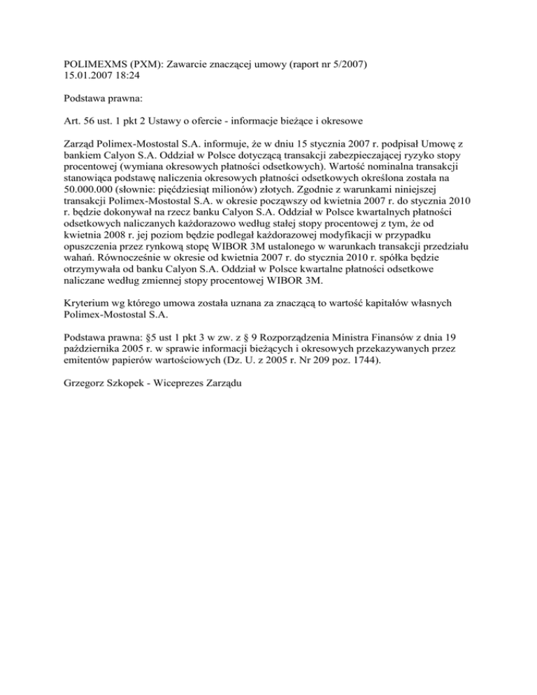 POLIMEXMS (PXM): Zawarcie znaczącej umowy (raport nr 5/2007) 15.01.2007 18:24 Podstawa prawna: Art. 56 ust. 1 pkt 2 Ustawy o ofercie - informacje bieŜące i okresowe Zarząd Polimex-Mostostal S.A. informuje, Ŝe w dniu 15 stycznia 2007 r. podpisał Umowę z bankiem Calyon S.A. Oddział w Polsce dotyczącą transakcji zabezpieczającej ryzyko stopy procentowej (wymiana okresowych płatności odsetkowych). Wartość nominalna transakcji stanowiąca podstawę naliczenia okresowych płatności odsetkowych określona została na 50.000.000 (słownie: pięćdziesiąt milionów) złotych. Zgodnie z warunkami niniejszej transakcji Polimex-Mostostal S.A. w okresie począwszy od kwietnia 2007 r. do stycznia 2010 r. będzie dokonywał na rzecz banku Calyon S.A. Oddział w Polsce kwartalnych płatności odsetkowych naliczanych kaŜdorazowo według stałej stopy procentowej z tym, Ŝe od kwietnia 2008 r. jej poziom będzie podlegał kaŜdorazowej modyfikacji w przypadku opuszczenia przez rynkową stopę WIBOR 3M ustalonego w warunkach transakcji przedziału wahań. Równocześnie w okresie od kwietnia 2007 r. do stycznia 2010 r. spółka będzie otrzymywała od banku Calyon S.A. Oddział w Polsce kwartalne płatności odsetkowe naliczane według zmiennej stopy procentowej WIBOR 3M. Kryterium wg którego umowa została uznana za znaczącą to wartość kapitałów własnych Polimex-Mostostal S.A. Podstawa prawna: §5 ust 1 pkt 3 w zw. z § 9 Rozporządzenia Ministra Finansów z dnia 19 października 2005 r. w sprawie informacji bieŜących i okresowych przekazywanych przez emitentów papierów wartościowych (Dz. U. z 2005 r. Nr 209 poz. 1744). Grzegorz Szkopek - Wiceprezes Zarządu