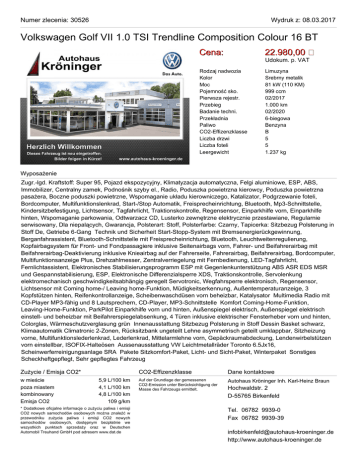 Numer zlecenia: 30526 Wydruk z: 08.03.2017 Volkswagen Golf VII 1.0 TSI Trendline Composition Colour 16 BT Cena: 22.980,00 Rodzaj nadwozia Kolor Moc Pojemność sko. Pierwsza rejestr. Przebieg Badanie techni. Przekładnia Paliwo CO2-Effizenzklasse Liczba drzwi Liczba foteli Leergewicht Limuzyna Srebrny metalik 81 kW (110 KM) 999 ccm 02/2017 1.000 km 02/2020 6-biegowa Benzyna B 5 5 1.237 kg Udokum. p. VAT Wyposażenie Zugr.-lgd. Kraftstoff: Super 95, Pojazd ekspozycyjny, Klimatyzacja automatyczna, Felgi aluminiowe, ESP, ABS, Immobilizer, Centralny zamek, Podnośnik szyby el., Radio, Poduszka powietrzna kierowcy, Poduszka powietrzna pasażera, Boczne poduszki powietrzne, Wspomaganie układu kierowniczego, Katalizator, Podgrzewanie foteli, Bordcomputer, Multifunktionslenkrad, Start-/Stop Automatik, Freisprecheinrichtung, Bluetooth, Mp3-Schnittstelle, Kindersitzbefestigung, Lichtsensor, Tagfahrlicht, Traktionskontrolle, Regensensor, Einparkhilfe vorn, Einparkhilfe hinten, Wspomaganie parkowania, Odtwarzacz CD, Lusterko zewnętrzne elektrycznie przestawiane, Regularnie serwisowany, Dla niepalących, Gwarancja, Polsterart: Stoff, Polsterfarbe: Czarny, Tapicerka: Sitzbezug Polsterung in Stoff De, Getriebe 6-Gang Technik und Sicherheit Start-Stopp-System mit Bremsenergierückgewinnung, Berganfahrassistent, Bluetooth-Schnittstelle mit Freisprecheinrichtung, Bluetooth, Leuchtweitenregulierung, Kopfairbagsystem für Front- und Fondpassagiere inklusive Seitenairbags vorn, Fahrer- und Beifahrerairbag mit Beifahrerairbag-Deaktivierung inklusive Knieairbag auf der Fahrerseite, Fahrerairbag, Beifahrerairbag, Bordcomputer, Multifunktionsanzeige Plus, Drehzahlmesser, Zentralverriegelung mit Fernbedienung, LED-Tagfahrlicht, Fernlichtassistent, Elektronisches Stabilisierungsprogramm ESP mit Gegenlenkunterstützung ABS ASR EDS MSR und Gespannstabilisierung, ESP, Elektronische Differenzialsperre XDS, Traktionskontrolle, Servolenkung elektromechanisch geschwindigkeitsabhängig geregelt Servotronic, Wegfahrsperre elektronisch, Regensensor, Lichtsensor mit Coming home-/ Leaving home-Funktion, Müdigkeitserkennung, Außentemperaturanzeige, 3 Kopfstützen hinten, Reifenkontrollanzeige, Scheibenwaschdüsen vorn beheizbar, Katalysator Multimedia Radio mit CD-Player MP3-fähig und 8 Lautsprechern, CD-Player, MP3-Schnittstelle Komfort Coming-Home-Funktion, Leaving-Home-Funktion, ParkPilot Einparkhilfe vorn und hinten, Außenspiegel elektrisch, Außenspiegel elektrisch einstell- und beheizbar mit Beifahrerspiegelabsenkung, 4 Türen inklusive elektrischer Fensterheber vorn und hinten, Colorglas, Wärmeschutzverglasung grün Innenausstattung Sitzbezug Polsterung in Stoff Dessin Basket schwarz, Klimaautomatik Climatronic 2-Zonen, Rücksitzbank ungeteilt Lehne asymmetrisch geteilt umklappbar, Sitzheizung vorne, Multifunktionslederlenkrad, Lederlenkrad, Mittelarmlehne vorn, Gepäckraumabdeckung, Lendenwirbelstützen vorn einstellbar, ISOFIX-Halteösen Aussenausstattung VW Leichtmetallräder Toronto 6.5Jx16, Scheinwerferreinigungsanlage SRA Pakete Sitzkomfort-Paket, Licht- und Sicht-Paket, Winterpaket Sonstiges Scheckheftgepflegt, Sehr gepflegtes Fahrzeug Zużycie / Emisja CO2* w mieście poza miastem kombinowany Emisja CO2 5,9 L/100 km 4,1 L/100 km 4,8 L/100 km 109 g/km * Dodatkowe oficjalne informacje o zużyciu paliwa i emisji CO2 nowych samochodów osobowych można znaleźć w przewodniku zużycia paliwa i emisji CO2 nowych samochodów osobowych, dostępnym bezpłatnie we wszystkich punktach sprzedaży oraz w Deutschen Automobil Treuhand GmbH pod adresem www.dat.de CO2-Effizenzklasse Dane kontaktowe Auf der Grundlage der gemessenen CO2-Emission unter Berücksichtigung der Masse des Fahrzeugs ermittelt. Autohaus Kröninger Inh. Karl-Heinz Braun Hochwaldstr. 2 D-55765 Birkenfeld Tel. 06782 9939-0 Fax 06782 9939-39 [email protected] http://www.autohaus-kroeninger.de Numer zlecenia: 30526 Wydruk z: 08.03.2017 Volkswagen Golf VII 1.0 TSI Trendline Composition Colour 16 BT
