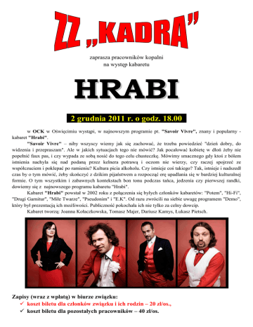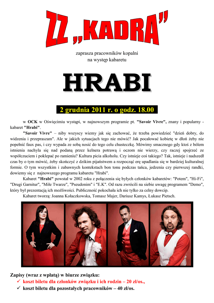 zaprasza pracowników kopalni na występ kabaretu HRABI ..2 grudnia 2011 r. o godz. 18.00.. w OCK w Oświęcimiu wystąpi, w najnowszym programie pt. "Savoir Vivre", znany i popularny kabaret "Hrabi". "Savoir Vivre" – niby wszyscy wiemy jak się zachować, że trzeba powiedzieć "dzień dobry, do widzenia i przepraszam". Ale w jakich sytuacjach tego nie mówić? Jak pocałować kobietę w dłoń żeby nie popełnić faux pas, i czy wypada ze sobą nosić do tego celu chusteczkę. Mówimy smacznego gdy ktoś z bólem istnienia nachyla się nad podaną przez kelnera potrawą i oczom nie wierzy, czy raczej spojrzeć ze współczuciem i poklepać po ramieniu? Kultura picia alkoholu. Czy istnieje coś takiego? Tak, istnieje i nadszedł czas by o tym mówić, żeby skończyć z dzikim pijaństwem a rozpocząć erę upadlania się w bardziej kulturalnej formie. O tym wszystkim i zabawnych kontekstach bon tonu podczas tańca, jedzenia czy pierwszej randki, dowiemy się z najnowszego programu kabaretu "Hrabi". Kabaret "Hrabi" powstał w 2002 roku z połączenia się byłych członków kabaretów: "Potem", "Hi-Fi", "Drugi Garnitur", "Miłe Twarze", "Pseudonim" i "E.K". Od razu zwrócili na siebie uwagę programem "Demo", który był prezentacją ich możliwości. Publiczność pokochała ich nie tylko za celny dowcip. Kabaret tworzą: Joanna Kołaczkowska, Tomasz Majer, Dariusz Kamys, Łukasz Pietsch. Zapisy (wraz z wpłatą) w biurze związku: koszt biletu dla członków związku i ich rodzin – 20 zł/os., koszt biletu dla pozostałych pracowników – 40 zł/os.