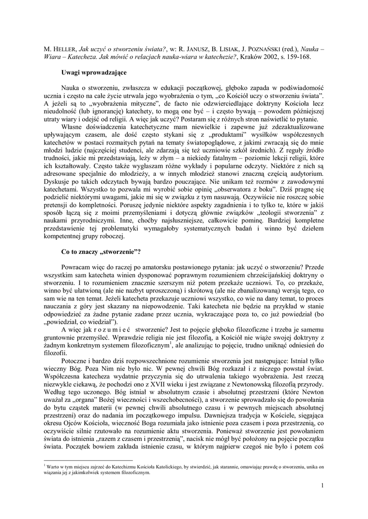 M. HELLER, Jak uczyć o stworzeniu świata?, w: R. JANUSZ, B. LISIAK, J. POZNAŃSKI (red.), Nauka – Wiara – Katecheza. Jak mówić o relacjach nauka-wiara w katechezie?, Kraków 2002, s. 159-168. Uwagi wprowadzające Nauka o stworzeniu, zwłaszcza w edukacji początkowej, głęboko zapada w podświadomość ucznia i często na całe życie utrwala jego wyobrażenia o tym, „co Kościół uczy o stworzeniu świata”. A jeżeli są to „wyobrażenia mityczne”, de facto nie odzwierciedlające doktryny Kościoła lecz nieudolność (lub ignorancję) katechety, to mogą one być – i często bywają – powodem późniejszej utraty wiary i odejść od religii. A więc jak uczyć? Postaram się z różnych stron naświetlić to pytanie. Własne doświadczenia katechetyczne mam niewielkie i zapewne już zdezaktualizowane upływającym czasem, ale dość często stykani się z „produktami” wysiłków współczesnych katechetów w postaci rozmaitych pytań na tematy światopoglądowe, z jakimi zwracają się do mnie młodzi ludzie (najczęściej studenci, ale zdarzają się też uczniowie szkół średnich). Z reguły źródło trudności, jakie mi przedstawiają, leży w złym – a niekiedy fatalnym – poziomie lekcji religii, które ich kształtowały. Często także wygłaszam różne wykłady i popularne odczyty. Niektóre z nich są adresowane specjalnie do młodzieży, a w innych młodzież stanowi znaczną częścią audytorium. Dyskusje po takich odczytach bywają bardzo pouczające. Nie unikam też rozmów z zawodowymi katechetami. Wszystko to pozwala mi wyrobić sobie opinię „obserwatora z boku”. Dziś pragnę się podzielić niektórymi uwagami, jakie mi się w związku z tym nasuwają. Oczywiście nie roszczę sobie pretensji do kompletności. Poruszę jedynie niektóre aspekty zagadnienia i to tylko te, które w jakiś sposób łączą się z moimi przemyśleniami i dotyczą głównie związków „teologii stworzenia” z naukami przyrodniczymi. Inne, choćby najsłuszniejsze, całkowicie pominę. Bardziej kompletne przedstawienie tej problematyki wymagałoby systematycznych badań i winno być dziełem kompetentnej grupy roboczej. Co to znaczy „stworzenie”? Powracam więc do raczej po amatorsku postawionego pytania: jak uczyć o stworzeniu? Przede wszystkim sam katecheta winien dysponować poprawnym rozumieniem chrześcijańskiej doktryny o stworzeniu. I to rozumieniem znacznie szerszym niż potem przekaże uczniowi. To, co przekaże, winno być ułatwioną (ale nie nazbyt uproszczoną) i skrótową (ale nie zbanalizowaną) wersją tego, co sam wie na ten temat. Jeżeli katecheta przekazuje uczniowi wszystko, co wie na dany temat, to proces nauczania z góry jest skazany na niepowodzenie. Taki katecheta nie będzie na przykład w stanie odpowiedzieć za żadne pytanie zadane przez ucznia, wykraczające poza to, co już powiedział (bo „powiedział, co wiedział”). A więc jak r o z u m i e ć stworzenie? Jest to pojęcie głęboko filozoficzne i trzeba je samemu gruntownie przemyśleć. Wprawdzie religia nie jest filozofią, a Kościół nie wiąże swojej doktryny z żadnym konkretnym systemem filozoficznym1, ale analizując to pojęcie, trudno uniknąć odniesień do filozofii. Potoczne i bardzo dziś rozpowszechnione rozumienie stworzenia jest następujące: Istniał tylko wieczny Bóg. Poza Nim nie było nic. W pewnej chwili Bóg rozkazał i z niczego powstał świat. Współczesna katecheza wydatnie przyczynia się do utrwalenia takiego wyobrażenia. Jest rzeczą niezwykle ciekawą, że pochodzi ono z XVII wieku i jest związane z Newtonowską filozofią przyrody. Według tego uczonego. Bóg istniał w absolutnym czasie i absolutnej przestrzeni (które Newton uważał za „organa” Bożej wieczności i wszechobecności), a stworzenie sprowadzało się do powołania do bytu cząstek materii (w pewnej chwili absolutnego czasu i w pewnych miejscach absolutnej przestrzeni) oraz do nadania im początkowego impulsu. Dawniejsza tradycja w Kościele, sięgająca okresu Ojców Kościoła, wieczność Boga rozumiała jako istnienie poza czasem i poza przestrzenią, co oczywiście silnie rzutowało na rozumienie aktu stworzenia. Ponieważ stworzenie jest powołaniem świata do istnienia „razem z czasem i przestrzenią”, nacisk nie mógł być położony na pojęcie początku świata. Początek bowiem zakłada istnienie czasu, w którym najpierw czegoś nie było i potem coś Warto w tym miejscu zajrzeć do Katechizmu Kościoła Katolickiego, by stwierdzić, jak starannie, omawiając prawdę o stworzeniu, unika on wiązania jej z jakimkolwiek systemem filozoficznym. 1 1 zaistniało. A według tradycyjnego rozumienia nie istniała taka chwila czasu, w której świata nie było. Świat bowiem został stworzony „z czasem”. Ostrożnie zatem z formułą „stworzyć to zrobić coś z niczego”. Jest ona chwytliwa i poprawna, jeśli ją odpowiednio rozumieć, ale myląca. Należy już od początkowego nauczania przekazywać uczniom przekonanie, że akt stworzenia nie wyczerpuje się w zapoczątkowaniu istnienia, lecz jest nieustannym „dawaniem istnienia” lub „podtrzymywaniem w istnieniu”. Prawdę tę można przekazać nawet najmłodszym za pomocą odpowiednio dobranych porównań. Dlaczego jest to takie ważne? Już w starszych klasach w książkach popularno-naukowych (lub przez Internet) uczeń może spotkać się z informacją, że we współczesnej kosmologii konstruuje się różne modele kwantowego stwarzania Wszechświata z nicości. Jeżeli będzie on pamiętać, że stwarzanie jest aktem ciągłym a nie tylko zapoczątkowaniem istnienia, nie będzie miał kłopotów z rozróżnieniem stworzenia w sensie kwantowych modeli kosmologicznych i stworzeniem w sensie religijnym. Jeżeli nawet uczeń nigdy nie spotka się z bądź co bądź naukowo wyrafinowanymi modelami kwantowego stwarzania, to prędzej czy później (raczej prędzej niż póź