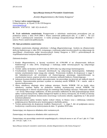 ZP.341-6/10 1 Specyfikacja Istotnych Warunków Zamówienia „Kredyt długoterminowy dla Gminy Kargowa” I Nazwa i adres zamawiającego Gmina Kargowa ul. Rynek 33 66-120 Kargowa www.kargowa.pl REGON: 970770735 NIP: 923-10-49-471 II. Tryb udzielenia zamówienia: Postępowanie o udzielenie zamówienia prowadzone jest na podstawie ustawy z dnia 29.01.2004 r. Prawo zamówień publicznych (Dz. U. z 2007 r. Nr 223 poz.1655 z późniejszymi zmianami) w trybie przetargu nieograniczonego (Rozdział 3, Oddział 1 ustawy Prawo zamówień publicznych). III. Opis przedmiotu zamówienia: Przedmiot zamówienia obejmuje udzielenie i obsługę długoterminowego kredytu na sfinansowanie deficytu budżetowego w roku 2010, związanego z realizacją zadań inwestycyjnych wg załączonego do specyfikacji „Zestawienia zadań inwestycyjnych Gminy Kargowa w 2010 r. przewidzianych do współfinansowania kredytem długoterminowym”. Założenia kredytu: 1. Kredyt długoterminowy w łącznej wysokości do 4.586.000 zł na sfinansowanie deficytu budżetowego w roku 2010, związanego z realizacją zadań inwestycyjnych wg załączonego zestawienia; 2. Termin spłaty rat kredytu od 2014 roku do 2024 roku wg załączonego harmonogramu; 3. Uruchomienie kredytu w transzach określonych wg załączonego harmonogramu. Zakładane terminy uruchomienia transz mogą ulec zmianie. Postawienie środków do dyspozycji w ciągu 5. dni kalendarzowych od otrzymania od Zamawiającego pisemnego zapotrzebowania na uruchomienie transzy, poprzez przelew na wskazany rachunek bankowy Zamawiającego; 4. Jedynym kosztem kredytu będzie oprocentowanie, nie przewiduje się prowizji ani żadnych innych kosztów. Oprocentowanie powinno wynikać ze zmiennej stawki WIBOR 1 M + marża stała w okresie kredytowania; 5. Okres odsetkowy obejmuje okres jednego miesiąca. Stawka WIBOR 1M na każdy okres odsetkowy ustalana będzie na podstawie średniej arytmetycznej stawek WIBOR 1M obowiązujących w okresie od pierwszego do ostatniego dnia każdego miesiąca. Naliczanie odsetek - od kwoty faktycznego zadłużenia, od dnia powstania zadłużenia do dnia poprzedzającego dzień spłaty wykorzystanej kwoty. Spłata następować będzie za okresy miesięczne, do 10 dnia za miesiąc poprzedni pod warunkiem dostarczenia stosownego wyliczenia odsetek, najpóźniej na 5 dni przed terminem płatności; 6. Zabezpieczeniem spłaty kredytu będzie weksel własny in blanco wraz z deklaracją wekslową podpisaną przez Burmistrza przy kontrasygnacie skarbnika gminy; 7. Termin postawienia do dyspozycji środków finansowych - w ciągu 5. dni od podpisania umowy kredytowej z możliwością wykorzystania do dnia 31 grudnia 2010 roku. Zamawiający nie dopuszcza składania ofert wariantowych. Zamawiający nie dopuszcza składania ofert częściowych. Zamawiający nie przewiduje zamówień uzupełniających, o których mowa w art. 67 ust 1 pkt. 6 i 7 lub art. 134 ust. 3 pkt. 3 i 4. Specyfikacja istotnych warunków zamówienia „Kredyt długoterminowy dla Gminy Kargowa”. ZP.341-6/10 2 CPV: 66113000-5 IV. Termin wykonania zamówienia: 31 grudnia 2024 roku. V. Opis warunków udziału w postępowaniu oraz opis sposobu dokonywania oceny spełniania tych warunków O udzielenie zamówienia mogą ubiegać się wykonawcy, którzy nie podlegają wykluczeniu z postępowania, w okolicznościach, o których mowa w art. 24 ust. 1 ustawy Prawo zamówień publicznych, oraz spełniają warunki dotyczące: 1. Posiadania uprawnień do wykonywania określonej działalności lub czynności, jeżeli przepisy prawa nakładają obowiązek ich posiadania. Zamawiający uzna warunek za spełniony jeżeli wykonawca posiada wymagane prawem uprawnienia do prowadzenia działalności w zakresie odpowiadającym przedmiotowi zamówienia; 2. Posiadania wiedzy i doświadczenia. Zamawiający nie określa wartości brzegowych spełniania warunku. Zamawiający uzna warunek za spełniony, jeżeli wykonawca złoży oświadczenie, o którym mowa w pkt. VI ppkt 1) specyfikacji istotnych warunków zamówienia; 3. Dysponowania odpowiednim potencjałem technicznym oraz osobami zdolnymi do wykonania zamówienia. Zamawiający nie określa wartości brzegowych spełniania warunku. Zamawiający uzna warunek za spełniony jeżeli wykonawca złoży oświadczenie, o którym mowa w pkt. VI ppkt 1) Specyfikacji istotnych warunków zamówienia; 4. Sytuacji ekonomicznej i finansowej. Zamawiający uzna warunek za spełniony jeżeli wykonawca jest ubezpieczony od odpowiedzialności cywilnej w zakresie prowadzonej działalności. Opis sposobu dokonania oceny spełniania warunków: Zamawiający dokona oceny spełniania warunków na podstawie przedłożonych przez wykonawcę dokumentów wg reguły: spełnia – nie spełnia. Wykonawca, który nie spełnia każdego z ww. warunków zostanie wykluczony z postępowania, a jego oferta zostanie odrzucona. W celu wykazania braku podstaw do wykluczenia z postępowania o udzielenie zamówienia wykonawcy mają obowiązek złożyć następujące dokumenty: 1) oświadczenie o braku podstaw do wykluczenia; 2) aktualny odpis z właściwego rejestru, jeżeli odrębne przepisy wymagają wpisu do rejestru, w celu wykazania braku podstaw do wykluczenia w oparciu o art.24 ust.1 pkt. 2 ustawy, wystawionego nie wcześniej niż 6 miesięcy przed upływem terminu składania ofert, a w stosunku do osób fizycznych oświadczenie w zakresie art.24 ust.1 pkt 2 ustawy; 3) aktualne zaświadczenie właściwego naczelnika urzędu skarbowego potwierdzające, że wykonawca nie zalega z opłacaniem podatków, lub zaświadczenie, że uzyskał przewidziane prawem zwolnienie, odroczenie lub rozłożenie na raty zaległych płatności lub wstrzymanie w całości wykonanie decyzji właściwego organu - wystawione nie wcześniej niż 3 miesiące przed upływem terminu składania wniosków o dopuszczenie do udziału w postępowaniu o udzielenie zamówienia albo składania ofert; 4) aktualne zaświadczenie właściwe