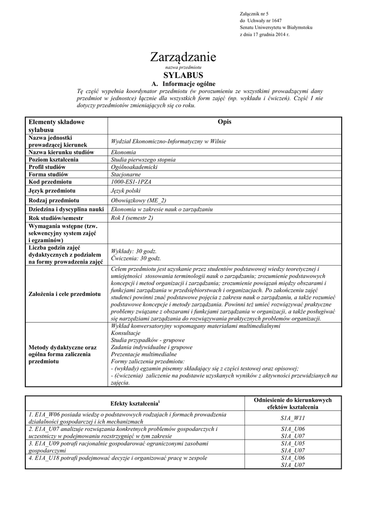 Zarządzanie - UwB Wydział Ekonomiczno