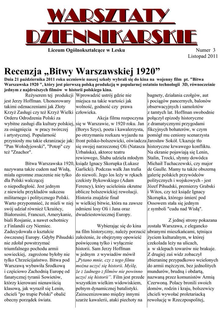 WARSZTATY DZIENNIKARSKIE Liceum Ogólnokształcące w Lesku Numer 3 Listopad 2011 Recenzja „Bitwy Warszawskiej 1920” Dnia 21 października 2011 roku uczniowie naszej szkoły wybrali się do kina na wojenny film pt. "Bitwa Warszawska 1920 ", który jest pierwszą polską produkcją w popularnej ostatnio technologii 3D, równocześnie jednym z najdroższych filmów w historii polskiego kina. Reżyserem tej produkcji jest Jerzy Hoffman. Uhonorowany takimi odznaczeniami jak Złoty Krzyż Zasługi czy też Krzyż Wielki Orderu Odrodzenia Polski za wybitne zasługi dla kultury polskiej, za osiągnięcia w pracy twórczej i artystycznej. Popularność przyniosły mu takie ekranizacje jak: "Pan Wołodyjowski", "Potop" czy też "Znachor". Wprowadzić ustrój gdzie nie bagnety, działania czołgów, aut miejsca na takie wartości jak i pociągów pancernych, balonów wolność, godność czy prawa obserwacyjnych i samolotów człowieka. z tamtych lat. Hoffman swobodnie Akcja filmu rozpoczyna połączył epizody historyczne się w Warszawie, w 1920 roku. Jan z dramatycznymi przygodami (Borys Szyc), poeta i kawalerzysta, fikcyjnych bohaterów, w czym po otrzymaniu rozkazu wyjazdu na pomógł mu ceniony scenarzysta front polsko-bolszewicki, oświadcza Jarosław Sokół. Ukazuje tło się swojej narzeczonej Oli (Natasza historyczne krwawego konfliktu. Urbańska), aktorce teatru Na ekranie pojawiają się Lenin, rewiowego, Ślubu udziela młodym Stalin, Trocki, słynny dowódca Bitwa Warszawska 1920, ksiądz Ignacy Skorupka (Łukasz Michaił Tuchaczewski, czy major nazywana także cudem nad Wisłą, Garlicki). Podczas walk Jan trafia de Gaulle. Mamy tu także obszerną miała ogromne znaczenie nie tylko do niewoli. Jego los leży w rękach galerię polskich przywódców dla Polski walczącej czekisty Bykowskiego (Adam politycznych i wojskowych - jest o niepodległość. Jest jednym Ferency), który ucieleśnia okrutne Józef Piłsudski, premierzy Grabski z niewielu przykładów sukcesu oblicze bolszewickiej rewolucji. i Witos, czy też ksiądz Ignacy militarnego i politycznego Polski. Historia znajdzie finał Skorupka, którego śmierć pod Warto przypomnieć, że mieli w niej w wielkiej bitwie, która na zawsze Ossowem stała się jednym swój udział również Ukraińcy, odmieni losy Oli i Jana oraz z symboli "cudu nad Wisłą". Białorusini, Francuzi, Amerykanie, dwudziestowiecznej Europy. biali Rosjanie, a nawet ochotnicy Z jednej strony pokazana z Finlandii czy Niemiec. Wybierając się do kina została Warszawa, z elegancko Zadecydowała o kształcie na film historyczny, należy porzucić ubranymi mieszkańcami, tętniąca ówczesnej Europy. Gdyby Piłsudski założenie, że obejrzymy opowieść życiem kulturalnym, w której nie zdołał powstrzymać poświęconą tylko i wyłącznie czekolada leży na ulicach, triumfalnego pochodu armii historii. Sam Jerzy Hoffman a w sklepach towarów nie brakuje. sowieckiej, zagrożone byłoby nie w jednym z wywiadów mówił Z drugiej zaś widz zobaczył tylko Chrześcijaństwo. Bitwa pod „Pytano mnie, czy z tego filmu zbieraninę przypadkowo wcielonych Warszawą wybawiła Środkową można uczyć się historii. Myślę, do armii mężczyzn, bez jednolitych i częściowo Zachodnią Europę od że z żadnego z filmów nie powinno mundurów, brudną i obdartą, fanatycznej tyranii Sowietów, uczyć się historii”. Film jest przede nazwaną przez komunistów Armią którzy kierowani nienawiścią wszystkim wielkim widowiskiem, Czerwoną. Polacy bronili swoich klasową, jak wyraził się Lenin, pełnym dynamicznej batalistyki. domów, rodzin i kraju, bolszewicy chcieli "po trupie Polski" obalić Zainscenizowano między innymi chcieli wywołać proletariacką obecny porządek świata. szarże kawalerii, ataki piechoty na rewolucję w Rzeczpospolitej, a potem także w Niemczech, Anglii, wojska polskie do ataku w bitwie lider jazzowego zespołu String Włoszech i na całym Starym pod Ossowem. Scena ta została Connection koncertował od roku Kontynencie. W filmie ukazana jest upamiętniona na obrazie Jerzego 1980 w całej niemal Europie, a różna motywacja walczących, Kossaka pt. "Cud nad Wisłą". Nie także w USA i Kanadzie. Muzyka jednak reżyser powstrzymał się od do końca pokrywa się z prawdą pomimo niewątpliwej podniosłości, oceny, która strona ma rację. historyczną, nie poprowadził on ani przez moment nie wydała mi się Wspólnym mianownikiem dla obu ataku z krzyżem w ręku, ale kiczowata czy przesadnie grup była śmierć, gdyż ginęli równie towarzyszył części nieostrzelanych pompatyczna. Muzyka kształtowała szybko i łatwo zarówno Polacy, jak i żołnierzy pułku i zginął w czasie nastrój, wzmagała napięcie, Rosjanie. udzielania żołnierzowi ostatniego pobudzała wyobraźnie. Niekiedy namaszczenia. Łukasz Garlicki jednak można było odnieść Pozytywne wrażenia doskonale wcielił się w rolę wrażenie, że jest jej za dużo. pozostawili po sobie także aktorzy. młodego księdza. Scena śmierci Widz mógł czuć się przytłoczony W filmie wystąpiło wiele sław: D. wypadła niezwykle wzruszająco, nachalnością dźwięków. Olbrychski, B. Szyc, N. Urbańska, zasługuje na miano jednej B. Linda, M. Żebrowski, A. z najlepszych w filmie. Serce rośnie Na pochwałę zasługuje Ferency, W. Zborowski, K. Globisz, jak widzimy bohaterską postawę dobór kostiumów, które zachwycają a także A. Domagarow. Oczy i serca naszych żołnierzy, którzy nie dokładnością wykonania. Jak mówi widzów skupiały się przede bacząc na swój strach i przewagę Andrzej Szanajch, ich twórca: wszystkim na Urbańskiej i Szycu, wroga, walczą za nasz kraj. „wszystkie detale kostiumów, takie którzy swoje role odegrali na bardzo jak np. guziki, faktura materiału czy przyzwoitym poziomie. Za sprawą W roli marszałka biżuteria były bardzo widoczne. Nataszy czułam klimat Piłsudskiego wystąpił świetny aktor Musiano więc 