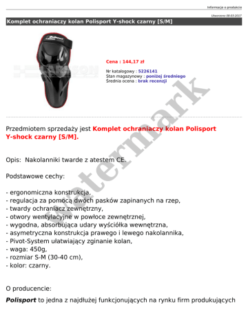 Informacje o produkcie Utworzono 08-03-2017 Komplet ochraniaczy kolan Polisport Y-shock czarny [S/M] Cena : 144,17 zł er m ar k Nr katalogowy : 5226141 Stan magazynowy : poniżej średniego Średnia ocena : brak recenzji Przedmiotem sprzedaży jest Komplet ochraniaczy kolan Polisport Y-shock czarny [S/M]. Opis: Nakolanniki twarde z atestem CE. at Podstawowe cechy: w - ergonomiczna konstrukcja, - regulacja za pomocą dwóch pasków zapinanych na rzep, - twardy ochraniacz zewnętrzny, - otwory wentylacyjne w powłoce zewnętrznej, - wygodna, absorbująca udary wyściółka wewnętrzna, - asymetryczna konstrukcja prawego i lewego nakolannika, - Pivot-System ułatwiający zginanie kolan, - waga: 450g, - rozmiar S-M (30-40 cm), - kolor: czarny. O producencie: Polisport to jedna z najdłużej funkcjonujących na rynku firm produkujących w at er m ar k akcesoria motocyklowe. Do 1985 roku była to jedyna gałąź produkcji w fabryce Polisport w Portugalii. Potem, na skutek ogromnego zapotrzebowania, Polisport zaczął koncentrować sie również na produkcji akcesoriów rowerowych (kaski rowerowe), a także na produkcji dziecięcych fotelików samochodowych i rowerowych. W naszej ofercie znajdują się liczne akcesoria enduro/cross z tworzyw sztucznych, a także elementy odzieży motocyklowej głównie dla użytkowników motocykli enduro (buzery, ochraniacze). Kraj pochodzenia produktów - Portugalia.