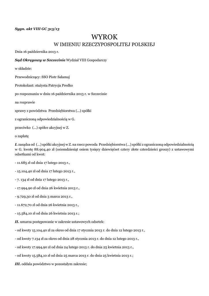 Sygn. akt VIII GC 313/13 WYROK W IMIENIU RZECZYPOSPOLITEJ POLSKIEJ Dnia 16 października 2013 r. Sąd Okręgowy w Szczecinie Wydział VIII Gospodarczy w składzie: Przewodniczący: SSO Piotr Sałamaj Protokolant: stażysta Patrycja Predko po rozpoznaniu w dniu 16 października 2013 r. w Szczecinie na rozprawie sprawy z powództwa Przedsiębiorstwa (...) spółki z ograniczoną odpowiedzialnością w G. przeciwko (...) spółce akcyjnej w Z. o zapłatę I. zasądza od (...) spółki akcyjnej w Z. na rzecz powoda Przedsiębiorstwa (...) spółki z ograniczoną odpowiedzialnością w G. kwotę 88.904,40 zł (osiemdziesiąt osiem tysięcy dziewięćset cztery złote czterdzieści groszy) z ustawowymi odsetkami od kwot: - 11.685 zł od dnia 17 lutego 2013 r., - 15.104,40 zł od dnia 17 lutego 2013 r., - 7. 134 zł od dnia 17 lutego 2013 r., - 17.994,90 zł od dnia 26 kwietnia 2013 r., - 9.729,30 zł od dnia 3 marca 2013 r., - 11.672,70 zł od dnia 26 kwietnia 2013 r., - 15.584,10 zł od dnia 26 kwietnia 2013 r.; II. umarza postępowanie w zakresie ustawowych odsetek: - od kwoty 15.104,40 zł za okres od dnia 17 stycznia 2013 r. do dnia 12 lutego 2013 r., - od kwoty 7.134 zł za okres od dnia 28 stycznia 2013 r. do dnia 12 lutego 2013 r., - od kwoty 17.994,90 zł od dnia 24 lutego 2013 r. do dnia 25 kwietnia 2013 r., - od kwoty 15.584,10 zł od dnia 25 marca 2013 r. do dnia 25 kwietnia 2013 r.; III. oddala powództwo w pozostałym zakresie; IV. zasądza od pozwanego na rzecz powoda kwotę 8.063 zł (osiem tysięcy sześćdziesiąt trzy złote) tytułem kosztów procesu. Sygn. akt VIII GC 313/13 UZASADNIENIE Powód Przedsiębiorstwo (...) spółka z ograniczoną odpowiedzialnością w G. wniósł o zasądzenie od pozwanego (...) spółki akcyjnej w Z. kwoty 88.904,40 zł z ustawowymi odsetkami od kwot: 11.685 zł od 31.12.2012 r., 15.104,40 zł od 17.01.2013 r., 7.134 zł od 28.01.2013 r., 17.994,90 zł od 24.02.2013 r., 9.729,30 zł od 3.03.2013 r., 11.672,70 zł od 31.03.2013 r., 15.584,10 zł od 25.03.2013 r. oraz kosztów procesu. W uzasadnieniu powód wskazał, że zawarł z pozwanym umowę, na której podstawie wynajął pozwanemu koparkę gąsienicową z operatorem. Rozliczenie czasu pracy koparki następować miało na podstawie zatwierdzonego przez kierownika budowy raportu pracy sprzętu sporządzonego przez operatora powoda. Na tej też podstawie powód wystawił pozwanemu faktury VAT, które pomimo wezwania do zapłaty nie zostały zapłacone. Nakazem zapłaty w postępowaniu upominawczym z dnia 5 czerwca 2013 r. (sygn. akt VIII GNC 280/13) referendarz sądowy w Sądzie Okręgowym w Szczecinie uwzględnił żądanie pozwu. W sprzeciwie od powyższego nakazu zapłaty (karta 54) pozwany wniósł o oddalenie powództwa oraz zasądzenie kosztów procesu. Pozwany podniósł zarzut niewykazania zaciągnięcia przez niego zobowiązania, w szczególności niewykazania przez powoda wynajęcia pozwanemu sprzętu wraz z operatorem; niewykazania wykonania usług; niewykazania, że pozwany faktycznie otrzymał faktury i kiedy to nastąpiło, a tym samym zarzut niewymagalności roszczenia; zarzut przedwczesności roszczenia z faktury VAT nr (...); niepotwierdzenia odbioru przez pozwanego przedmiotu najmu; zarzut potwierdzenia raportów dziennych przez nieznaną osobę – niebędącą kierownikiem budowy. W uzasadnieniu pozwany przyznał fakt zawarcia z powodem umowy najmu, wskazał jednakże, że powód nie dołączył żadnych protokołów zdawczo-odbiorczych, które poświadczałyby czy faktycznie i w jakim okresie powód wynajął pozwanemu koparkę. Pozwany stwierdził, że raporty dzienne zostały podpisane w sposób nieczytelny bądź też widnieje na nich podpis osoby niebędącej kierownikiem budowy. Nadto na raportach tych nie zawarto adnotacji odnośnie przestoju koparki, powód zaś domaga się czynszu także za ten okres. Zarzucił także, że termin wymagalności należności ujętych w tych fakturach został wskazany w sposób niezgodny z umową. Powód przy tym nie przedłożył dowodu doręczenia tych faktur, co ma znaczenie dla rozpoczęcia biegu terminu płatności. Pozwany wskazał także, że jego pismo z 7.05.2013 r. nie odnosi się do konkretnego wezwania do zapłaty, nadto zostało ono podpisane przez dyrektora finansowego, nie zaś przez prezesa zarządu. Na rozprawie w dniu 16 października 2013 r. (k. 92) powód dokonał modyfikacji żądania pozwu w ten sposób, że wniósł o zasądzenie odsetek ustawowych od kwot: 15.140,40 zł od dnia 13 lutego 2013 r., 7.134 zł od dnia 13 lutego 2013 r., 17.994,90 zł od dnia 26 kwietnia 2013 r., 15.584,10 zł od dnia 26 kwietnia 2013 r. Jednocześnie cofnął żądanie pozwu w odniesieniu do odsetek ustawowych od wskazanych wyżej kwot od dat wskazanych w pozwie do dnia poprzedzającego daty wynikające ze zmodyfikowanego żądania pozwu, zrzekając się w tej części roszczenia. Sąd ustalił następujący stan faktyczny: W dniu 26 listopada 2012 r. powód Przedsiębiorstwo (...) spółka z o.o. w G. (wynajmujący) zawarł z pozwanym (...) S.A. w Z. (najemca) umowę najmu nr (...), której przedmiotem był najem koparki gąsienicowej z operatorem (§ 1 ust. 1 umowy najmu). Zgodnie z § 3 ust. 1 i 2 umowy czynsz najmu strony ustaliły na kwotę 150 zł netto za jedną godzinę pracy koparki przy wykopach, montażu i układaniu rurociągu na budowie w miejscowości D. oraz 80 zł netto za godzinę przestoju lub korzystanie z koparki do wykonywania prac pomocniczych w czasie godzin pracy; czynsz miał zostać powiększony o należny podatek VAT. Strony postanowiły, że rozliczenie czasu pracy koparki nastąpi na podstawie zatwierdzonego przez kierownika budowy najemcy (pozwanego) raportu pracy sprzętu sporządzonego przez operatora wynajmującego (§ 3 ust. 4). Stosownie do § 3 ust. 5 należność z tytułu najmu miała być regulowana przelewem na konto wynajmującego w terminie 30 dni do otrzymania faktury VAT wystawionej na 