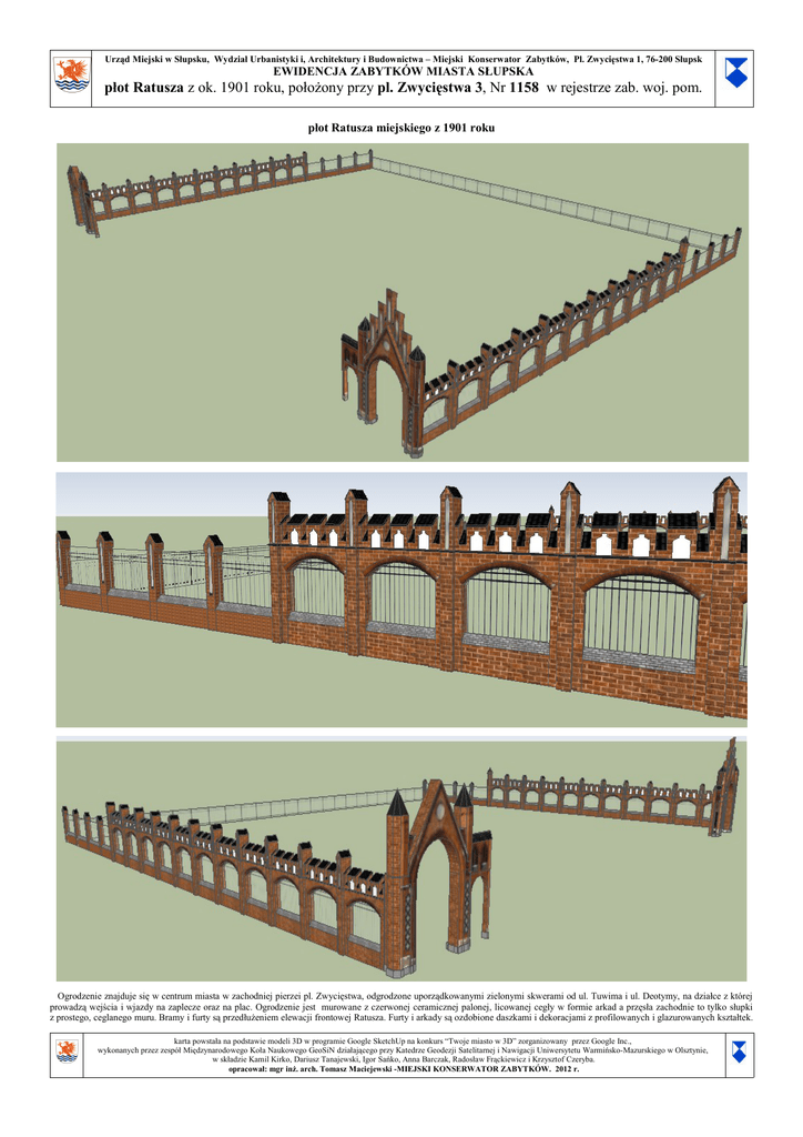 Urząd Miejski w Słupsku, Wydział Urbanistyki i, Architektury i Budownictwa – Miejski Konserwator Zabytków, Pl. Zwycięstwa 1, 76-200 Słupsk EWIDENCJA ZABYTKÓW MIASTA SŁUPSKA płot Ratusza z ok. 1901 roku, położony przy pl. Zwycięstwa 3, Nr 1158 w rejestrze zab. woj. pom. płot Ratusza miejskiego z 1901 roku Ogrodzenie znajduje się w centrum miasta w zachodniej pierzei pl. Zwycięstwa, odgrodzone uporządkowanymi zielonymi skwerami od ul. Tuwima i ul. Deotymy, na działce z której prowadzą wejścia i wjazdy na zaplecze oraz na plac. Ogrodzenie jest murowane z czerwonej ceramicznej palonej, licowanej cegły w formie arkad a przęsła zachodnie to tylko słupki z prostego, ceglanego muru. Bramy i furty są przedłużeniem elewacji frontowej Ratusza. Furty i arkady są ozdobione daszkami i dekoracjami z profilowanych i glazurowanych kształtek. karta powstała na podstawie modeli 3D w programie Google SketchUp na konkurs “Twoje miasto w 3D” zorganizowany przez Google Inc., wykonanych przez zespół Międzynarodowego Koła Naukowego GeoSiN działającego przy Katedrze Geodezji Satelitarnej i Nawigacji Uniwersytetu Warmińsko-Mazurskiego w Olsztynie, w składzie Kamil Kirko, Dariusz Tanajewski, Igor Sańko, Anna Barczak, Radosław Frąckiewicz i Krzysztof Czeryba. opracował: mgr inż. arch. Tomasz Maciejewski -MIEJSKI KONSERWATOR ZABYTKÓW. 2012 r. Urząd Miejski w Słupsku, Wydział Urbanistyki i, Architektury i Budownictwa – Miejski Konserwator Zabytków, Pl. Zwycięstwa 1, 76-200 Słupsk EWIDENCJA ZABYTKÓW MIASTA SŁUPSKA płot Ratusza z ok. 1901 roku, położony przy pl. Zwycięstwa 3, Nr 1158 w rejestrze zab. woj. pom. płot Ratusza miejskiego z 1901 roku Dwuskrzydłowe bramy mają kształt spłaszczonego ostrołuku z trójkątnym szczytem z kolistą blendą; szczyt wieńczy 5 sterczyn z blendami a całość zamykają masywne ośmioboczne słupy wieżowe, zwieńczone glazurowanym daszkiem i kwiatonem oraz pionowymi dekoracjami czterolistnymi z glazury. Wypełnienie przestrzeni bram, furt i akard wykonane jest ze stylizowanych, kutych, ozdobnych krat żelaznych o secesyjnym ornamencie. Pozostałe, tylne wypełnienia przęseł ogrodzenia wykonano z prostych kutych, krat żelaznych. karta powstała na podstawie modeli 3D w programie Google SketchUp na konkurs “Twoje miasto w 3D” zorganizowany przez Google Inc., wykonanych przez zespół Międzynarodowego Koła Naukowego GeoSiN działającego przy Katedrze Geodezji Satelitarnej i Nawigacji Uniwersytetu Warmińsko-Mazurskiego w Olsztynie, w składzie Kamil Kirko, Dariusz Tanajewski, Igor Sańko, Anna Barczak, Radosław Frąckiewicz i Krzysztof Czeryba. opracował: mgr inż. arch. Tomasz Maciejewski -MIEJSKI KONSERWATOR ZABYTKÓW. 2012 r.