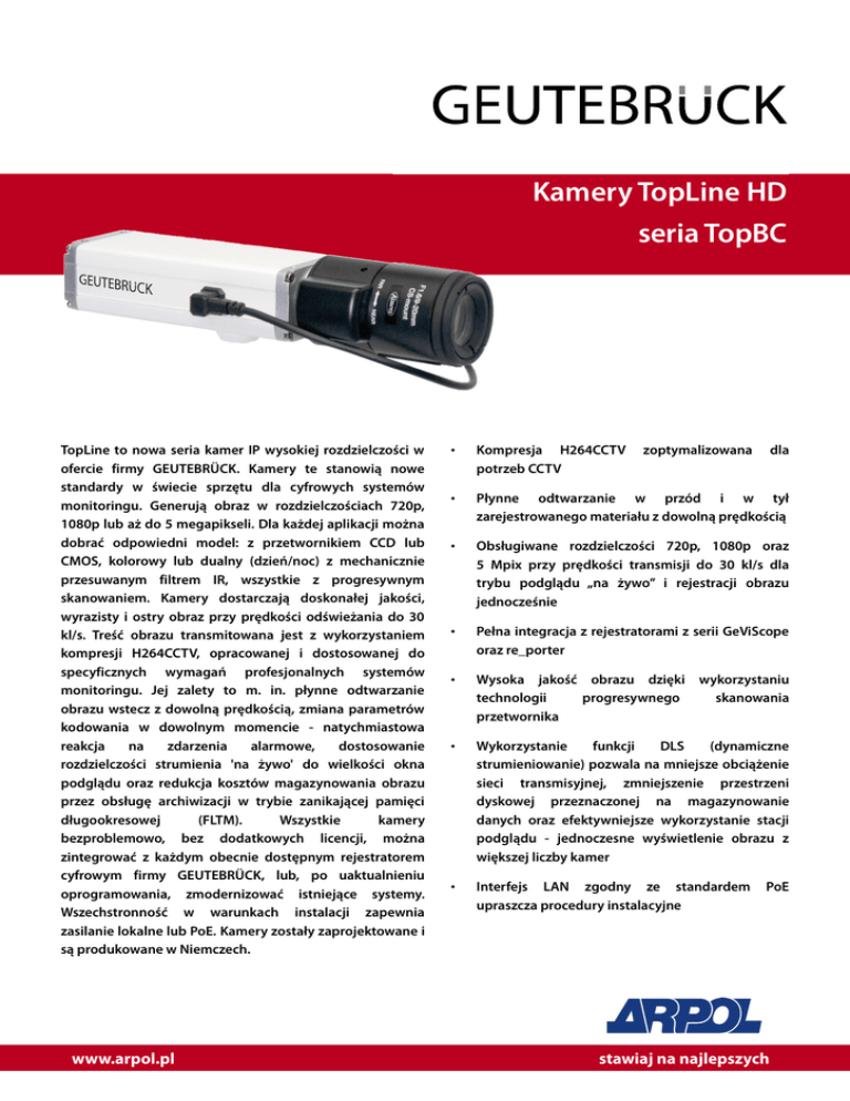 Kamery TopLine HD seria TopBC TopLine to nowa seria kamer IP wysokiej rozdzielczości w ofercie firmy GEUTEBRÜCK. Kamery te stanowią nowe standardy w świecie sprzętu dla cyfrowych systemów monitoringu. Generują obraz w rozdzielczościach 720p, 1080p lub aż do 5 megapikseli. Dla każdej aplikacji można dobrać odpowiedni model: z przetwornikiem CCD lub CMOS, kolorowy lub dualny (dzień/noc) z mechanicznie przesuwanym filtrem IR, wszystkie z progresywnym skanowaniem. Kamery dostarczają doskonałej jakości, wyrazisty i ostry obraz przy prędkości odświeżania do 30 kl/s. Treść obrazu transmitowana jest z wykorzystaniem kompresji H264CCTV, opracowanej i dostosowanej do specyficznych wymagań profesjonalnych systemów monitoringu. Jej zalety to m. in. płynne odtwarzanie obrazu wstecz z dowolną prędkością, zmiana parametrów kodowania w dowolnym momencie - natychmiastowa reakcja na zdarzenia alarmowe, dostosowanie rozdzielczości strumienia 'na żywo' do wielkości okna podglądu oraz redukcja kosztów magazynowania obrazu przez obsługę archiwizacji w trybie zanikającej pamięci długookresowej (FLTM). Wszystkie kamery bezproblemowo, bez dodatkowych licencji, można zintegrować z każdym obecnie dostępnym rejestratorem cyfrowym firmy GEUTEBRÜCK, lub, po uaktualnieniu oprogramowania, zmodernizować istniejące systemy. Wszechstronność w warunkach instalacji zapewnia zasilanie lokalne lub PoE. Kamery zostały zaprojektowane i są produkowane w Niemczech. • Kompresja H264CCTV potrzeb CCTV zoptymalizowana dla • Płynne odtwarzanie w przód i w tył zarejestrowanego materiału z dowolną prędkością • Obsługiwane rozdzielczości 720p, 1080p oraz 5 Mpix przy prędkości transmisji do 30 kl/s dla trybu podglądu „na żywo” i rejestracji obrazu jednocześnie • Pełna integracja z rejestratorami z serii GeViScope oraz re_porter • Wysoka jakość obrazu dzięki wykorzystaniu technologii progresywnego skanowania przetwornika • Wykorzystanie funkcji DLS (dynamiczne strumieniowanie) pozwala na mniejsze obciążenie sieci transmisyjnej, zmniejszenie przestrzeni dyskowej przeznaczonej na magazynowanie danych oraz efektywniejsze wykorzystanie stacji podglądu - jednoczesne wyświetlenie obrazu z większej liczby kamer • Interfejs LAN zgodny ze standardem upraszcza procedury instalacyjne PoE Parametr Przetwornik Format obrazu System skanowania przetwornika Rozdzielczość Piksel (H x V) Rozmiar piksela Minimalna czułość Balans bieli Ekspozycja Migawka Kompensacja tylnego światła Flickerless AGC Elektroniczna funkcja PTZ Interfejs Programowe odwrócenie obrazu Kompresja Strumieniowanie wideo Protokoły sieciowe Procesor/Pamięć Detekcja ruchu Zarządzanie alarmowe Maski prywatności Mocowanie obiektywu Rodzaje obiektywów Temperatura pracy Zasilanie Pobór mocy Wymiary (szerokość x wysokość x długość) Złącza Waga Licencje TopBC-1113 1/3” CMOS 4:3/ 16:9/ wiele obszarów zainteresowania (AOI) TopBC-1118 1/3” CMOS 4:3/ 16:9/ wiele obszarów zainteresowania (AOI) TopBC-1123 1/2.5” CMOS 4:3/ 16:9/ wiele obszarów zainteresowania (AOI) Progresywne skanowanie Progresywne skanowanie Progresywne skanowanie 1 MP 1280 (H) x 720 (V) 2.2 µm x 2.2 µm 0.55 Lux / 1.2 (Kolor) Automatyczny Automatyczna / „ręczna” Automatyczna elektroniczna (AES) Automatyczna Automatyczny Tak Tak Przeglądarka webowa 2 MP 1920 (H) x 1080 (V) 2.2 µm x 2.2 µm 0.65 Lux / 1.2 (Kolor) Automatyczny Automatyczna / „ręczna” Automatyczna elektroniczna (AES) Automatyczna Automatyczny Tak Tak Przeglądarka webowa Odwrócenie obrazu o 180° Odwrócenie obrazu o 180° H264CCTV (GEUTEBRÜCK), MJPEG, MPEG4 (SP, poziom 3) H264CCTV: 30 kl/s MJPEG: 25 kl/s; MPEG4: 30 kl/s TCP/IP, HTTP, FTP, UDP, ICMP, ARP, DHCP, NTP, RTP, RTSP, RTCP, SMTP, IGMP, ZEROCONF, QoS Layer 3 Multimedialny procesor wideo, FPGA; 256 MB RAM, 32 MB Flash Tak Zdarzenia wyzwalane za pomocą detekcji ruchu lub za pomocą wejścia alarmowego można zapisać na FTP lub wysłać za pomocą maila lub HTTP. Do dyspozycji bufor pre - alarmowy oraz post -alarmowy Tak Mocowanie typu CS Przysłona sterowana ręcznie lub napięciem DC 0° C do 50° C PoE (IEEE 802.3af class 2) lub 7 do 24 V DC Maks. 5 W / 12 V DC H264CCTV (GEUTEBRÜCK), MJPEG, MPEG4 (SP, poziom 3) H264CCTV: 30 kl/s MJPEG: 25 kl/s; MPEG4: 30 kl/s TCP/IP, HTTP, FTP, UDP, ICMP, ARP, DHCP, NTP, RTP, RTSP, RTCP, SMTP, IGMP, ZEROCONF, QoS Layer 3 Multimedialny procesor wideo, FPGA; 256 MB RAM, 32 MB Flash Tak Zdarzenia wyzwalane za pomocą detekcji ruchu lub za pomocą wejścia alarmowego można zapisać na FTP lub wysłać za pomocą maila lub HTTP. Do dyspozycji bufor pre - alarmowy oraz post -alarmowy Tak Mocowanie typu CS Przysłona sterowana ręcznie lub napięciem DC 0° C do 50° C PoE (IEEE 802.3af class 2) lub 7 do 24 V DC Maks. 5 W / 12 V DC 5 MP 2560 (H) x 1920 (V) 2.2 µm x 2.2 µm 0.65 Lux / 1.2 (Kolor) Automatyczny Automatyczna / „ręczna” Automatyczna elektroniczna (AES) Automatyczna Automatyczny Tak Tak Przeglądarka webowa Odwrócenie obrazu o 180°, odbicie w pionie oraz w poziomie 264CCTV (GEUTEBRÜCK), MJPEG, MPEG4 (SP, poziom 3) H264CCTV:9 kl/s MJPEG: 9 kl/s; TCP/IP, HTTP, FTP, UDP, ICMP, ARP, DHCP, NTP, RTP, RTSP, RTCP, SMTP, IGMP, ZEROCONF, QoS Layer 3 Multimedialny procesor wideo, FPGA; 256 MB RAM, 32 MB Flash Tak Zdarzenia wyzwalane za pomocą detekcji ruchu lub za pomocą wejścia alarmowego można zapisać na FTP lub wysłać za pomocą maila lub HTTP. Do dyspozycji bufor pre - alarmowy oraz post -alarmowy Tak Mocowanie typu CS Przysłona sterowana ręcznie lub napięciem DC 0° C do 50° C PoE (IEEE 802.3af class 2) lub 7 do 24 V DC Maks. 3.2 W / 12 V DC 44 x 28 x 109,7 44 x 28 x 109,7 44 x 28 x 109,7 RJ45, 10/100 Base-Tx, 8-pin-owa złączka do podłączenia zasilania, wejść i wyjść alarmowych oraz RS485 około 210 g Wbudowane licencje: Licencja/GSC/IP-CAM RJ45, 10/100 Base-Tx, 8-pin-owa złączka do podłączenia zasilania, w