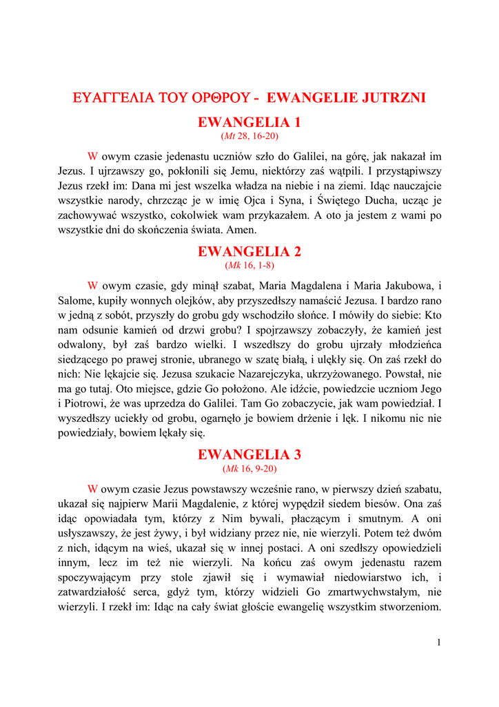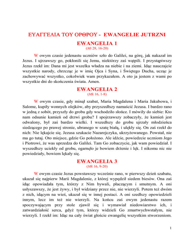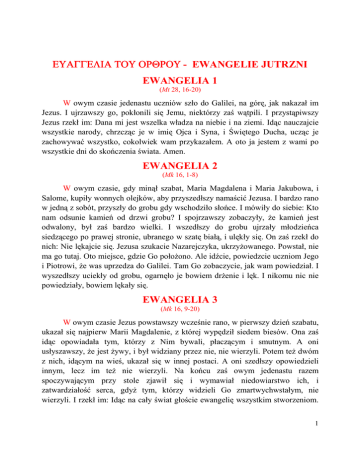 ΕΥΑΓΓΕΛΙΑ ΤΟΥ ΟΡΘΡΟΥ - EWANGELIE JUTRZNI EWANGELIA 1 (Mt 28, 16-20) W owym czasie jedenastu uczniów szło do Galilei, na górę, jak nakazał im Jezus. I ujrzawszy go, pokłonili się Jemu, niektórzy zaś wątpili. I przystąpiwszy Jezus rzekł im: Dana mi jest wszelka władza na niebie i na ziemi. Idąc nauczajcie wszystkie narody, chrzcząc je w imię Ojca i Syna, i Świętego Ducha, ucząc je zachowywać wszystko, cokolwiek wam przykazałem. A oto ja jestem z wami po wszystkie dni do skończenia świata. Amen. EWANGELIA 2 (Mk 16, 1-8) W owym czasie, gdy minął szabat, Maria Magdalena i Maria Jakubowa, i Salome, kupiły wonnych olejków, aby przyszedłszy namaścić Jezusa. I bardzo rano w jedną z sobót, przyszły do grobu gdy wschodziło słońce. I mówiły do siebie: Kto nam odsunie kamień od drzwi grobu? I spojrzawszy zobaczyły, Ŝe kamień jest odwalony, był zaś bardzo wielki. I wszedłszy do grobu ujrzały młodzieńca siedzącego po prawej stronie, ubranego w szatę białą, i ulękły się. On zaś rzekł do nich: Nie lękajcie się. Jezusa szukacie Nazarejczyka, ukrzyŜowanego. Powstał, nie ma go tutaj. Oto miejsce, gdzie Go połoŜono. Ale idźcie, powiedzcie uczniom Jego i Piotrowi, Ŝe was uprzedza do Galilei. Tam Go zobaczycie, jak wam powiedział. I wyszedłszy uciekły od grobu, ogarnęło je bowiem drŜenie i lęk. I nikomu nic nie powiedziały, bowiem lękały się. EWANGELIA 3 (Mk 16, 9-20) W owym czasie Jezus powstawszy wcześnie rano, w pierwszy dzień szabatu, ukazał się najpierw Marii Magdalenie, z której wypędził siedem biesów. Ona zaś idąc opowiadała tym, którzy z Nim bywali, płaczącym i smutnym. A oni usłyszawszy, Ŝe jest Ŝywy, i był widziany przez nie, nie wierzyli. Potem teŜ dwóm z nich, idącym na wieś, ukazał się w innej postaci. A oni szedłszy opowiedzieli innym, lecz im teŜ nie wierzyli. Na końcu zaś owym jedenastu razem spoczywającym przy stole zjawił się i wymawiał niedowiarstwo ich, i zatwardziałość serca, gdyŜ tym, którzy widzieli Go zmartwychwstałym, nie wierzyli. I rzekł im: Idąc na cały świat głoście ewangelię wszystkim stworzeniom. 1 Kto uwierzy i ochrzci się, zbawiony będzie, a kto nie uwierzy, potępiony będzie. Cuda zaś tych, którzy uwierzą, takie będą: W imię moje biesy będą wyrzucać, nowymi językami mówić będą, węŜe brać będą i choćby coś śmiertelnego wypili, nie zaszkodzi im. Na chorych ręce kłaść będą i zdrowi będą. A Pan potem, jak do nich mówił, wzięty został do nieba i siedzi po prawicy Boga. Oni zaś wyszedłszy głosili wszędzie, a Pan im dopomagał i potwierdzał mowę przez cuda za nimi idące. Amen. EWANGELIA 4 (Łk 24, 1-12) W owym czasie, w jedną z sobót, bardzo wcześnie rano, niewiasty przyszły na grób, niosąc wonne olejki, które przygotowały. Znalazły zaś kamień odwalony od grobu i wszedłszy nie znalazły ciała Pana Jezusa. I stało się, Ŝe gdy nie wiedziały co o tym sądzić, oto dwaj męŜowie stanęli przy nich w szatach jaśniejących. A gdy się lękały i schyliły twarze ku ziemi, rzekli do nich: Dlaczego pośród martwych szukacie śyjącego? Nie masz Go tutaj, albowiem powstał z martwych. Wspomnijcie, co wam rzekł, gdy jeszcze był w Galilei, mówiąc: IŜ potrzeba, aby Syn Człowieczy był wydany w ręce ludzi grzesznych i został ukrzyŜowany, i trzeciego dnia zmartwychwstał. I wspomniały na słowa Jego. A wróciwszy od grobu, ogłosiły to wszystko jedenastu i wszystkim innym. Była zaś Maria Magdalena i Maria Jakubowa, i inne z nimi, które mówiły to apostołom. I wydały się im słowa te fałszywymi, i nie wierzyli im. Piotr zaś wstawszy pobiegł do grobu i nachyliwszy się zobaczył leŜące jedynie prześcieradła, i odszedł dziwiąc się sam w sobie temu, co się stało. EWANGELIA 5 (Łk 24, 12-35) W owym czasie, Piotr wstawszy pobiegł do grobu i nachyliwszy się zobaczył leŜące jedynie prześcieradła, i odszedł dziwiąc się sam w sobie temu, co się stało. A oto dwaj z nich szli tegoŜ dnia do wsi leŜącej sześćdziesiąt stadiów od Jerozolimy, zwanej Emmaus. I ci rozmawiali ze sobą o tym wszystkim, co się stało. I stało się, gdy rozmawiali i rozprawiali z sobą, sam Jezus przybliŜywszy się, szedł z nimi. Oczy zaś ich były jakby zatrzymane, aby Go nie poznali. Rzekł zaś do nich: CóŜ to są za rozmowy, które idąc macie między sobą, a jesteście smutni? Odpowiadając przeto jeden, któremu imię Kleofas, rzekł Mu: Ty chyba jesteś jedynym z przebywających w Jerozolimie, który nie wie, co się tam działo w te 2 dni? I rzekł do nich: Co? Oni zaś rzekli: O Jezusie Nazarejczyku, który był męŜem prorokiem, potęŜnym w dziełach i mowie przed Bogiem i wszystkimi ludźmi. I wydali Go arcykapłani i przełoŜeni nasi na osądzenie na śmierć, i ukrzyŜowali Go. My zaś spodziewaliśmy się, Ŝe On jest tym, który chce zbawić Izraela. A teraz nadto wszystko dziś jest trzeci dzień jak to się stało. A i niewiasty niektóre z naszych przeraziły nas, które rano były przy grobie i nie znalazłszy Jego ciała przyszły mówiąc, Ŝe miały widzenie Aniołów, którzy mówili, Ŝe On Ŝyje. I poszli niektórzy z naszych do grobu i tak znaleźli, jak mówiły niewiasty, ale Jego samego nie widzieli. I On rzekł do nich: O głupi i leniwego serca, aby uwierzyć temu wszystkiemu, co mówili prorocy. CzyŜ nie trzeba było, Ŝeby Chrystus cierpiał i wszedł w chwałę swoją? I począwszy od MojŜesza, i od wszystkich proroków wykładał im we wszystkich pismach, co o Nim było. I przybliŜyli się do wsi, do której szli, a On okazywał jakby dalej miał iść. I przymuszali Go, mówiąc: Zostań z nami, bo ma się ku wieczorowi i dzień juŜ się nachylił. I pozostał z nimi. I stało się, gdy spoczął z nimi przy stole, wziął chleb, pobłogosławił i przełamawszy podał im. I otworzyły się oczy ich, i poznali Go, a On zniknął im sprzed 
