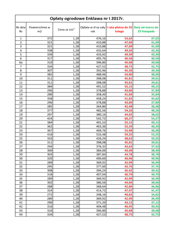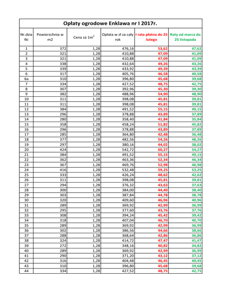 Opłaty ogrodowe Enklawa nr I 2017r. Nr.dzia łki 1 2 3 4 5 6 6a 7 8 9 10 11 12 13 14 15 16 17 18 19 20 21 22 23 24 25 26 27 28 29 30 31 32 33 34 35 36 37 38 39 40 41 42 43 44 Powierzchnia w m2 372 321 321 338 339 317 310 334 307 382 311 311 384 296 280 358 296 285 377 297 424 384 362 367 416 333 311 294 300 303 320 289 295 308 318 289 302 288 324 272 289 290 316 310 334 Cena za 1m2 1,28 1,28 1,28 1,28 1,28 1,28 1,28 1,28 1,28 1,28 1,28 1,28 1,28 1,28 1,28 1,28 1,28 1,28 1,28 1,28 1,28 1,28 1,28 1,28 1,28 1,28 1,28 1,28 1,28 1,28 1,28 1,28 1,28 1,28 1,28 1,28 1,28 1,28 1,28 1,28 1,28 1,28 1,28 1,28 1,28 Opłata w zł za cały I rata płatna do 25 Raty od marca do rok lutego 25 listopada 476,16 410,88 410,88 432,64 433,92 405,76 396,80 427,52 392,96 488,96 398,08 398,08 491,52 378,88 358,40 458,24 378,88 364,80 482,56 380,16 542,72 491,52 463,36 469,76 532,48 426,24 398,08 376,32 384,00 387,84 409,60 369,92 377,60 394,24 407,04 369,92 386,56 368,64 414,72 348,16 369,92 371,20 404,48 396,80 427,52 53,62 47,09 47,09 49,26 49,39 46,58 45,68 48,75 45,30 54,90 45,81 45,81 55,15 43,89 41,84 51,82 43,89 42,48 54,26 44,02 60,27 55,15 52,34 52,98 59,25 48,62 45,81 43,63 44,40 44,78 46,96 42,99 43,76 45,42 46,70 42,99 44,66 42,86 47,47 40,82 42,99 43,12 46,45 45,68 48,75 47,62 41,09 41,09 43,26 43,39 40,58 39,68 42,75 39,30 48,90 39,81 39,81 49,15 37,89 35,84 45,82 37,89 36,48 48,26 38,02 54,27 49,15 46,34 46,98 53,25 42,62 39,81 37,63 38,40 38,78 40,96 36,99 37,76 39,42 40,70 36,99 38,66 36,86 41,47 34,82 36,99 37,12 40,45 39,68 42,75 45 46 47 48 49 50 51 52 53 54 55 56 57 58 59 60 60a 60b Razem 307 338 356 345 331 316 318 308 300 294 285 295 289 283 288 439 19666 1,28 1,28 1,28 1,28 1,28 1,28 1,28 1,28 1,28 1,28 1,28 1,28 1,28 1,28 1,28 1,28 392,96 432,64 455,68 441,60 423,68 404,48 407,04 394,24 384,00 376,32 364,80 377,60 369,92 362,24 368,64 561,92 344,00 344,00 45,30 49,26 51,57 50,16 48,37 46,45 46,70 45,42 44,40 43,63 42,48 43,76 42,99 42,22 42,86 62,19 40,40 40,40 39,30 43,26 45,57 44,16 42,37 40,45 40,70 39,42 38,40 37,63 36,48 37,76 36,99 36,22 36,86 56,19 34,40 34,40