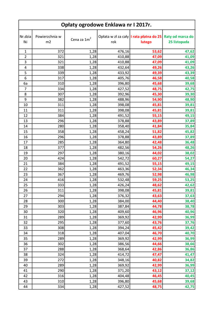 Opłaty ogrodowe Enklawa nr I 2017r.