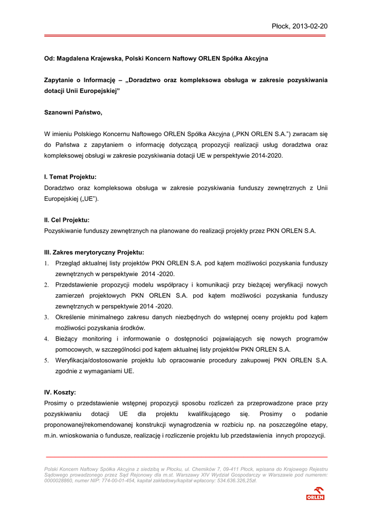 Płock, 2013-02-20 Od: Magdalena Krajewska, Polski Koncern Naftowy ORLEN Spółka Akcyjna Zapytanie o Informację – „Doradztwo oraz kompleksowa obsługa w zakresie pozyskiwania dotacji Unii Europejskiej” Szanowni Państwo, W imieniu Polskiego Koncernu Naftowego ORLEN Spółka Akcyjna („PKN ORLEN S.A.”) zwracam się do Państwa z zapytaniem o informację dotyczącą propozycji realizacji usług doradztwa oraz kompleksowej obsługi w zakresie pozyskiwania dotacji UE w perspektywie 2014-2020. I. Temat Projektu: Doradztwo oraz kompleksowa obsługa w zakresie pozyskiwania funduszy zewnętrznych z Unii Europejskiej („UE”). II. Cel Projektu: Pozyskiwanie funduszy zewnętrznych na planowane do realizacji projekty przez PKN ORLEN S.A. III. Zakres merytoryczny Projektu: 1. Przegląd aktualnej listy projektów PKN ORLEN S.A. pod kątem możliwości pozyskania funduszy zewnętrznych w perspektywie 2014 -2020. 2. Przedstawienie propozycji modelu współpracy i komunikacji przy bieżącej weryfikacji nowych zamierzeń projektowych PKN ORLEN S.A. pod kątem możliwości pozyskania funduszy zewnętrznych w perspektywie 2014 -2020. 3. Określenie minimalnego zakresu danych niezbędnych do wstępnej oceny projektu pod kątem możliwości pozyskania środków. 4. Bieżący monitoring i informowanie o dostępności pojawiających się nowych programów pomocowych, w szczególności pod kątem aktualnej listy projektów PKN ORLEN S.A. 5. Weryfikacja/dostosowanie projektu lub opracowanie procedury zakupowej PKN ORLEN S.A. zgodnie z wymaganiami UE. IV. Koszty: Prosimy o przedstawienie wstępnej propozycji sposobu rozliczeń za przeprowadzone prace przy pozyskiwaniu dotacji UE dla projektu kwalifikującego się. Prosimy o podanie proponowanej/rekomendowanej konstrukcji wynagrodzenia w rozbiciu np. na poszczególne etapy, m.in. wnioskowania o fundusze, realizację i rozliczenie projektu lub przedstawienia innych propozycji. ___________________________________________________________________ Polski Koncern Naftowy Spółka Akcyjna z siedzibą w Płocku, ul. Chemików 7, 09-411 Płock, wpisana do Krajowego Rejestru Sądowego prowadzonego przez Sąd Rejonowy dla m.st. Warszawy XIV Wydział Gospodarczy w Warszawie pod numerem: 0000028860, numer NIP: 774-00-01-454, kapitał zakładowy/kapitał wpłacony: 534.636.326,25zł. Płock, 2013-02-20 Prosimy jedynie o podanie propozycji formy rozliczania bez wskazywania konkretnych kosztów. V. Przesłana przez Państwa odpowiedź powinna zawierać: − Podstawowe informacje o Państwa firmie (dokładna nazwa firmy, adres, numer telefonu i faksu, NIP, ogólny adres e-mail oraz osoba kontaktowa – numer telefonu stacjonarnego i/lub komórkowego, bezpośredni adres mailowy). Prosimy także o informację, dotyczącą okresu działania firmy na rynku. - Informacje na temat podobnych projektów realizowanych aktualnie/dotychczas, w tym w szczególności: liczby złożonych wniosków, liczby projektów zakwalifikowanych do dofinansowania, wielkości dofinansowania (wnioskowanej i pozyskanej) w perspektywie 2007-2013, ze wskazaniem programu pomocowego, - zakresu prac realizowanych w projekcie, listy kontrahentów wraz z referencjami. Proponowane podejście do realizacji zadań projektowych we współpracy z PKN ORLEN S.A., zgodnie z pkt. III. Zakres merytoryczny Projektu - Wstępną propozycję zasad rozliczania Projektu, zgodnie z pkt. IV. Koszty VI. Sposób przesłania wymaganych informacji: Dokumenty składane przez dostawcę powinny zostać dostarczone pocztą elektroniczną na adres: [email protected] Ostateczną datą składania odpowiedzi na Zapytanie o Informację jest: 27.02.2013, godz. 14:00 W trakcie przygotowania informacji, dostawca ma prawo zgłaszać dodatkowe pytania dotyczące niniejszego Zapytania o Informację. Pytania proszę kierować w formie pisemnej za pomocą poczty elektronicznej na adres [email protected] nie później jednak niż do 25.02.2013 do godz. 10:00. Odpowiedzi zostaną przesłane do dostawcy w miarę możliwości niezwłocznie, z zastrzeżeniem jak poniżej. ___________________________________________________________________ Polski Koncern Naftowy Spółka Akcyjna z siedzibą w Płocku, ul. Chemików 7, 09-411 Płock, wpisana do Krajowego Rejestru Sądowego prowadzonego przez Sąd Rejonowy dla m.st. Warszawy XIV Wydział Gospodarczy w Warszawie pod numerem: 0000028860, numer NIP: 774-00-01-454, kapitał zakładowy/kapitał wpłacony: 534.636.326,25zł. Płock, 2013-02-20 Spółka zastrzega sobie prawo odmowy udzielenia odpowiedzi na zgłoszone pytania bez podania przyczyn. VII. Zastrzeżenia: Wszystkie koszty związane z przygotowaniem i przesłaniem informacji ponosi dostawca. Niezależnie od wyników analizy, PKN ORLEN S.A. nie będzie odpowiedzialny, ani dłużny w jakikolwiek sposób, w zakresie kosztów lub strat poniesionych przez dostawcę w związku z przygotowaniem i przekazaniem odpowiedzi w ramach niniejszego zapytania o informację. Niniejsze zapytanie stanowi zaproszenie do negocjacji w rozumieniu art. 72 k.c. Z poważaniem, Magdalena Krajewska W przypadku dodatkowych pytań lub wątpliwości – pozostajemy do Państwa dyspozycji. Osobą kontaktową jest: Magdalena Krajewska PKN ORLEN S.A. ul. Chemików 7 09-411 Płock, Polska tel. (24) 256 77 38 kom. 605 196 756 E-mail: [email protected] ___________________________________________________________________ Polski Koncern Naftowy Spółka Akcyjna z siedzibą w Płocku, ul. Chemików 7, 09-411 Płock, wpisana do Krajowego Rejestru Sądowego prowadzonego przez Sąd Rejonowy dla m.st. Warszawy XIV Wydział Gospodarczy w Warszawie pod numerem: 0000028860, numer NIP: 774-00-01-454, kapitał zakładowy/kapitał wpłacony: 534.636.326,25zł.