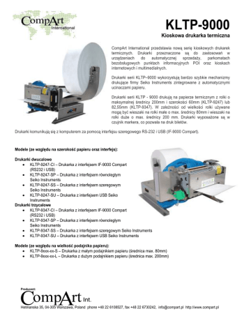 KLTP-9000 Kioskowa drukarka termiczna CompArt International przedstawia nową serię kioskowych drukarek termicznych. Drukarki przeznaczone są do zastosowań w urządzeniach do automatycznej sprzedaŜy, parkomatach bezobsługowych punktach informacyjnych POI oraz kioskach internetowych i multimedialnych. Drukarki serii KLTP–9000 wykorzystują bardzo szybkie mechanizmy drukujące firmy Seiko Instruments zintegrowane z automatycznymi ucinaczami papieru. Drukarki serii KLTP - 9000 drukują na papierze termicznym z rolki o maksymalnej średnicy 200mm i szerokości 60mm (KLTP-9247) lub 82,55mm (KLTP-9347). W zaleŜności od wielkości rolki uŜywane mogą być wieszaki na rolki małe o max. średnicy 80mm i wieszaki na rolki duŜe o max. średnicy 200 mm. Drukarki wyposaŜone są w czujnik markera, co pozwala na druk biletów. Drukarki komunikują się z komputerem za pomocą interfejsu szeregowego RS-232 i USB (IF-9000 Compart). Modele (ze względu na szerokość papieru oraz interfejs): Drukarki dwucalowe • KLTP-9247-CI – Drukarka z interfejsem IF-9000 Compart (RS232 i USB) • KLTP-9247-SP – Drukarka z interfejsem równoległym Seiko Instruments • KLTP-9247-SS – Drukarka z interfejsem szeregowym Seiko Instruments • KLTP-9247-SU – Drukarka z interfejsem USB Seiko Instruments Drukarki trzycalowe • KLTP-9347-CI – Drukarka z interfejsem IF-9000 Compart (RS232 i USB) • KLTP-9347-SP – Drukarka z interfejsem równoległym Seiko Instruments • KLTP-9347-SS – Drukarka z interfejsem szeregowym Seiko Instruments • KLTP-9347-SU – Drukarka z interfejsem USB Seiko Instruments Modele (ze względu na wielkość podajnika papieru): • KLTP-9xxx-xx-S – Drukarka z małym podajnikiem papieru (średnica max. 80mm) • KLTP-9xxx-xx-L – Drukarka z duŜym podajnikiem papieru (średnica max. 200mm) Producent: Hetmanska 35, 04-305 Warszawa, Poland phone +48 22 6108527, fax +48 22 6730242, [email protected] http://www.compart.pl Specyfikacja techniczna Drukarka KLTP-9247 CI Metoda druku Termiczny druk liniowy Compart IF9000 Seiko IF9001-01-E Seiko CAP-9247 Seiko CAP-9347 Seiko CAP-9247 Seiko CAP-9347 60mm / 2’ 82mm / 3’ 60mm / 2’ 82mm / 3’ 56mm 80mm 56mm 80mm 448 640 448 640 Mały podajnik: 80mm DuŜy podajnik: 200mm 120mm/s 100mm/s 250mm/s 200mm/s 8 X 9, 8 x 14, 10 x 24, 12 x 24 16x8, 16x16, 24x12, 24x24 36, 44, 56 52, 64, 80 37 53 TAK ucinanie częściowe lub całkowite, max. 30 ucięć na minutę Tak, Interleaved 2/5, EAN-13 RS232C i USB RS232C lub Parallel lub USB Producent interfejsu Mechanizm drukujący Szerokość papieru (mm) / (cale) Szerokość wydruku (mm) Ilość punktów w linii Średnica zewn. rolki (max.) Szybkość druku max. Konstrukcja znaku Ilość znaków w linii Grafika Automatyczny ucinacz papieru Kody kreskowe Interfejs Napięcie zasilające Temperatura pracy Temperatura przechowywania śywotność Wymiary w mm (szer. x gł. x wys.) Waga Certyfikaty i wymagania Gwarancja KLTP-9347 CI KLTP-9247 S KLTP-9347 S 24 VDC Od -20 0C do 60 0C, 10-80% RH Od -30 0C do 70 0C, 10-80% RH Głowica: 150 km lub więcej lub 150 mln pulsów Ucinacz: 1 mln ucięć 136 (szer.) x 120 (min. wys.) - 256 (max. wys.) 150 (min. głęb.) - 350 (max. głęb.) Ok. 0.7 - 0.9 kg CE, ROHS 2 lata 1 rok Opcjonalnie do drukarek KLTP-9000 z interfejsem Compart IF 9000: czujnik koniec papieru blisko. Producent: Hetmanska 35, 04-305 Warszawa, Poland phone +48 22 6108527, fax +48 22 6730242, [email protected] http://www.compart.pl