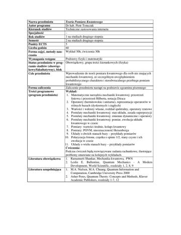 Nazwa przedmiotu Teoria Pomiaru Kwantowego Autor programu Dr