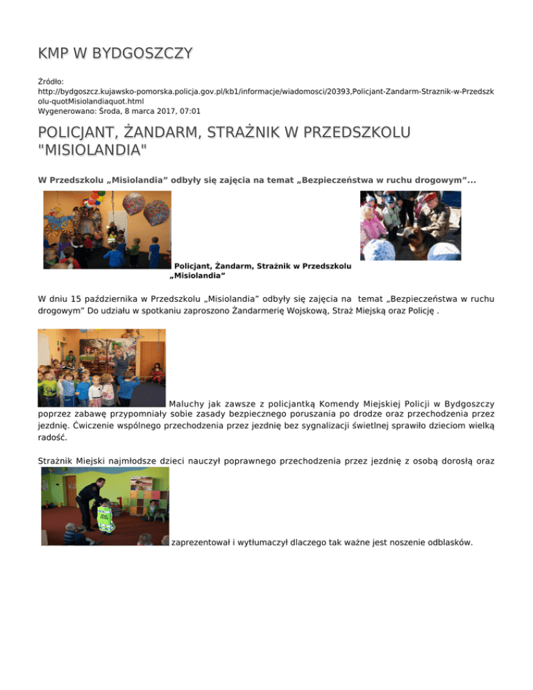 KMP W BYDGOSZCZY Źródło: http://bydgoszcz.kujawsko-pomorska.policja.gov.pl/kb1/informacje/wiadomosci/20393,Policjant-Zandarm-Straznik-w-Przedszk olu-quotMisiolandiaquot.html Wygenerowano: Środa, 8 marca 2017, 07:01 POLICJANT, ŻANDARM, STRAŻNIK W PRZEDSZKOLU "MISIOLANDIA" W Przedszkolu „Misiolandia” odbyły się zajęcia na temat „Bezpieczeństwa w ruchu drogowym”... Policjant, Żandarm, Strażnik w Przedszkolu „Misiolandia” W dniu 15 października w Przedszkolu „Misiolandia” odbyły się zajęcia na temat „Bezpieczeństwa w ruchu drogowym” Do udziału w spotkaniu zaproszono Żandarmerię Wojskową, Straż Miejską oraz Policję . Maluchy jak zawsze z policjantką Komendy Miejskiej Policji w Bydgoszczy poprzez zabawę przypomniały sobie zasady bezpiecznego poruszania po drodze oraz przechodzenia przez jezdnię. Ćwiczenie wspólnego przechodzenia przez jezdnię bez sygnalizacji świetlnej sprawiło dzieciom wielką radość. Strażnik Miejski najmłodsze dzieci nauczył poprawnego przechodzenia przez jezdnię z osobą dorosłą oraz zaprezentował i wytłumaczył dlaczego tak ważne jest noszenie odblasków. Żandarmeria Wojskowa zorganizowała prezentację sprzętu wojskowego, pokaz psa oraz radiowozu kryminalistycznego, w którym dzieci mogły odbić swoje odciski palców. Przedszkolaki z "Misiolandii" wiedzą jak być bezpiecznym na drodze. Autor: monikakarska Publikacja: monikakarska Ocena: 0/5 (0) Tweetnij