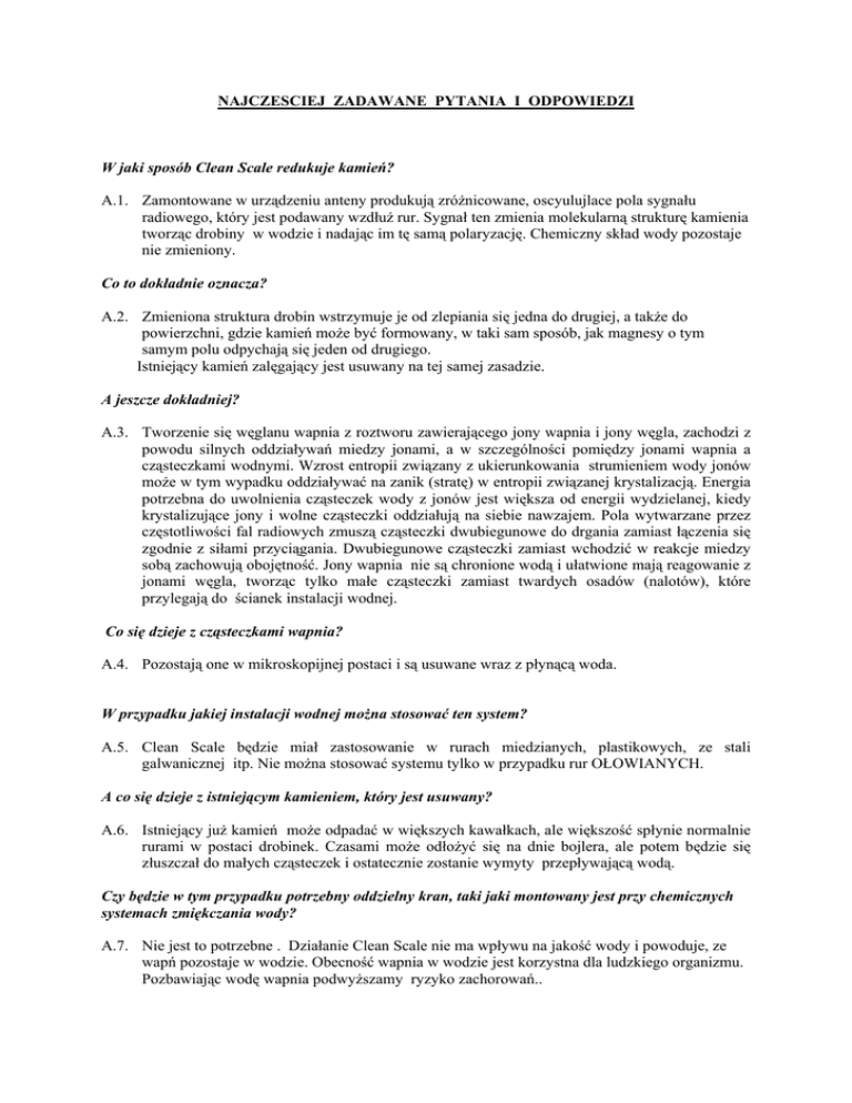NAJCZESCIEJ ZADAWANE PYTANIA I ODPOWIEDZI W jaki sposób Clean Scale redukuje kamień? A.1. Zamontowane w urządzeniu anteny produkują zróżnicowane, oscyulujlace pola sygnału radiowego, który jest podawany wzdłuż rur. Sygnał ten zmienia molekularną strukturę kamienia tworząc drobiny w wodzie i nadając im tę samą polaryzację. Chemiczny skład wody pozostaje nie zmieniony. Co to dokładnie oznacza? A.2. Zmieniona struktura drobin wstrzymuje je od zlepiania się jedna do drugiej, a także do powierzchni, gdzie kamień może być formowany, w taki sam sposób, jak magnesy o tym samym polu odpychają się jeden od drugiego. Istniejący kamień zalęgający jest usuwany na tej samej zasadzie. A jeszcze dokładniej? A.3. Tworzenie się węglanu wapnia z roztworu zawierającego jony wapnia i jony węgla, zachodzi z powodu silnych oddziaływań miedzy jonami, a w szczególności pomiędzy jonami wapnia a cząsteczkami wodnymi. Wzrost entropii związany z ukierunkowania strumieniem wody jonów może w tym wypadku oddziaływać na zanik (stratę) w entropii związanej krystalizacją. Energia potrzebna do uwolnienia cząsteczek wody z jonów jest większa od energii wydzielanej, kiedy krystalizujące jony i wolne cząsteczki oddziałują na siebie nawzajem. Pola wytwarzane przez częstotliwości fal radiowych zmuszą cząsteczki dwubiegunowe do drgania zamiast łączenia się zgodnie z siłami przyciągania. Dwubiegunowe cząsteczki zamiast wchodzić w reakcje miedzy sobą zachowują obojętność. Jony wapnia nie są chronione wodą i ułatwione mają reagowanie z jonami węgla, tworząc tylko małe cząsteczki zamiast twardych osadów (nalotów), które przylegają do ścianek instalacji wodnej. Co się dzieje z cząsteczkami wapnia? A.4. Pozostają one w mikroskopijnej postaci i są usuwane wraz z płynącą woda. W przypadku jakiej instalacji wodnej można stosować ten system? A.5. Clean Scale będzie miał zastosowanie w rurach miedzianych, plastikowych, ze stali galwanicznej itp. Nie można stosować systemu tylko w przypadku rur OŁOWIANYCH. A co się dzieje z istniejącym kamieniem, który jest usuwany? A.6. Istniejący już kamień może odpadać w większych kawałkach, ale większość spłynie normalnie rurami w postaci drobinek. Czasami może odłożyć się na dnie bojlera, ale potem będzie się złuszczał do małych cząsteczek i ostatecznie zostanie wymyty przepływającą wodą. Czy będzie w tym przypadku potrzebny oddzielny kran, taki jaki montowany jest przy chemicznych systemach zmiękczania wody? A.7. Nie jest to potrzebne . Działanie Clean Scale nie ma wpływu na jakość wody i powoduje, ze wapń pozostaje w wodzie. Obecność wapnia w wodzie jest korzystna dla ludzkiego organizmu. Pozbawiając wodę wapnia podwyższamy ryzyko zachorowań.. Kiedy i w jaki sposób zauważalna stanie się różnica? A.8. Przeciętny system instalacji wodnej może być pozbawiony kamienia w okresie do 6 tygodni. Pierwszym widocznym znakiem, będzie wrażenie, ze woda jest miękka . Kamień wokół kranów i prysznica stopniowo się zmiękcza i jest łatwiejszy do usunięcia. Słuchawka prysznicowa ma lepszy przepływ. Czy po zamontowanie system wymaga obsługi? A.9. Poza okresowym sprawdzeniem polegającym na oględzinach czy diody świetlne są zapalone nic więcej nie trzeba robić. Urządzenia są tak zaprojektowane, aby pracowały bez przerwy przez nieokreśloną ilość lat - bez ograniczeń. Gdzie najlepiej zamontować urządzenie? Czy ma znaczenie pionowe lub poziome jego umiejscowienie? A.10. Można zamontować, w dowolnej konfiguracji i dowolnym miejscu . Po każdej stronie głównego zaworu doprowadzającego wodę. Czy anteny mogą być założone na nierównych rurach lub na wygiętych rurach? A.11. Mogą one być zamontowane wokół każdego typu rury nawet w kątach i łukach. Rozumiem, ze system korzysta z fal magnetycznych, czy będzie to wpływało na moje pozostałe urządzenie domowe? A.12. Urządzenie rzeczywiście transmituje bardzo niskie fale radiowe poniżej 5 kHz, których częstotliwości są o wiele niższe niż zakresy na których pracują radia i inne urządzenia audiowizualne. Komputer w urządzeniu jest co prawda bardzo szybki i pracuje z częstotliwością 16 MHz i jeżeli urządzenie jest umieszczone blisko radia działającego na falach średnich mogą zachodzić małe zakłócenia. Ale problem ten jest tylko teoretyczny ponieważ rury, na których montuje się Clean Scale są zwykle oddalone od takich miejsc. Jaka część rury powinna być przykryta antenami? A.13. Przeciętnie 10 owinięć powinno wystarczyć, ale należy owinąć je mocno wokół rury i bardzo ściśle obok siebie . Generalnie zaleca się 15 owinięć. Jaki jest koszt egerii związany z pracą tego urządzenia? A.14. Urządzenie zużywa bardzo mało energii elektrycznej (ok. 2 W), co daje rocznie koszt nieprzekraczający 20 zl. Dlaczego korzystając z tego urządzenia zwiększa się wydajność pienienia się mydła i szamponu? A.15. Woda poddana działaniu systemu Clean Scale może być uznawana jako woda miękka, a tym samym będzie się zużywało mniej szamponu i mydła niż przedtem. Jeżeli będziesz zużywał taką samą ilość tych środków co poprzednio - będziesz uzyskiwał więcej piany. Czy każdy, kto żyje na terenie, gdzie występuje twarda woda powinien stosować Clean Scale? A.16. Tak. Dlaczego Clean Scale uznawane jest jako lepsze od magnetyzerów? A.17. Magnetyzer nigdy nie będzie taki efektywny. W różnych częściach kraju, w zależności od jakości wody potrzebne są różne ustawienia sygnałów urządzenia , żeby uzyskać najlepszy efekt. Temperatura wody również wpływa na działanie urządzenia. Clean Scale używa unikalnej, automatycznie zmieniającej się częstotliwości, co pomaga uporać się z tym problemem. Urządzenie wytwarza sygnały elektro-magnetyczne obejmujące swoim zasięgiem wszystkie znane zakresy fal radiowych, które wp