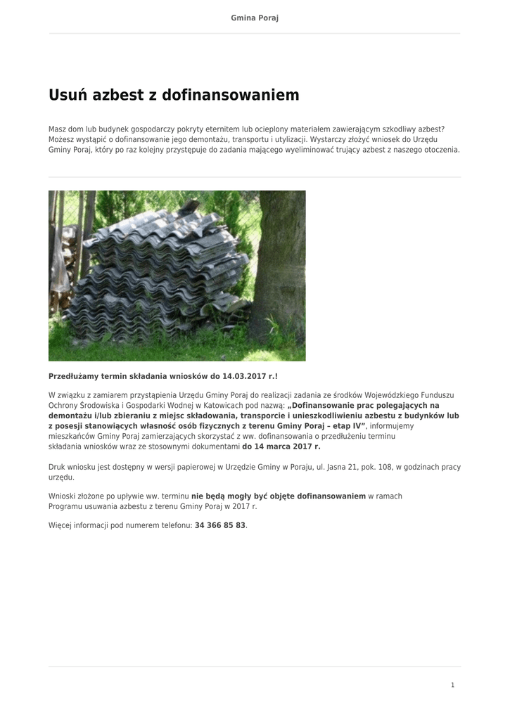 Gmina Poraj Usuń azbest z dofinansowaniem Masz dom lub budynek gospodarczy pokryty eternitem lub ocieplony materiałem zawierającym szkodliwy azbest? Możesz wystąpić o dofinansowanie jego demontażu, transportu i utylizacji. Wystarczy złożyć wniosek do Urzędu Gminy Poraj, który po raz kolejny przystępuje do zadania mającego wyeliminować trujący azbest z naszego otoczenia. Przedłużamy termin składania wniosków do 14.03.2017 r.! W związku z zamiarem przystąpienia Urzędu Gminy Poraj do realizacji zadania ze środków Wojewódzkiego Funduszu Ochrony Środowiska i Gospodarki Wodnej w Katowicach pod nazwą: „Dofinansowanie prac polegających na demontażu i/lub zbieraniu z miejsc składowania, transporcie i unieszkodliwieniu azbestu z budynków lub z posesji stanowiących własność osób fizycznych z terenu Gminy Poraj – etap IV”, informujemy mieszkańców Gminy Poraj zamierzających skorzystać z ww. dofinansowania o przedłużeniu terminu składania wniosków wraz ze stosownymi dokumentami do 14 marca 2017 r. Druk wniosku jest dostępny w wersji papierowej w Urzędzie Gminy w Poraju, ul. Jasna 21, pok. 108, w godzinach pracy urzędu. Wnioski złożone po upływie ww. terminu nie będą mogły być objęte dofinansowaniem w ramach Programu usuwania azbestu z terenu Gminy Poraj w 2017 r. Więcej informacji pod numerem telefonu: 34 366 85 83. 1
