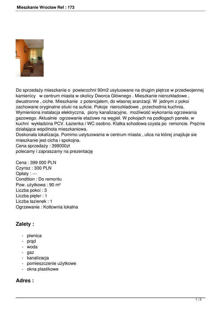 Mieszkanie Wrocław Ref : 173 Do sprzedaży mieszkanie o powierzchni 90m2 usytuowane na drugim piętrze w przedwojennej kamienicy w centrum miasta w okolicy Dworca Głównego . Mieszkanie nierozkładowe , dwustronne , ciche. Mieszkanie z potencjałem, do własnej aranżacji. W jednym z pokoi zachowane oryginalne stiuki na suficie. Pokoje nierozkładowe , przechodnia kuchnia. Wymieniona instalacja elektryczna, piony kanalizacyjne, możliwość wykonania ogrzewania gazowego. Aktualnie ogrzewanie etażowe na węgiel. W pokojach na podłogach panele, w kuchni wykładzina PCV. Łazienka i WC osobno. Klatka schodowa czysta po remoncie. Prężnie działająca wspólnota mieszkaniowa. Doskonała lokalizacja. Pomimo ustytuowania w centrum miasta , ulica na której znajduje sie mieszkanie jest cicha i spokojna. Cena sprzedaży : 399000zł polecamy i zapraszamy na prezentację Cena : 399 000 PLN Czynsz : 300 PLN Opłaty : --Condition : Do remontu Pow. użytkowa : 90 m² Liczba pokoi : 3 Liczba pięter : 1 Liczba łazienek : 1 Ogrzewanie : Kotłownia lokalna Zalety : - piwnica prąd woda gaz kanalizacja pomieszczenie użytkowe okna plastikowe Adres : 1/2 Mieszkanie Wrocław Ref : 173 Gwarna, WROCłAW Obszar : Stare Miasto http://www.ctpnieruchomosci.pl/wyszukiwarka-ofert/87-mieszkanie-w-centrum?format=pdf 2/2
