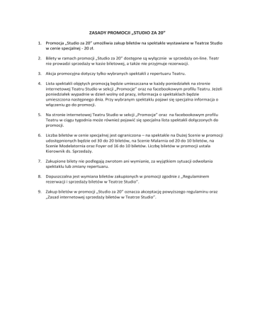 ZASADY PROMOCJI „STUDIO ZA 20” 1. Promocja „Studio za 20” umożliwia zakup biletów na spektakle wystawiane w Teatrze Studio w cenie specjalnej - 20 zł. 2. Bilety w ramach promocji „Studio za 20” dostępne są wyłącznie w sprzedaży on-line. Teatr nie prowadzi sprzedaży w kasie biletowej, a także nie przyjmuje rezerwacji. 3. Akcja promocyjna dotyczy tylko wybranych spektakli z repertuaru Teatru. 4. Lista spektakli objętych promocją będzie umieszczana w każdy poniedziałek na stronie internetowej Teatru Studio w sekcji „Promocje” oraz na facebookowym profilu Teatru. Jeżeli poniedziałek wypadnie w dzień wolny od pracy, informacja o spektaklach będzie umieszczona następnego dnia. Przy wybranym spektaklu pojawi się specjalna informacja o włączeniu go do promocji. 5. Na stronie internetowej Teatru Studio w sekcji „Promocje” oraz na facebookowym profilu Teatru w ciągu tygodnia może również pojawić się specjalna lista spektakli dołączonych do promocji. 6. Liczba biletów w cenie specjalnej jest ograniczona – na spektakle na Dużej Scenie w promocji udostępnionych będzie od 30 do 20 biletów, na Scenie Malarnia od 20 do 10 biletów, na Scenie Modelatornia oraz Foyer od 16 do 10 biletów. Liczbę biletów w promocji ustala Kierownik ds. Sprzedaży. 7. Zakupione bilety nie podlegają zwrotom ani wymianie, za wyjątkiem sytuacji odwołania spektaklu lub zmiany repertuaru. 8. Dopuszczalna jest wymiana biletów zakupionych w promocji zgodnie z „Regulaminem rezerwacji i sprzedaży biletów w Teatrze Studio”. 9. Zakup biletów w promocji „Studio za 20” oznacza akceptację powyższego regulaminu oraz „Zasad internetowej sprzedaży biletów w Teatrze Studio”.